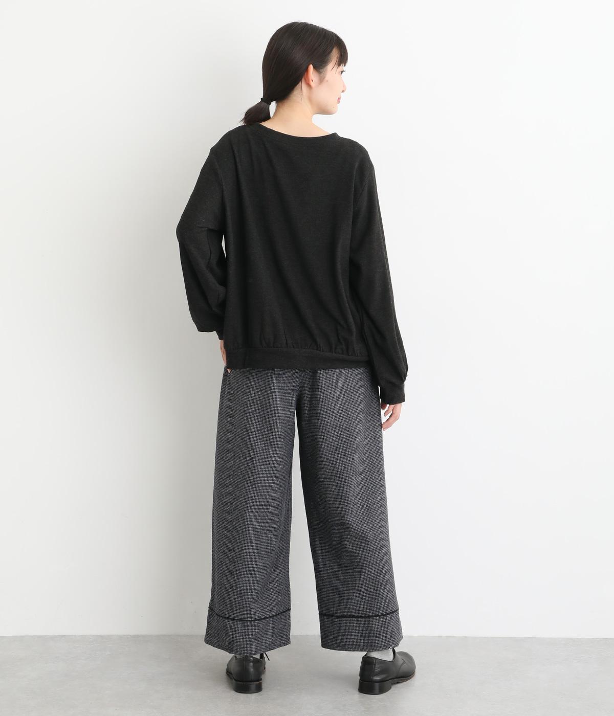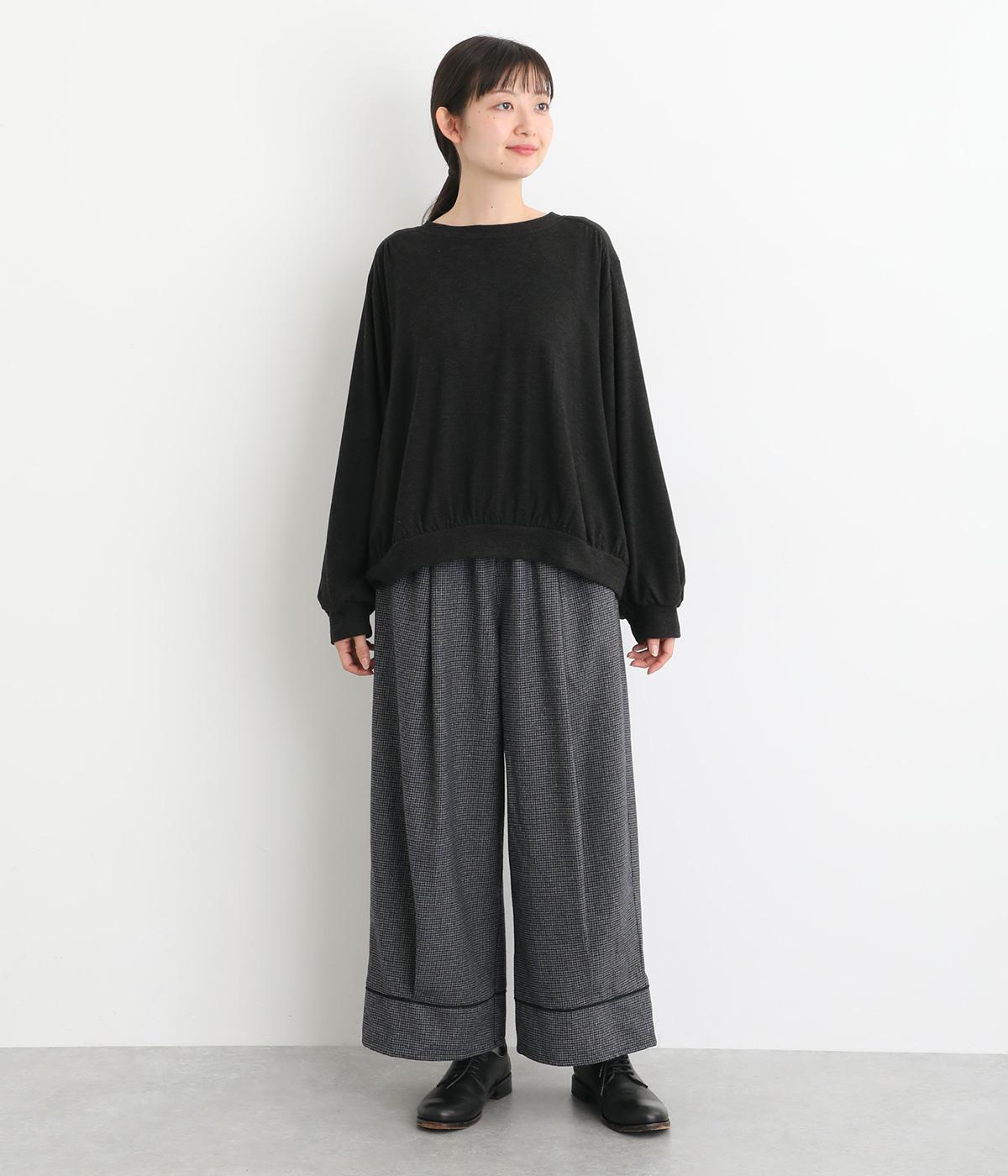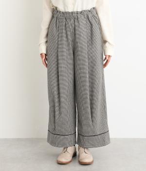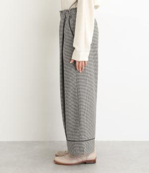 前ウエスト下と裾に繋がるようなタックを施し、ドレープを映えさせたパンツ。ワイドシルエットが体のラインをカバーしながら、こなれたムードを運びます。裾の切り替えラインとパイピングがアクセントに。ウエストにはゴムと紐をぐるりと通し、フィット感を高めました。