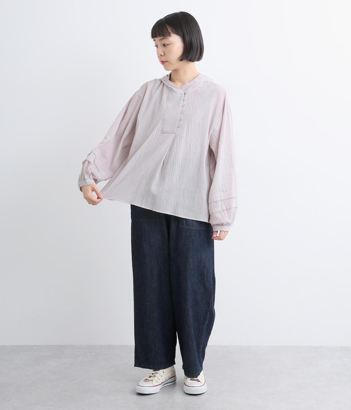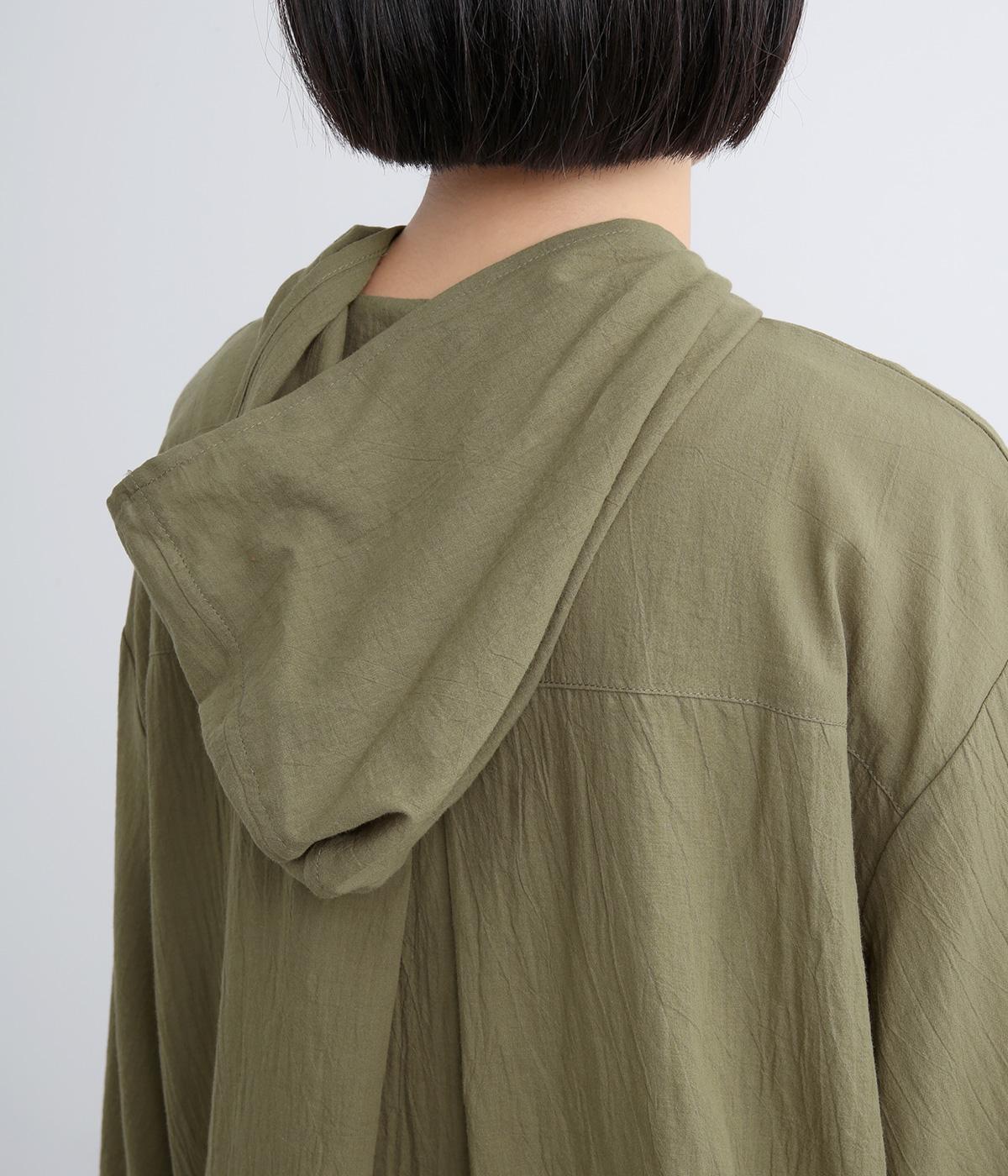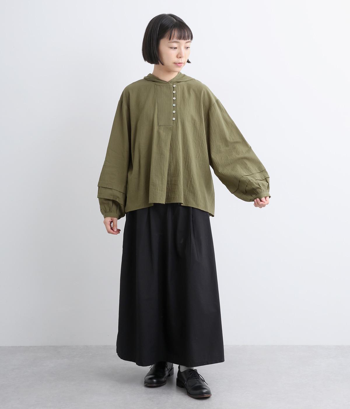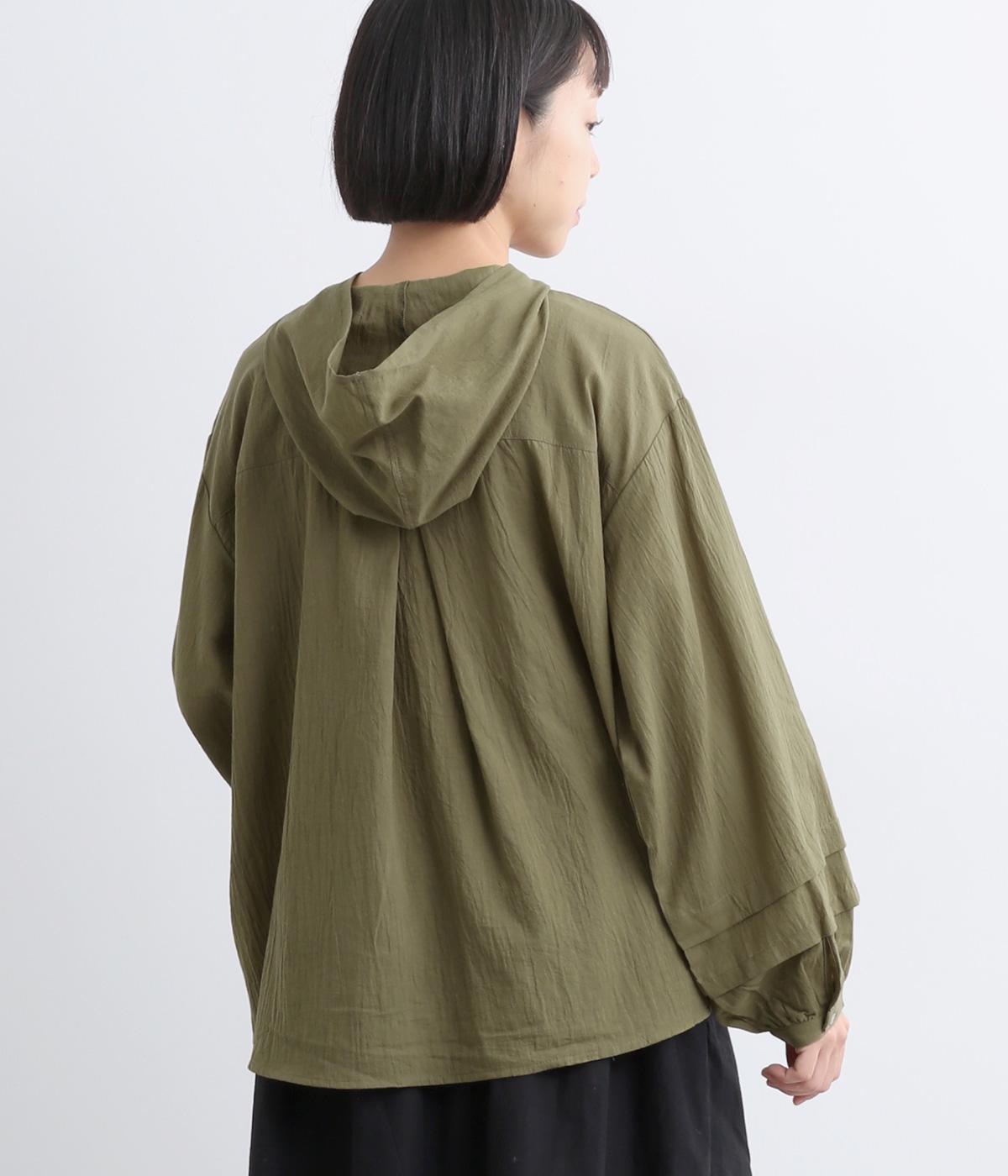 フードでカジュアル感がありながら、袖のぽわんとしたシルエットや施されたプリーツがかわいらしさを演出します。胸元のループボタンもどこかレトロな雰囲気に。こなれ感のある一枚に仕上がっています。