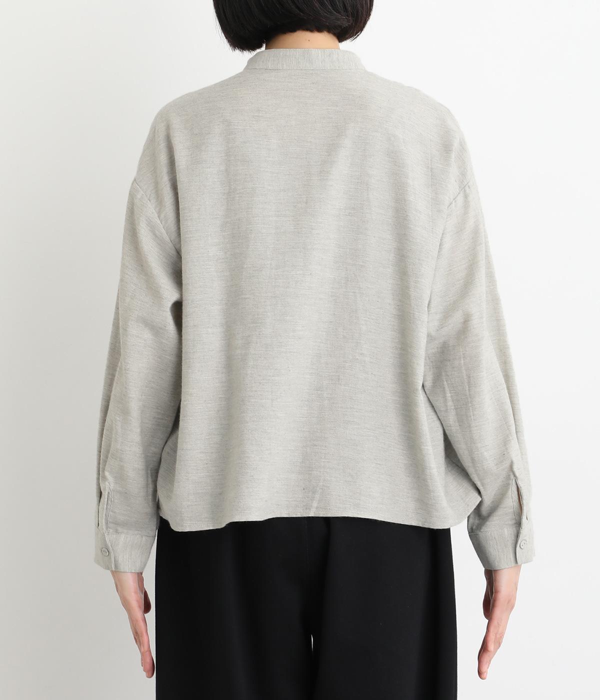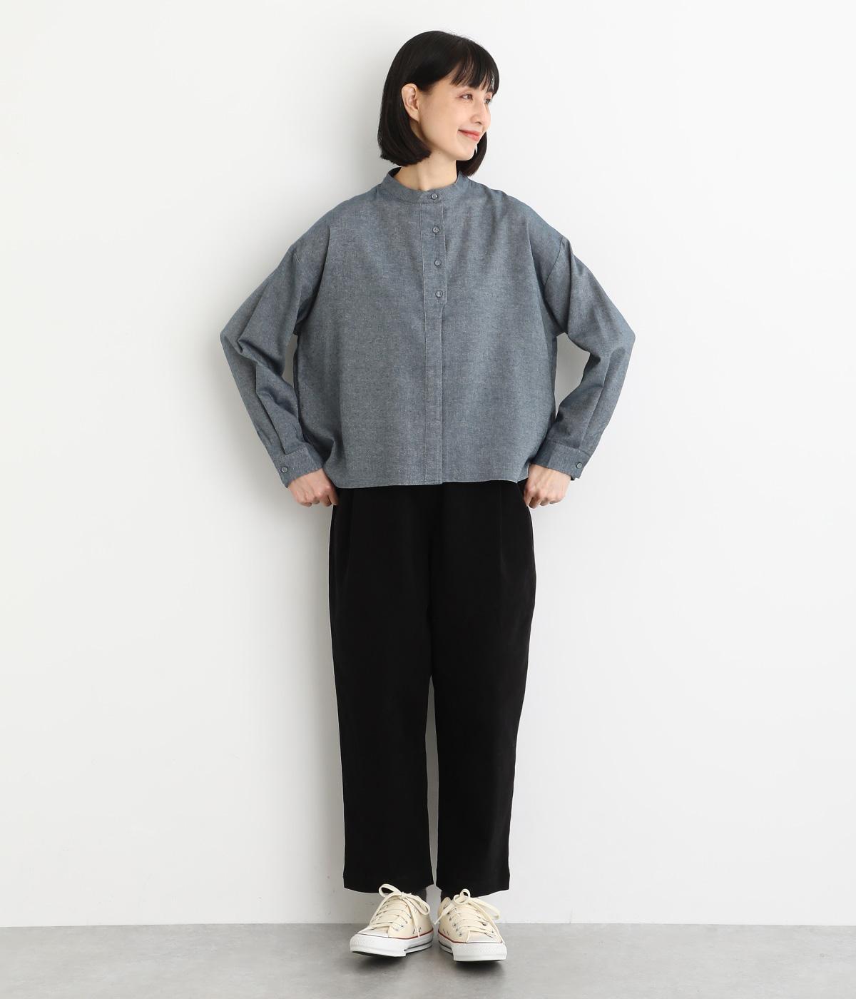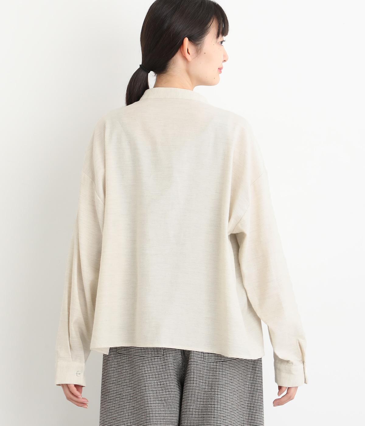 大人の魅力を惹きたてるシンプルさが魅力のバンドカラーブラウス。ゆったりとした身幅とコンパクトな着丈のバランスが◎です。前立ては胸から下を比翼仕立てにし、より品のある表情に仕上げました。