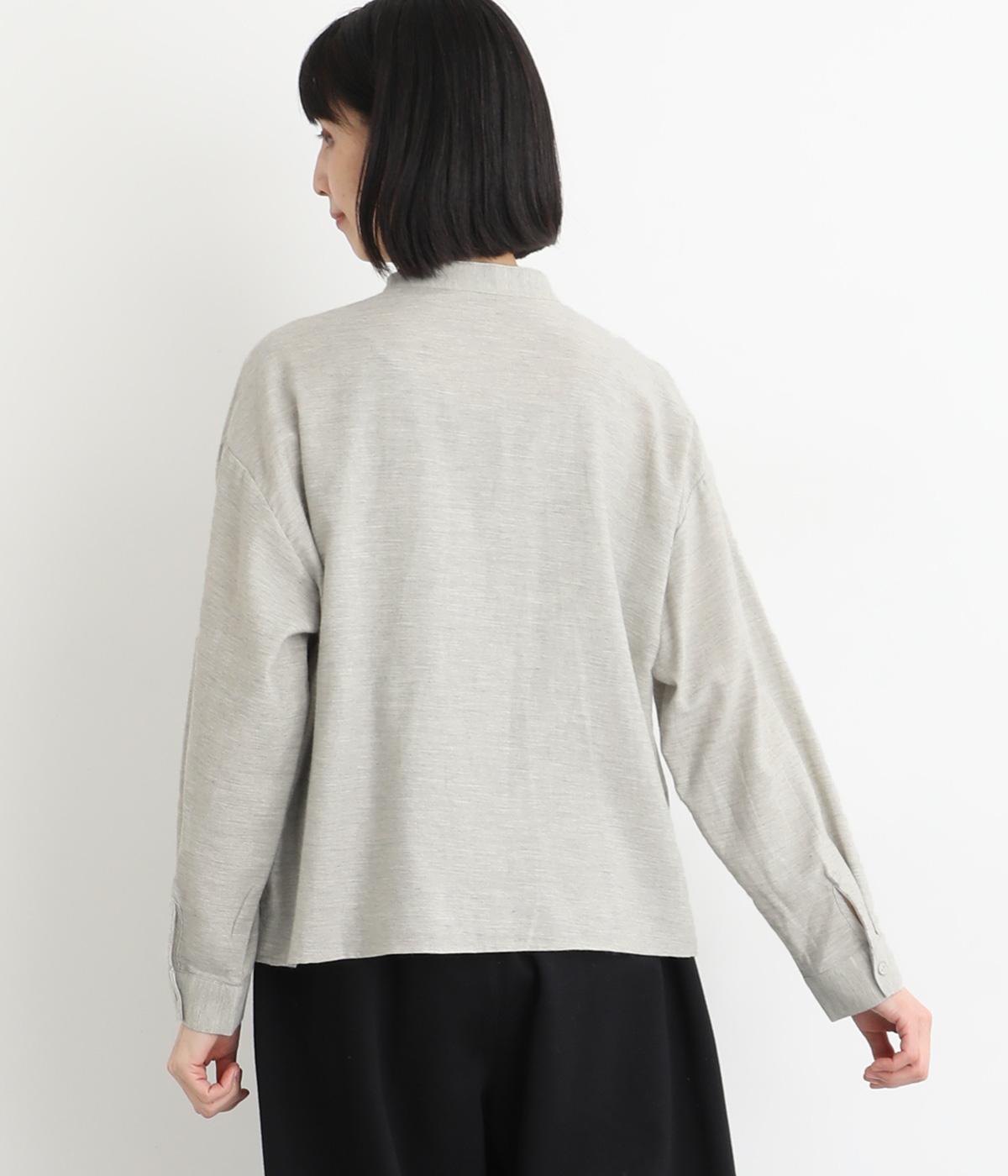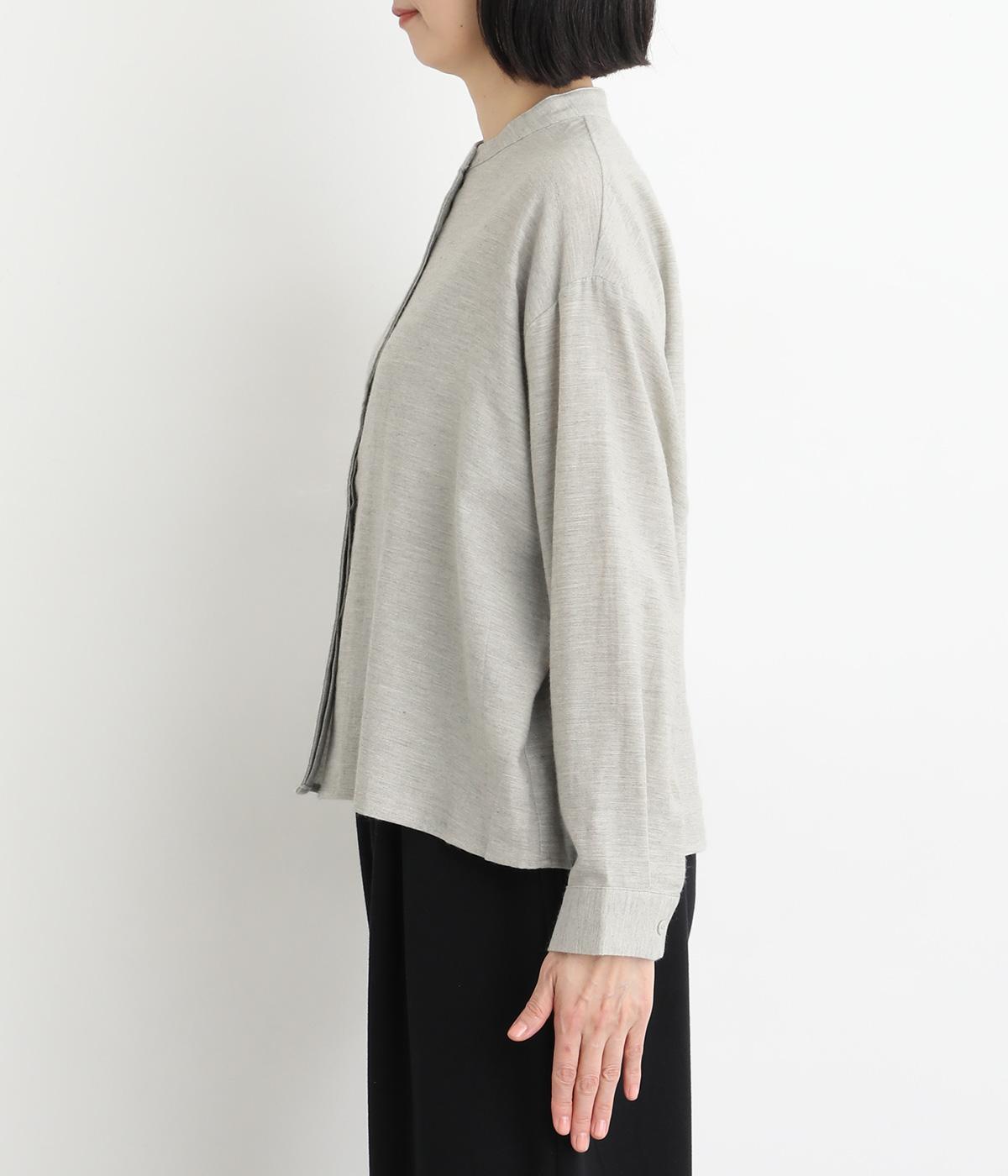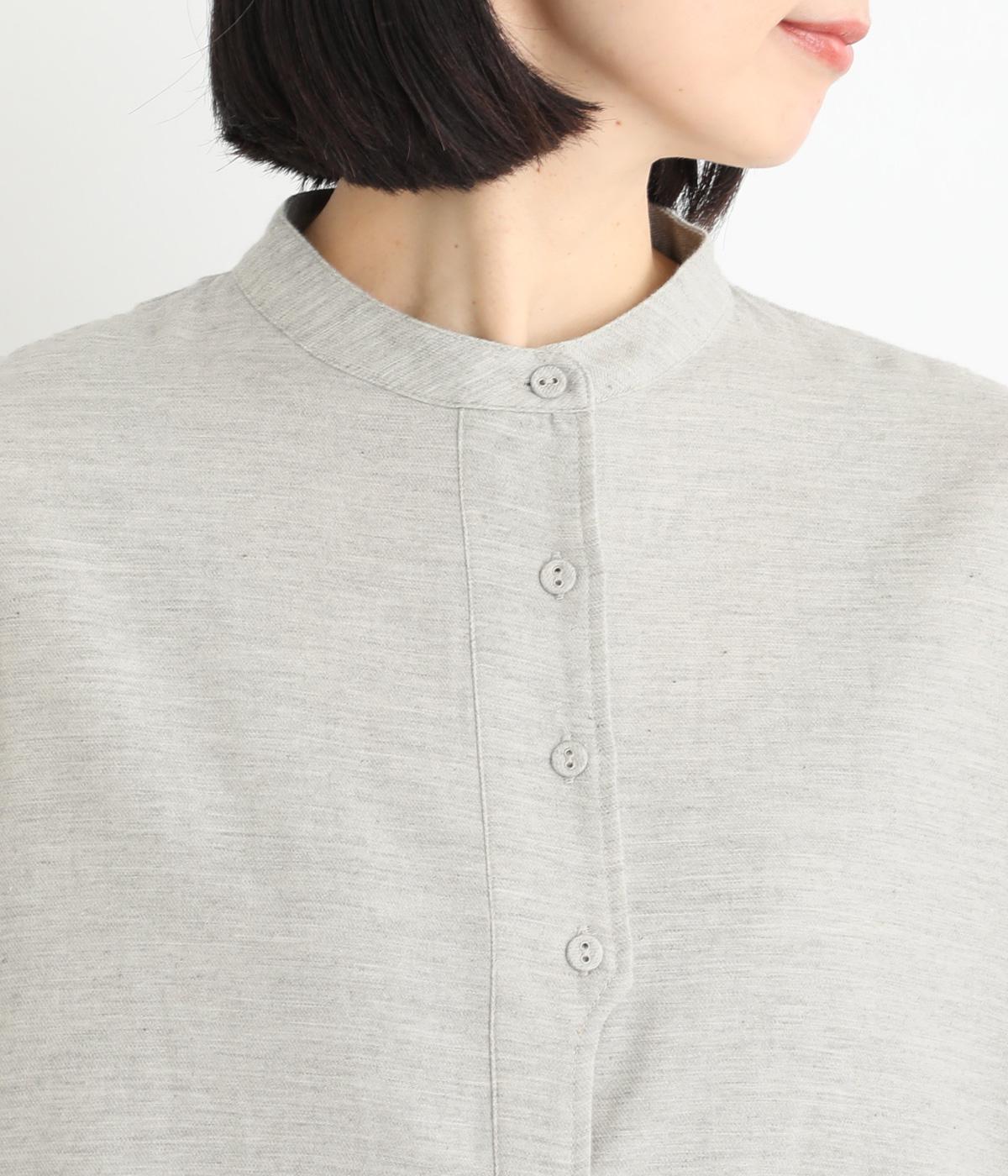 大人の魅力を惹きたてるシンプルさが魅力のバンドカラーブラウス。ゆったりとした身幅とコンパクトな着丈のバランスが◎です。前立ては胸から下を比翼仕立てにし、より品のある表情に仕上げました。