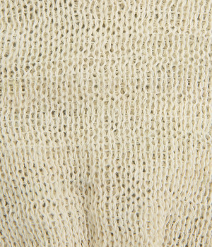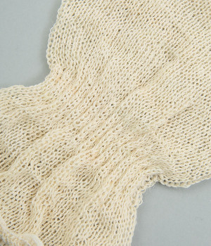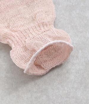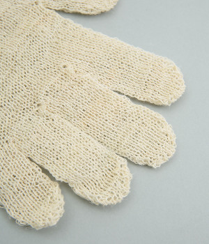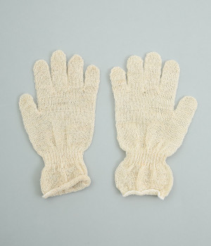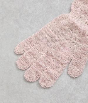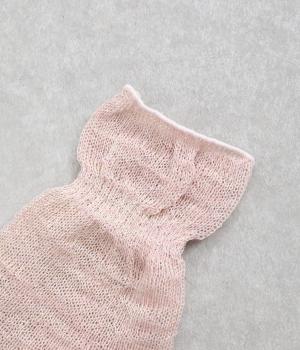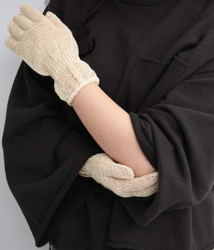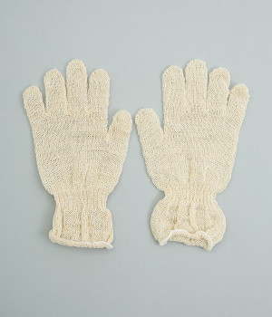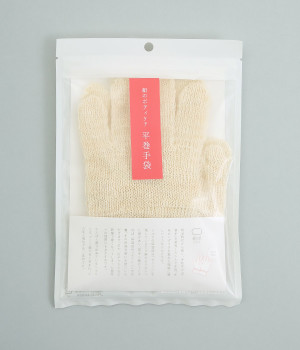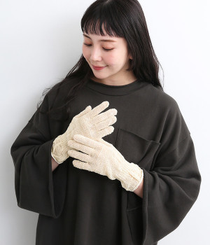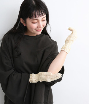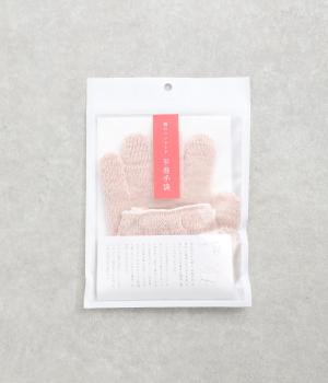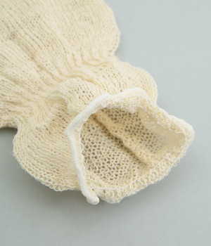 生地のくずワタを集めた、環境にやさしいエコなシルクを採用。保湿成分を残しているので麻のようなシャリ感があり、両手につけてこすることでその成分が付着し乾燥対策にもなります。
