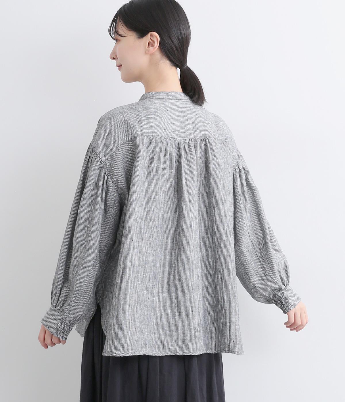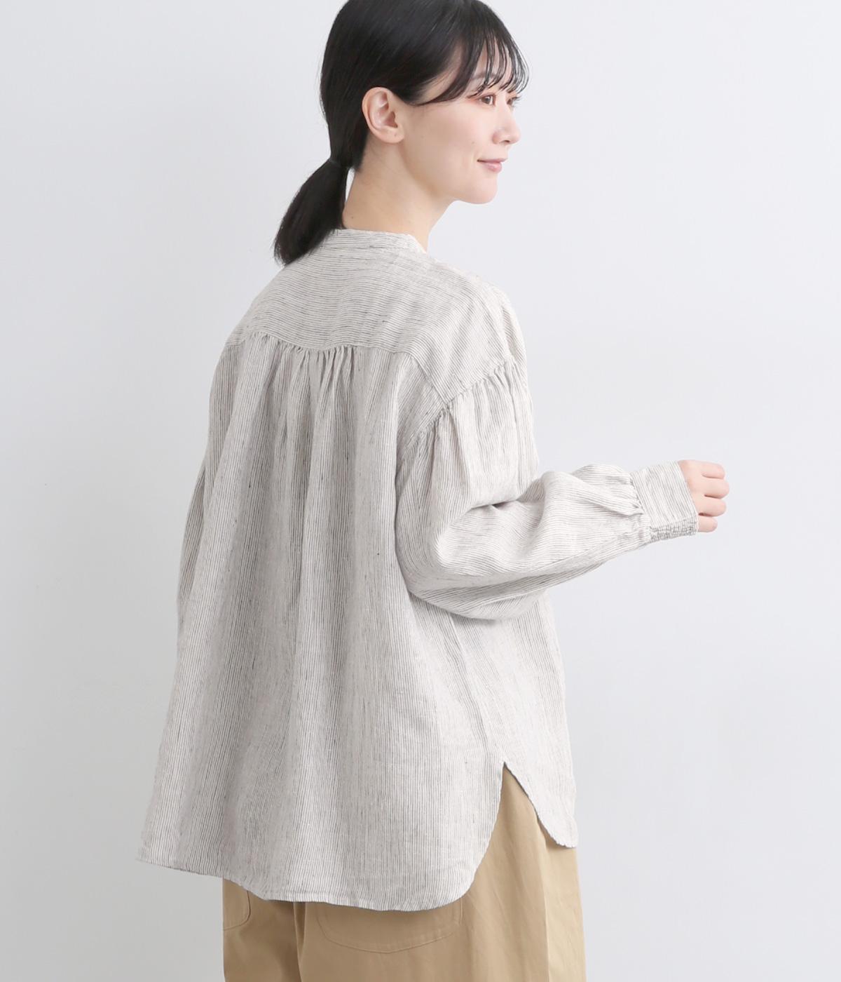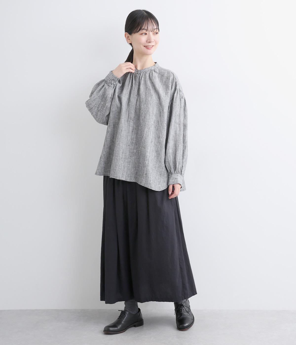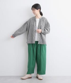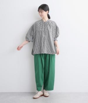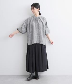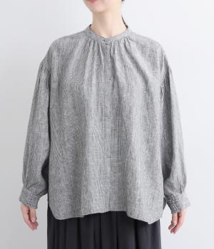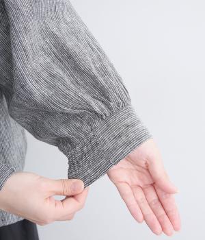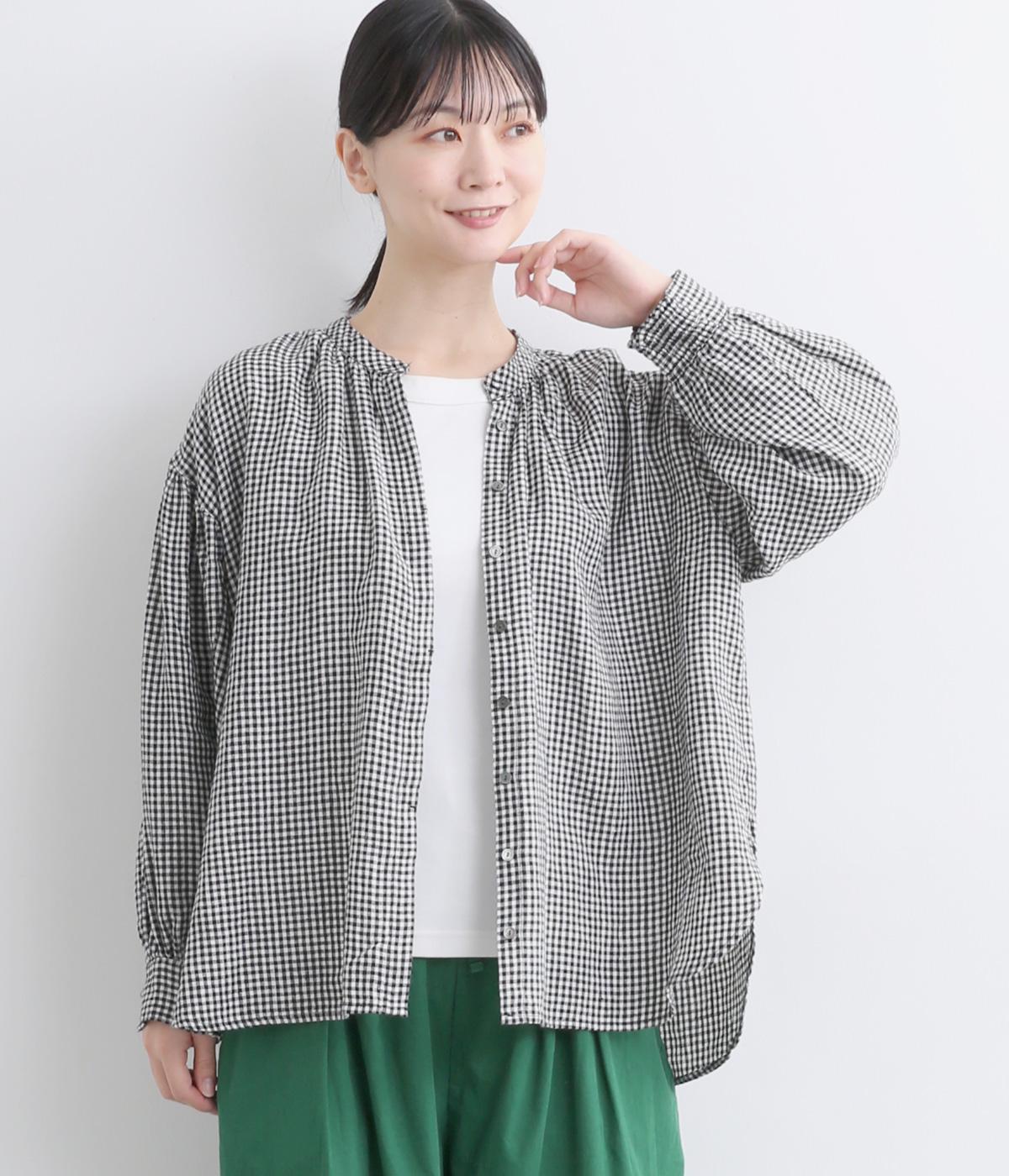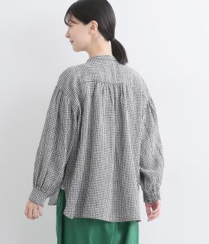 随所にギャザーを入れて全体的にゆとりを持たせた、デイリースタイルに取り入れやすいナチュラル素材の柄シャツです。袖口は部分的にゴムシャーリングでたくし上げのアレンジも◎。ラウンドヘムの前あきで羽織りスタイルもさまになります。