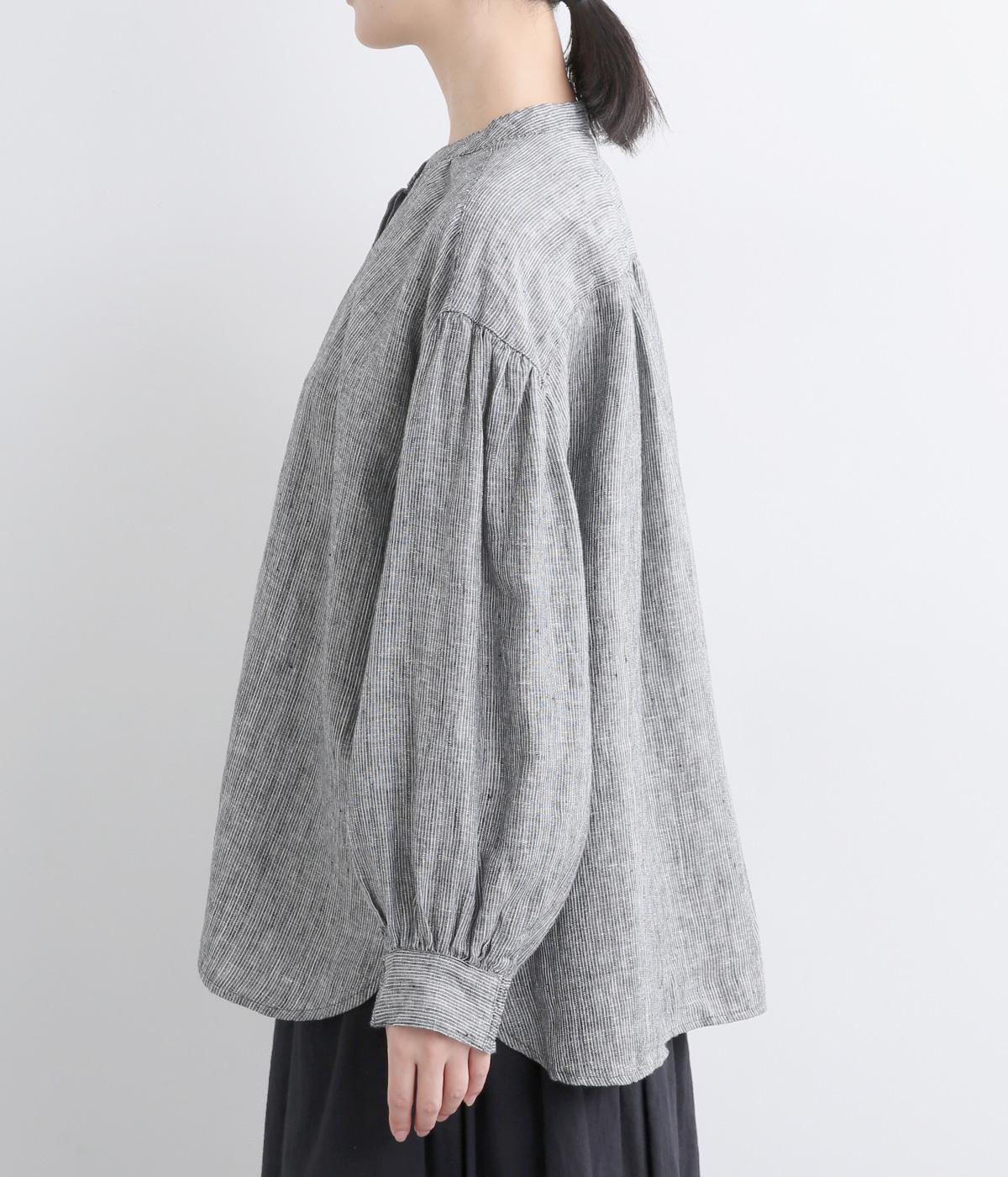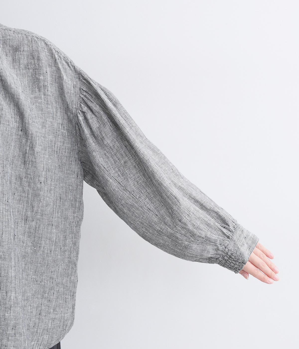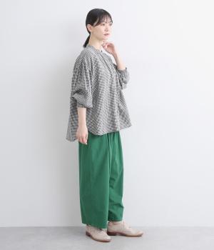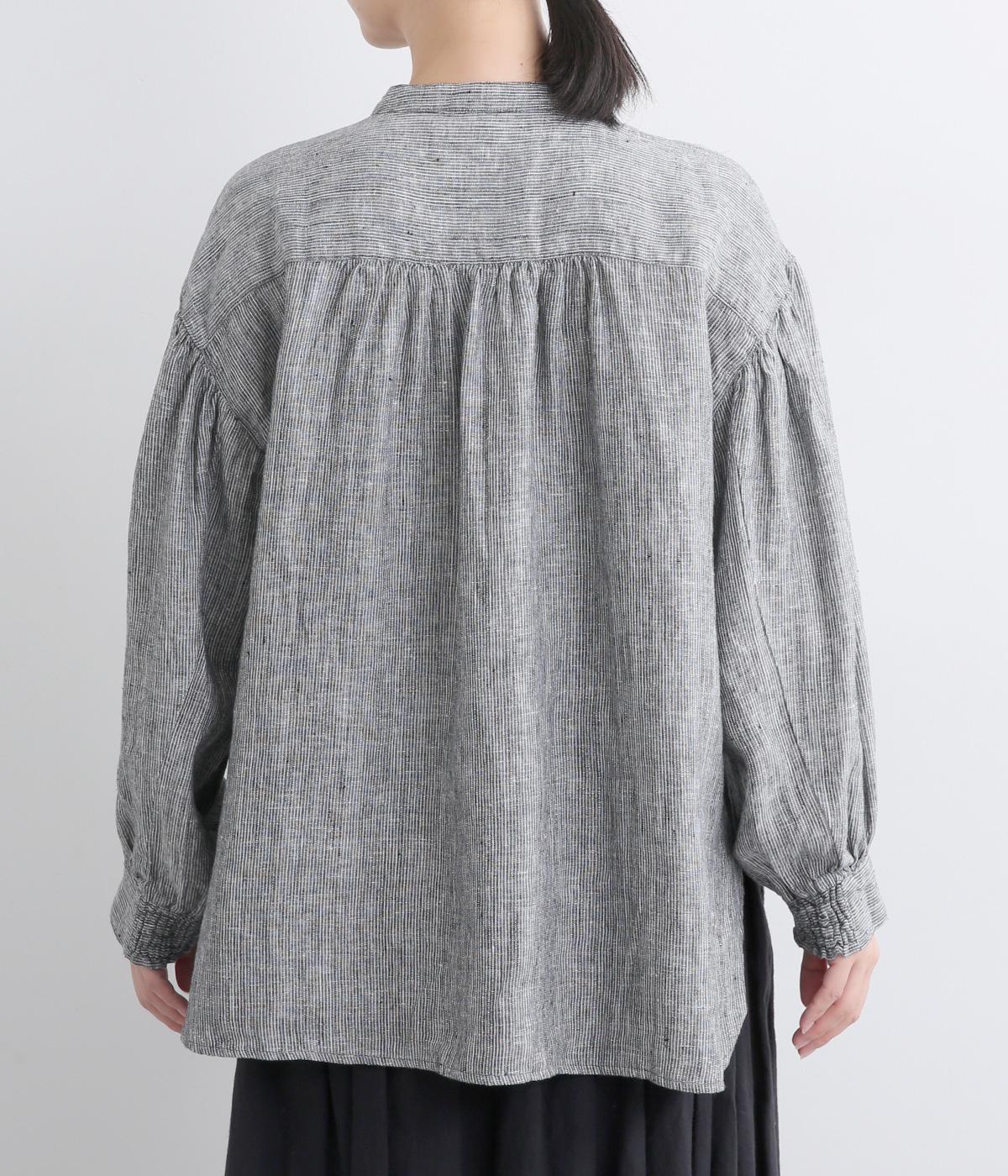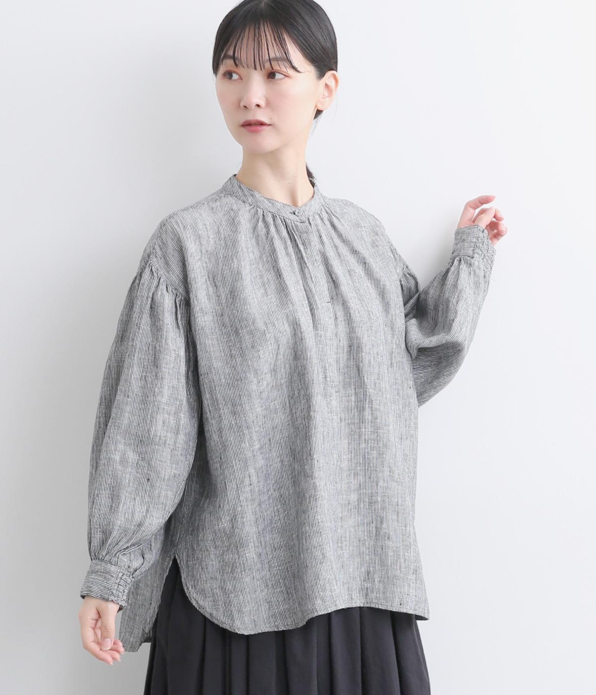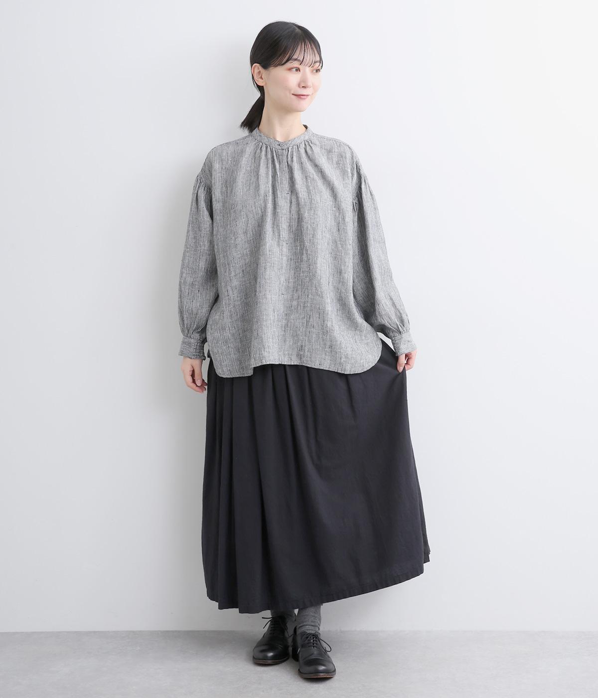 随所にギャザーを入れて全体的にゆとりを持たせた、デイリースタイルに取り入れやすいナチュラル素材の柄シャツです。袖口は部分的にゴムシャーリングでたくし上げのアレンジも◎。ラウンドヘムの前あきで羽織りスタイルもさまになります。