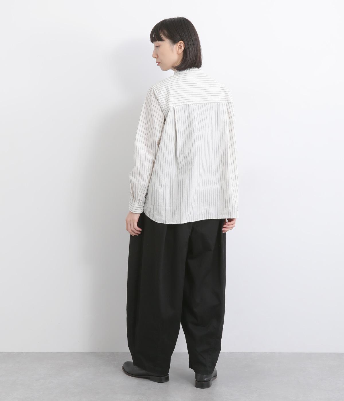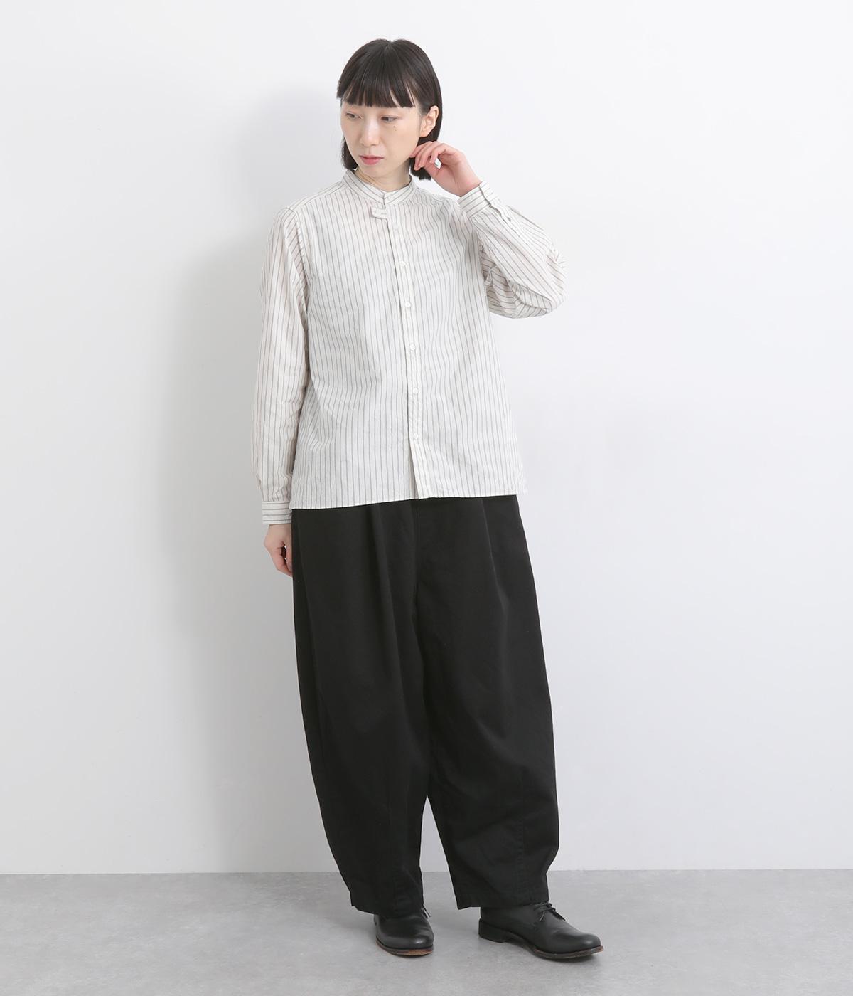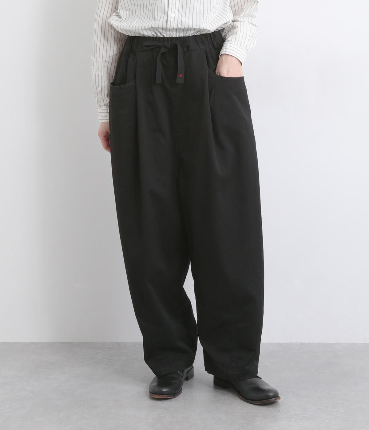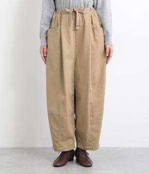 ウエストの大きなタックでふっくらと立体的なシルエットが特徴。裾ダーツで全体をすっきりまとめているのでスタイリングしやすく、こなれた雰囲気が魅力。ウエストは総ゴムのリラックス仕様で、アウト紐がポイントになっています。