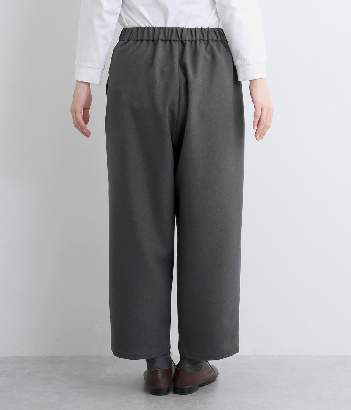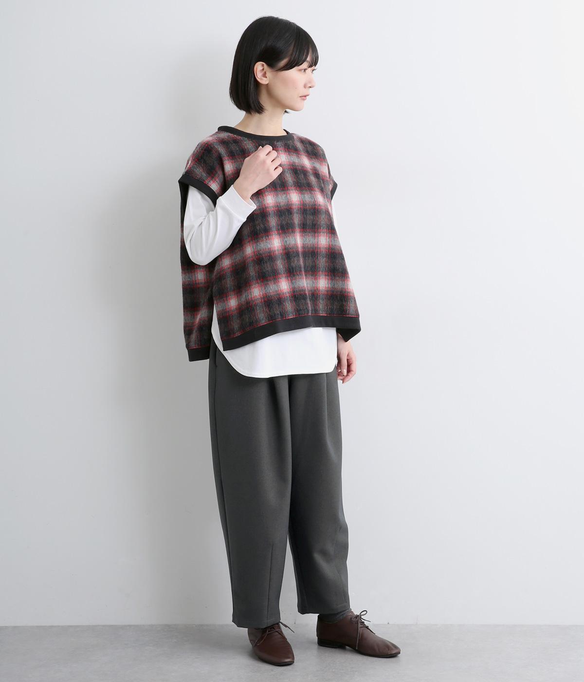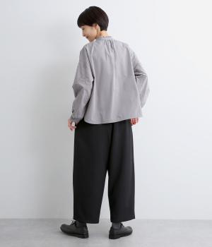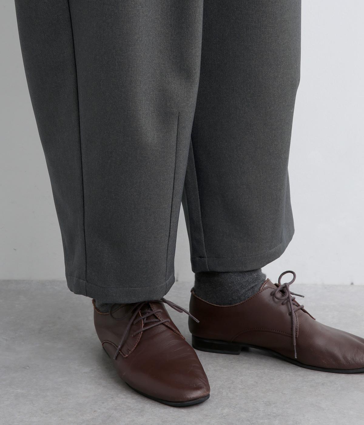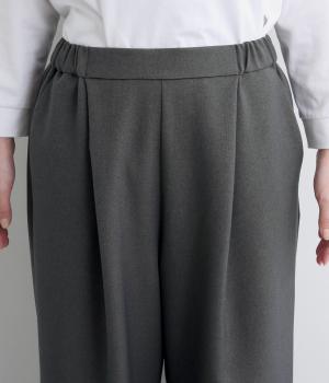 ウエストにタックを入れて自然な立体感をつけ、裾ダーツで全体をすっきりまとめました。トップスインもきまる前ベルト仕様で、サイドから後ろにかけてゴムを入れているのでお腹まわりの窮屈さも軽減。レースアップシューズでクラシカルな装いも◎。