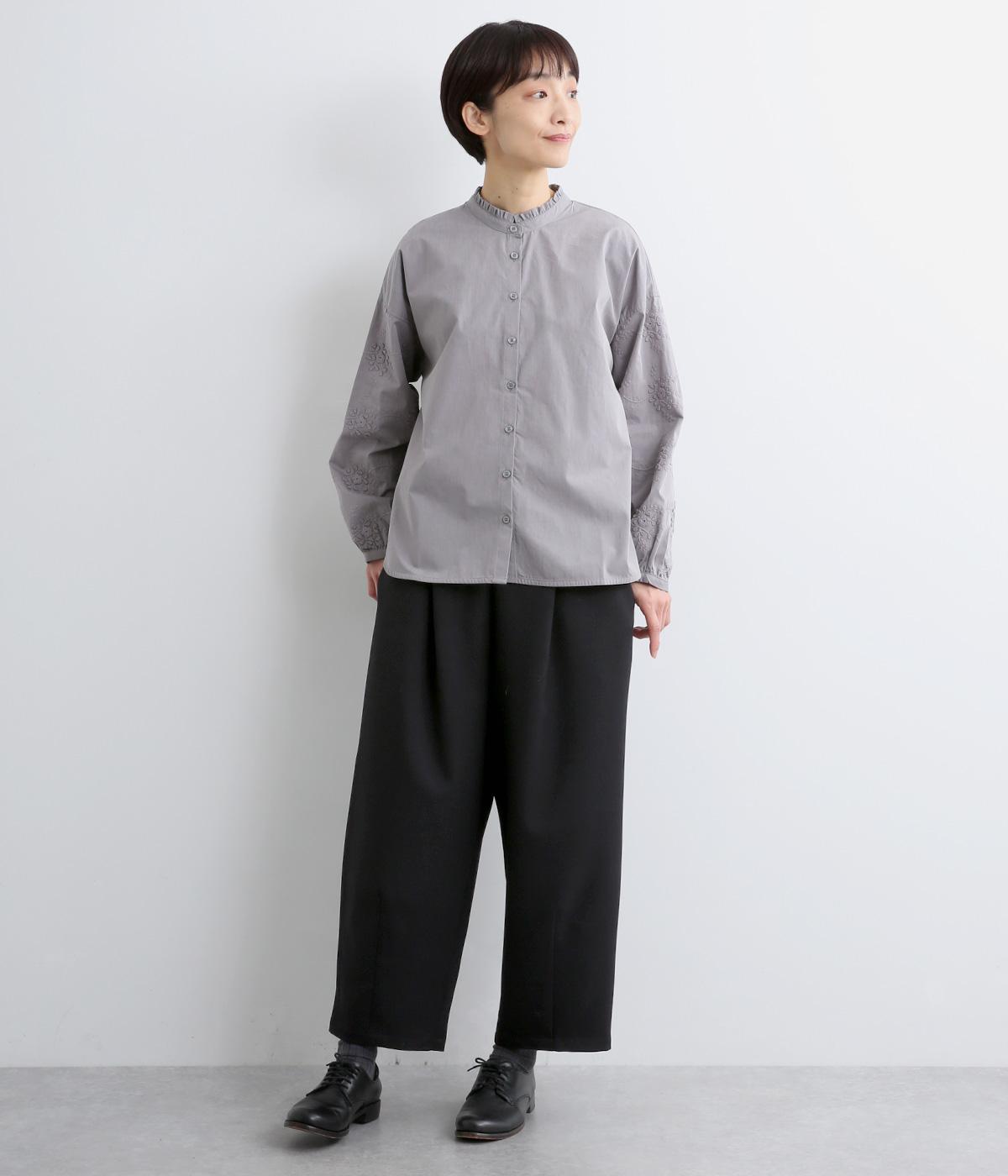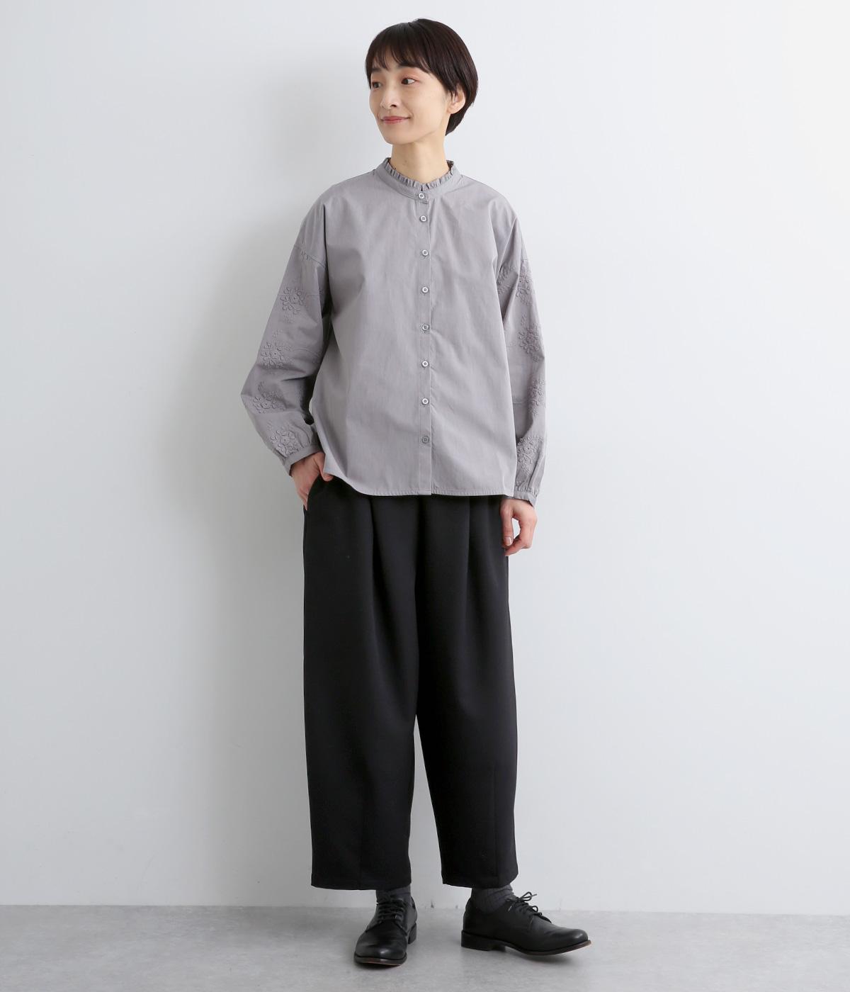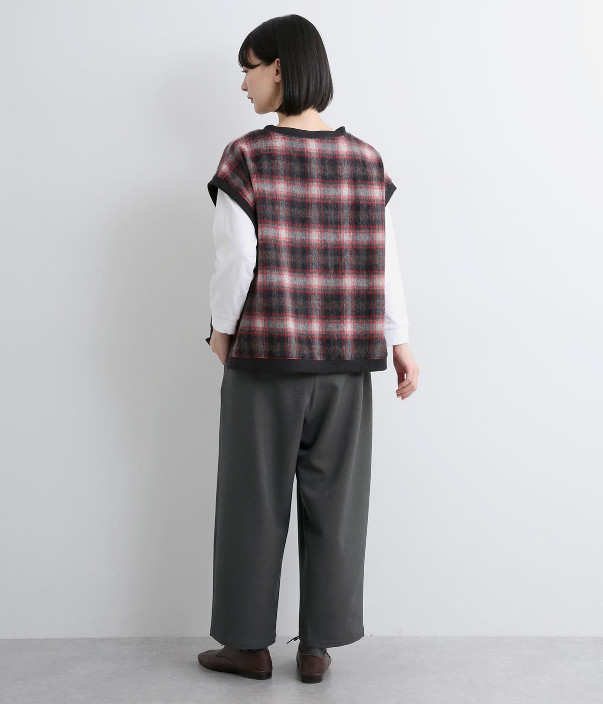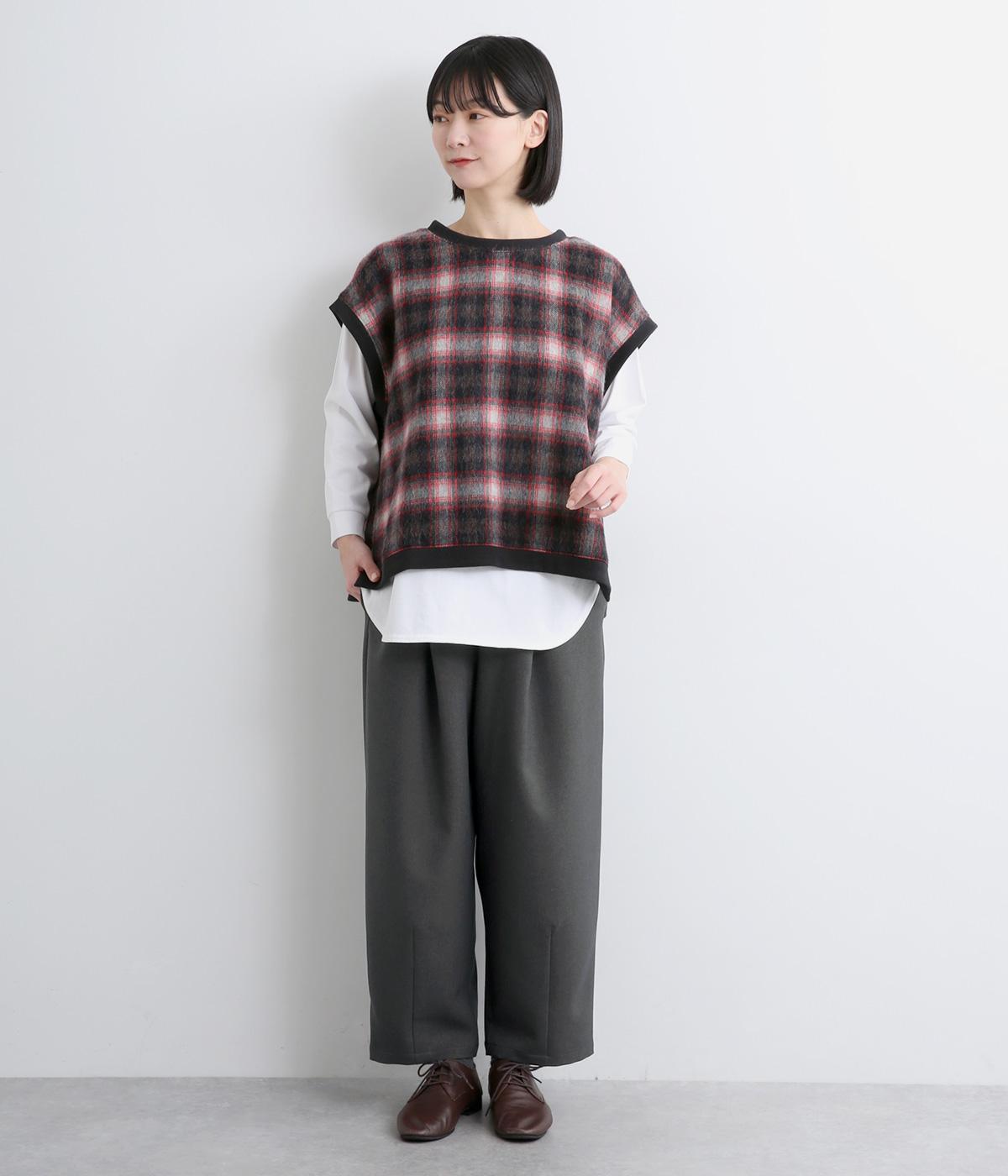 ウエストにタックを入れて自然な立体感をつけ、裾ダーツで全体をすっきりまとめました。トップスインもきまる前ベルト仕様で、サイドから後ろにかけてゴムを入れているのでお腹まわりの窮屈さも軽減。レースアップシューズでクラシカルな装いも◎。