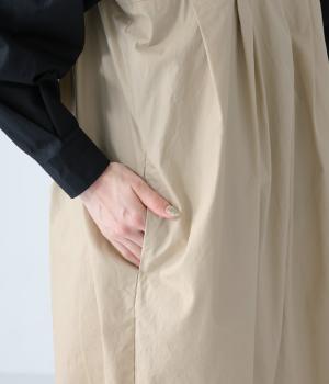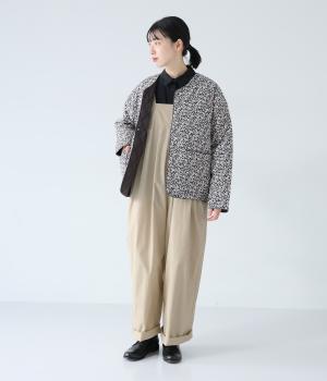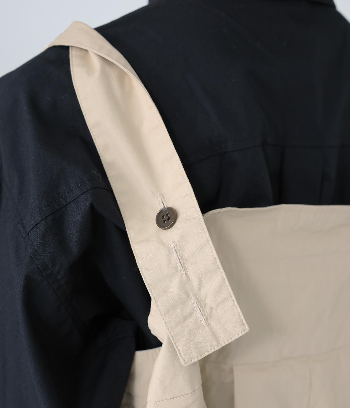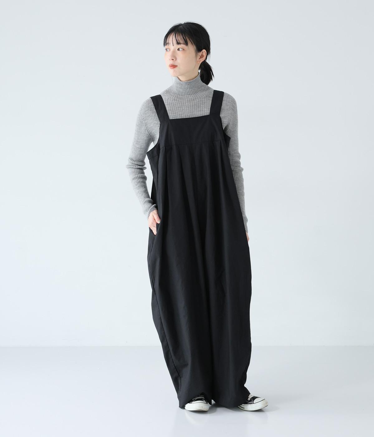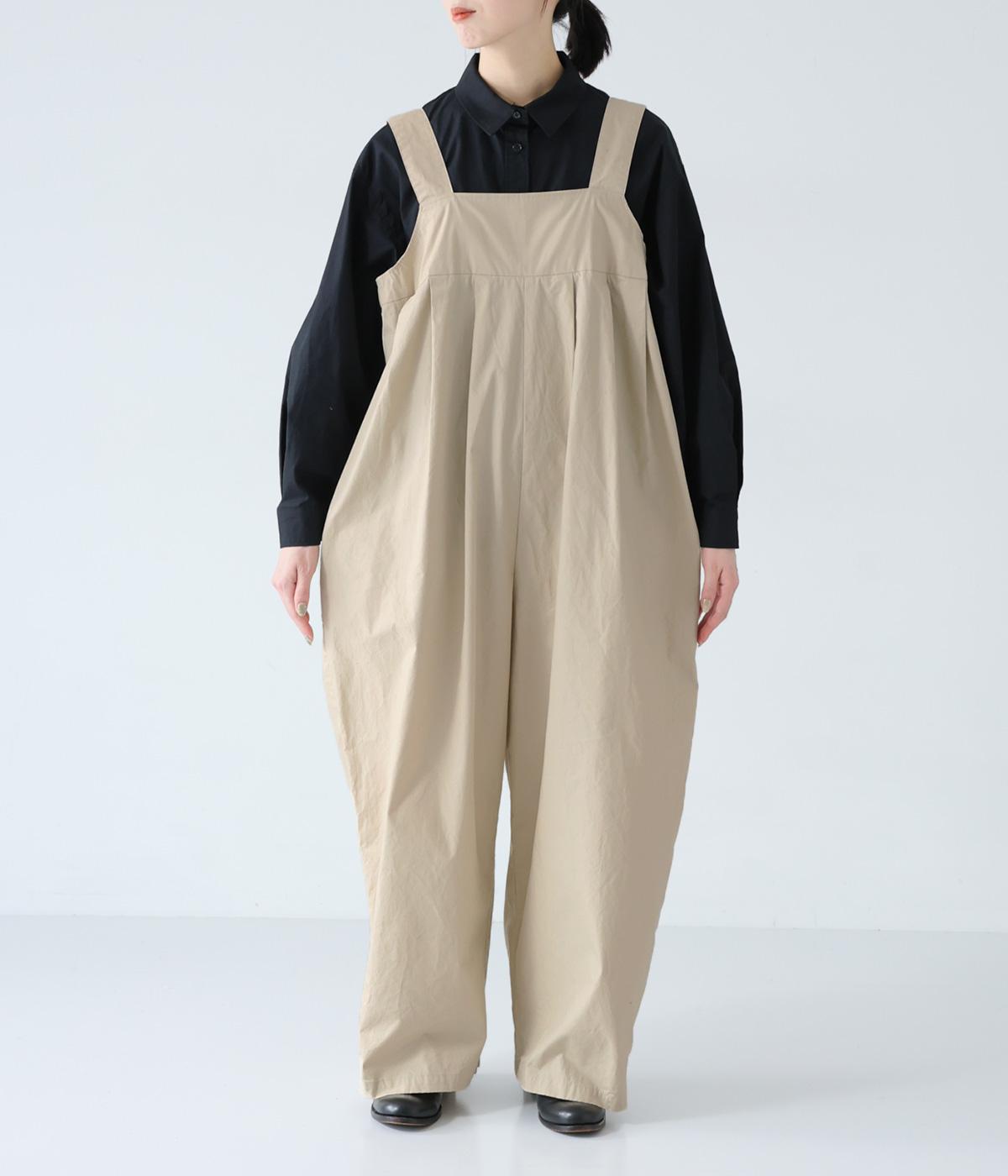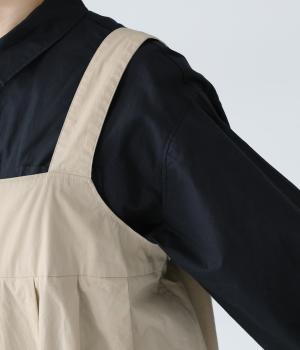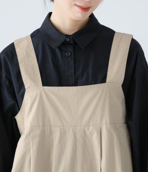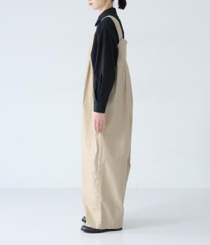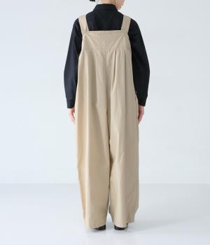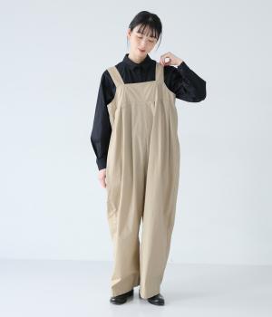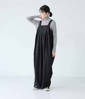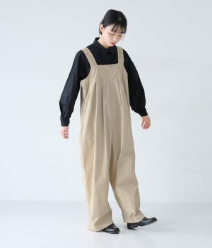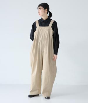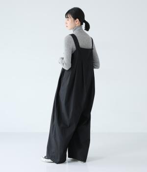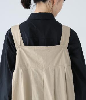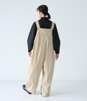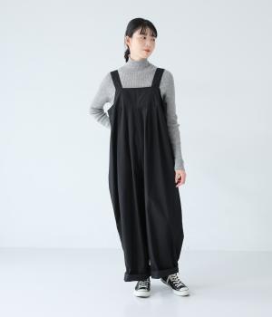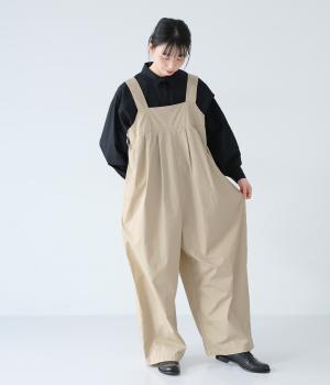 胸下のタックでボリュームを出し、気になる体のラインをカバーしながらゆったりと着られるサロペットパンツ。丈は少し長めに設定しているので、パンツの裾をラフに折り返してもおしゃれです。左サイドのファスナーで着脱も簡単。ショルダー紐は後ろのボタンで3段階に長さ調整できます。
