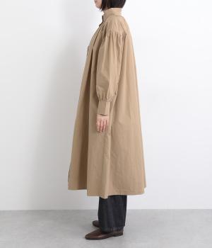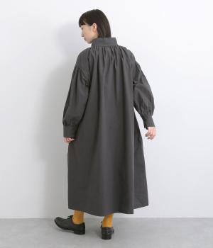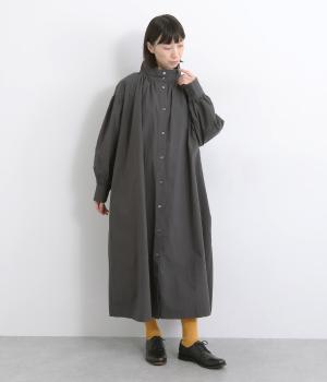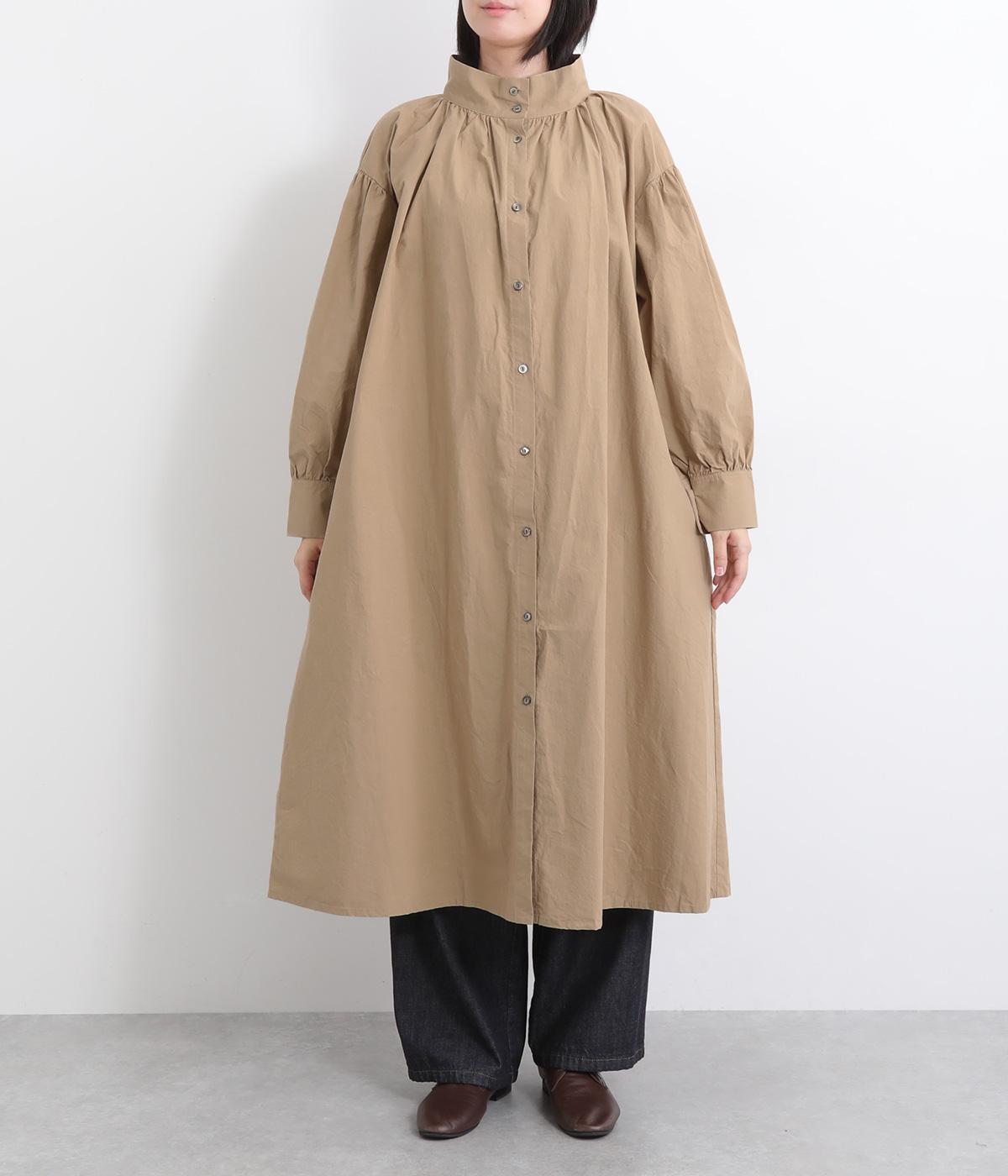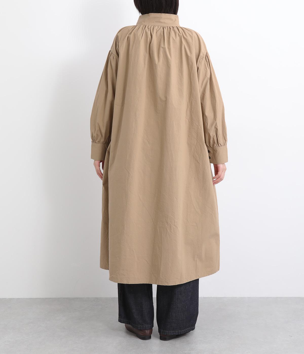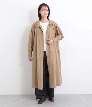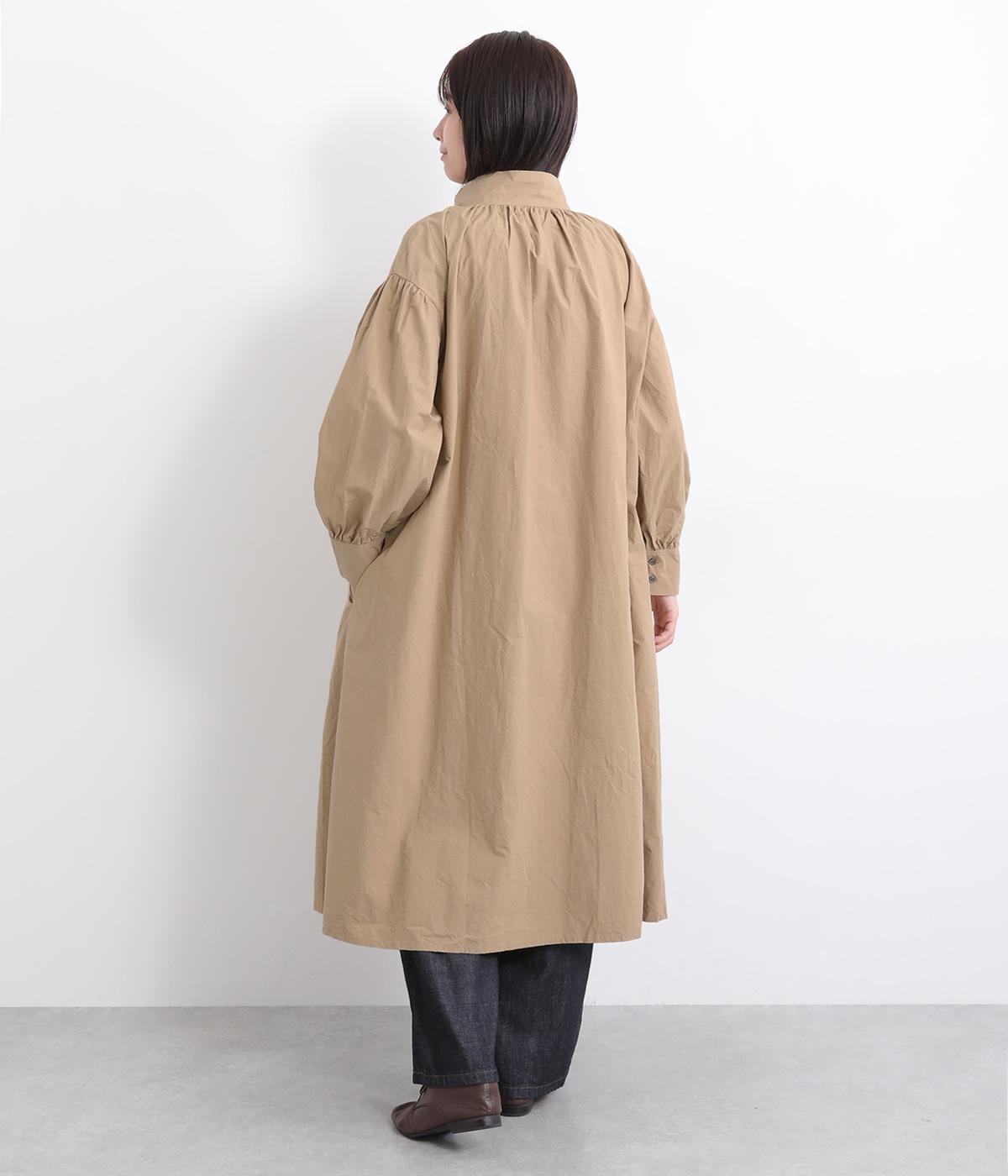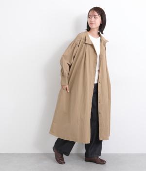 襟ぐりにギャザーを寄せてゆったりとしたAラインシルエットに仕立てました。ボリューム感のある袖もポイントで、フェミニンなディテールとタフさのある生地感のバランスが魅力。存在感のあるロング丈で羽織りスタイルもおすすめ。