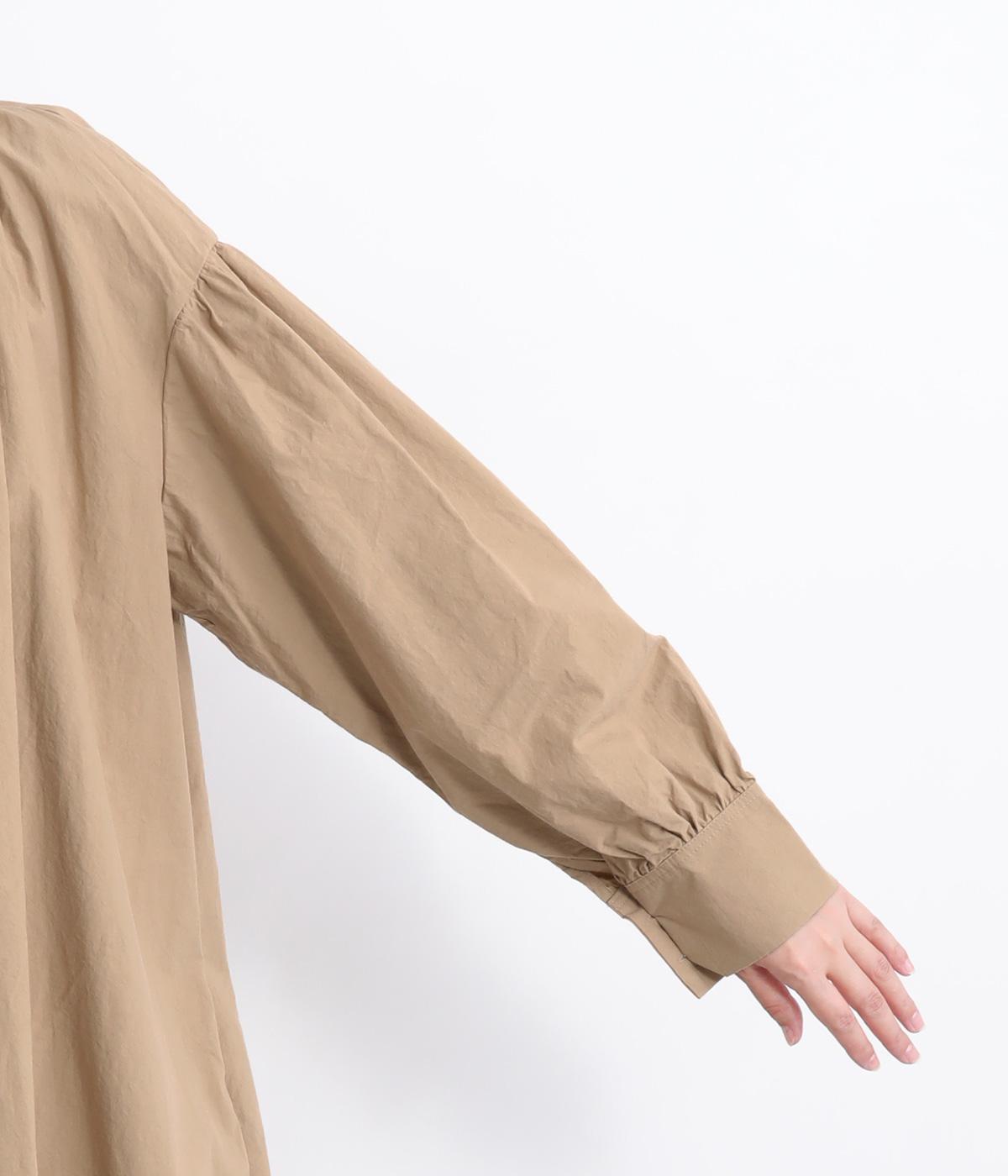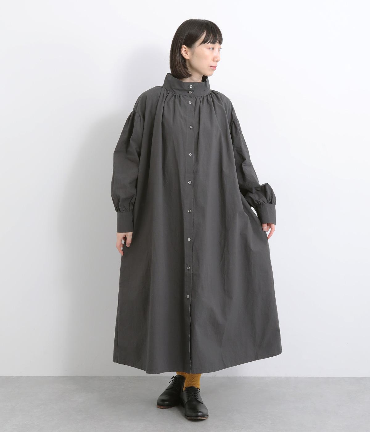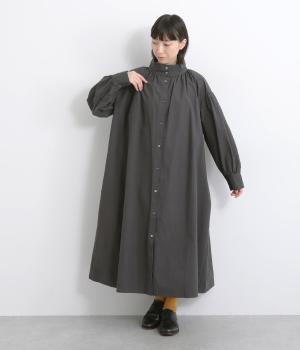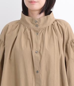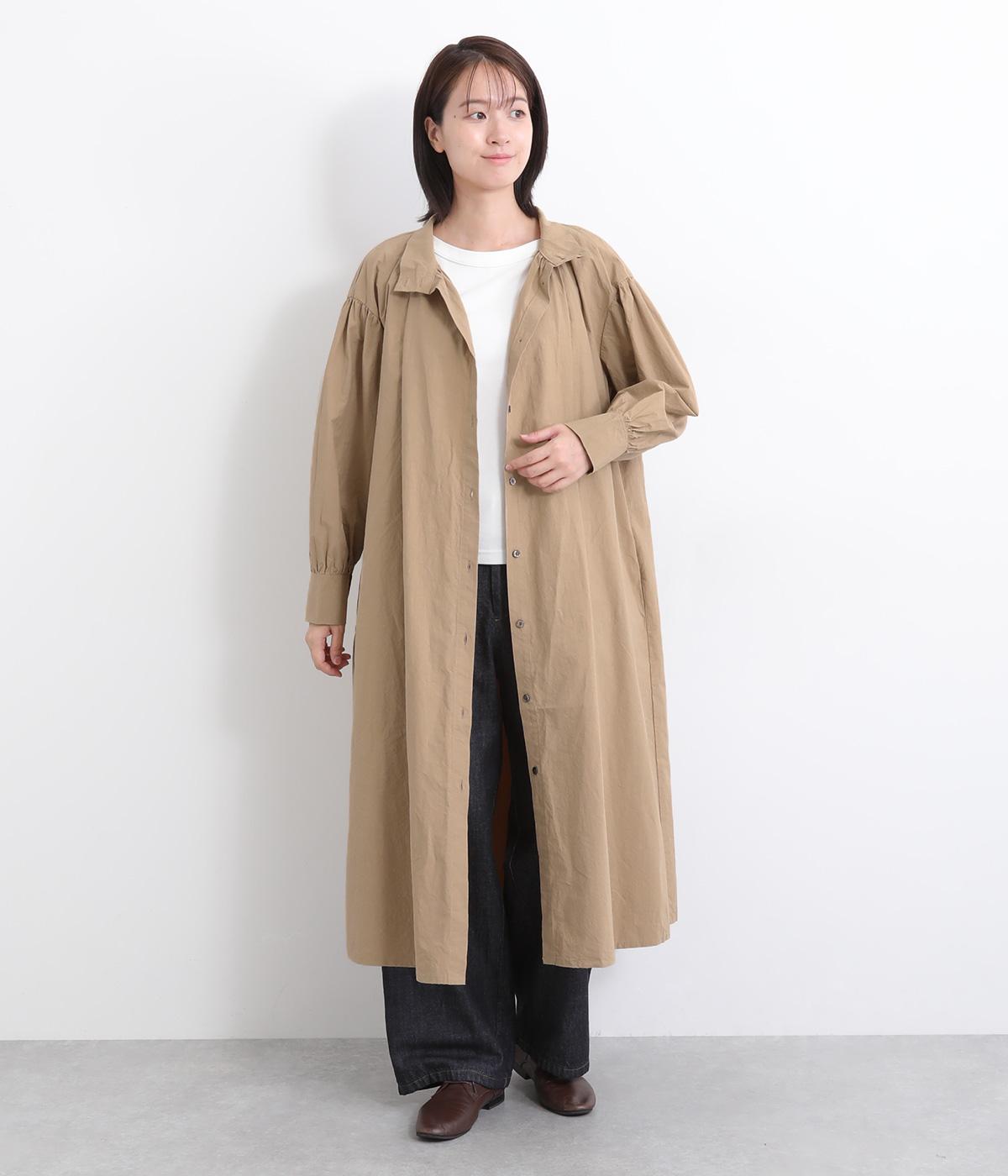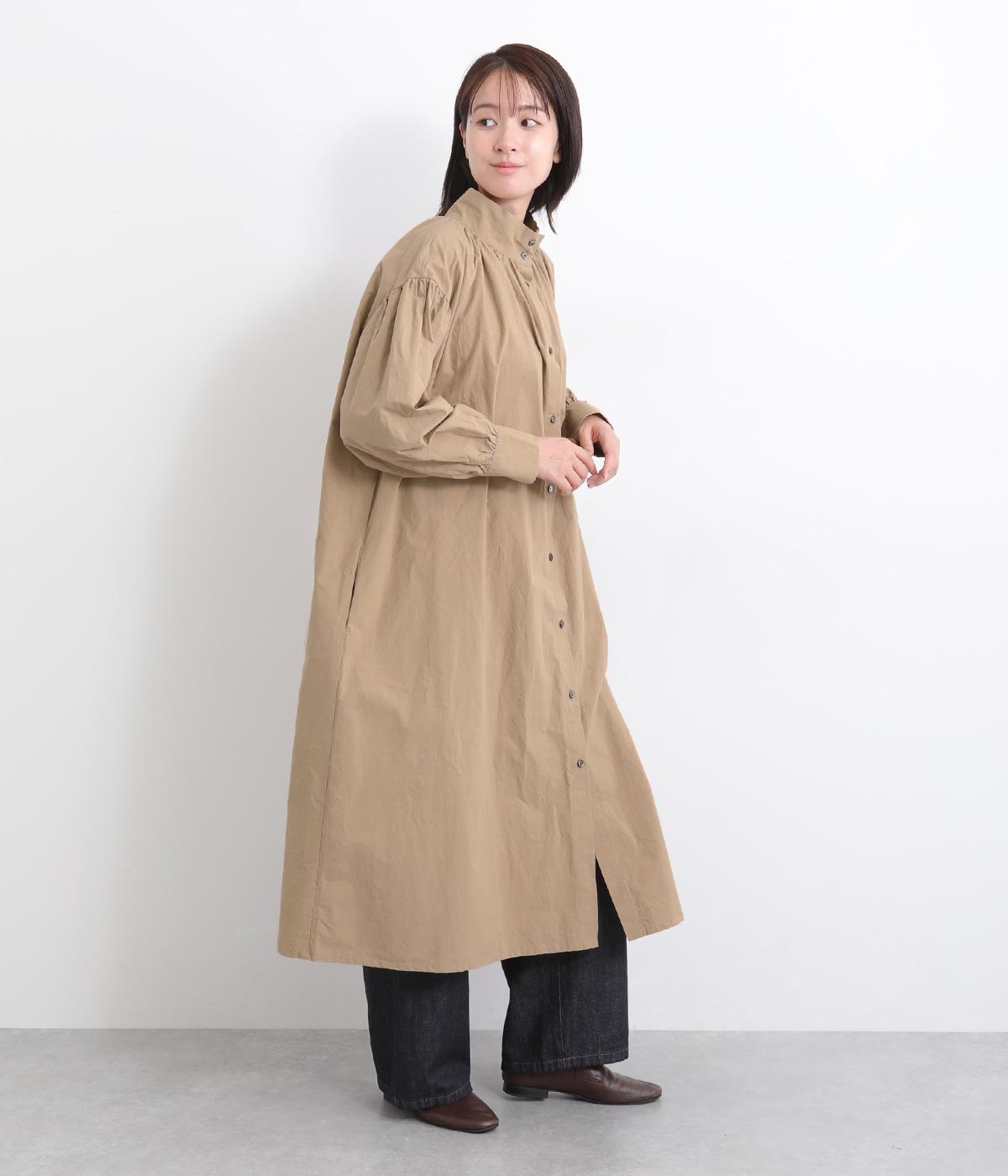 襟ぐりにギャザーを寄せてゆったりとしたAラインシルエットに仕立てました。ボリューム感のある袖もポイントで、フェミニンなディテールとタフさのある生地感のバランスが魅力。存在感のあるロング丈で羽織りスタイルもおすすめ。