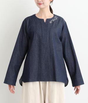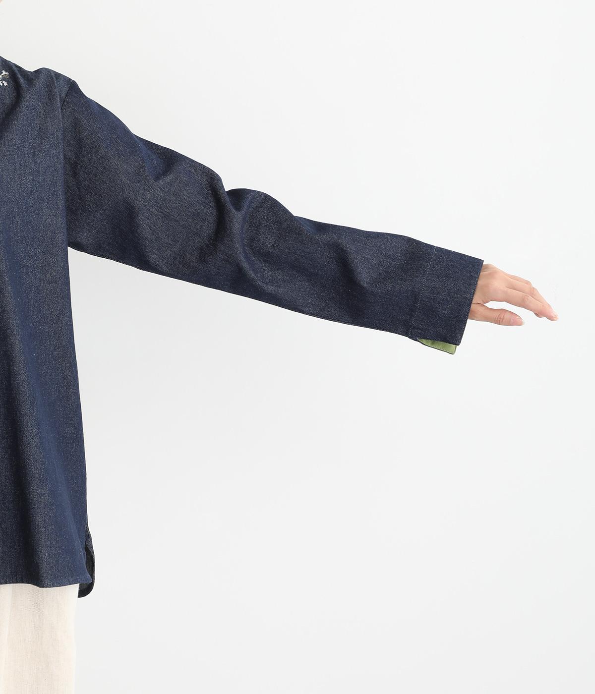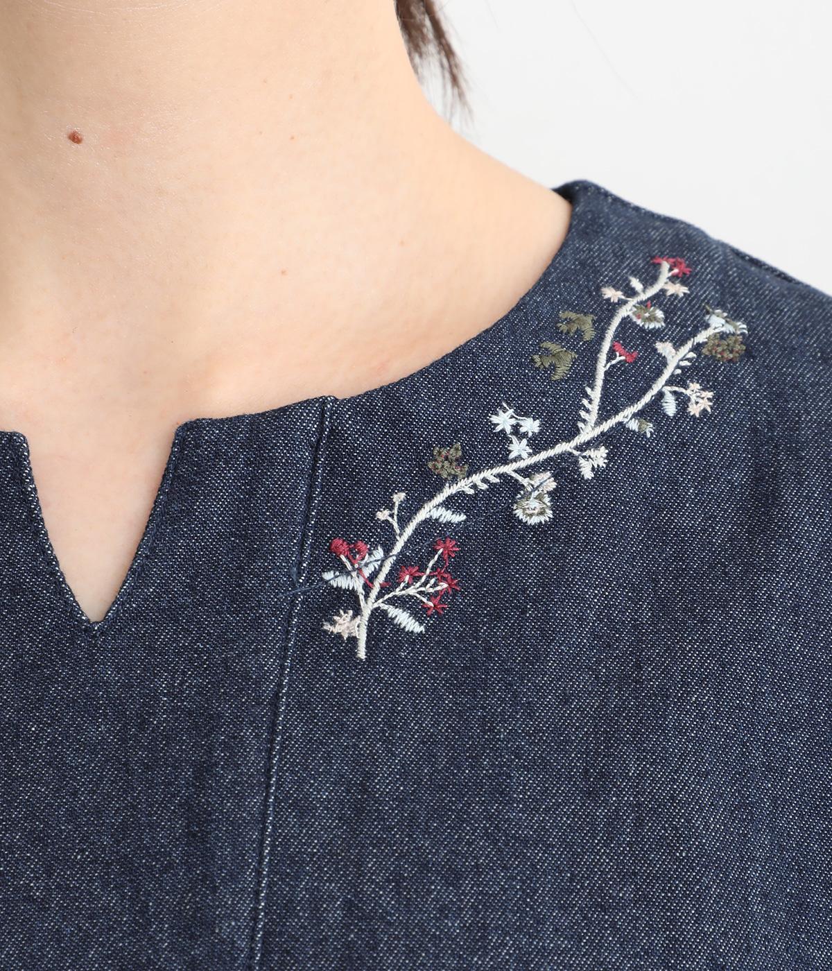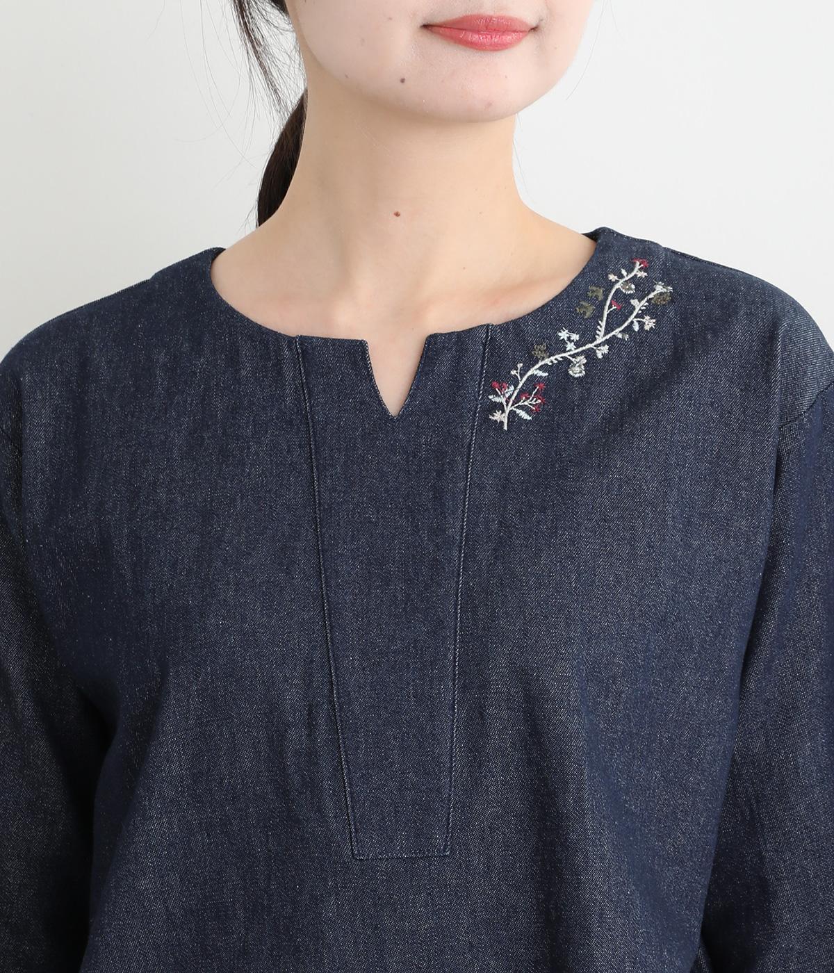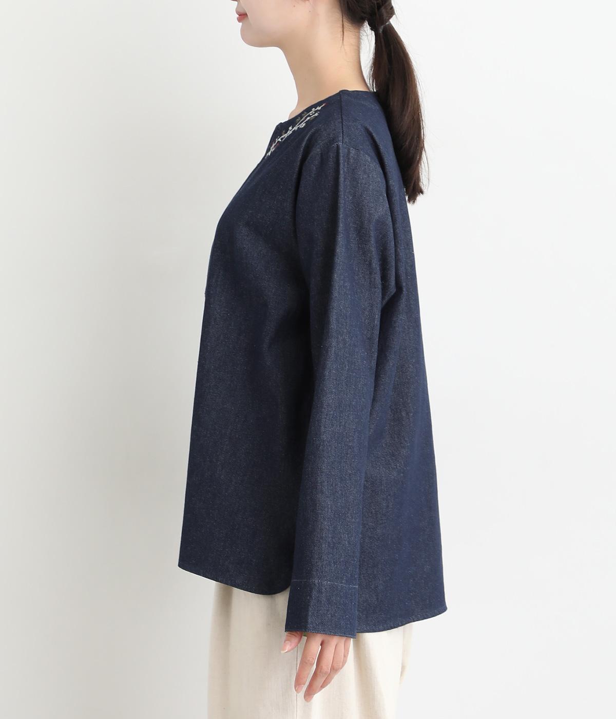 すっきりとした首元にフラワー刺しゅうをあしらったデニムブラウス。スリット入りの袖口の内側には別布を使用し、折り返すことで異なる表情も楽しめます。カジュアルなデニムに女性らしい品を添えた、大人らしい一枚です。
