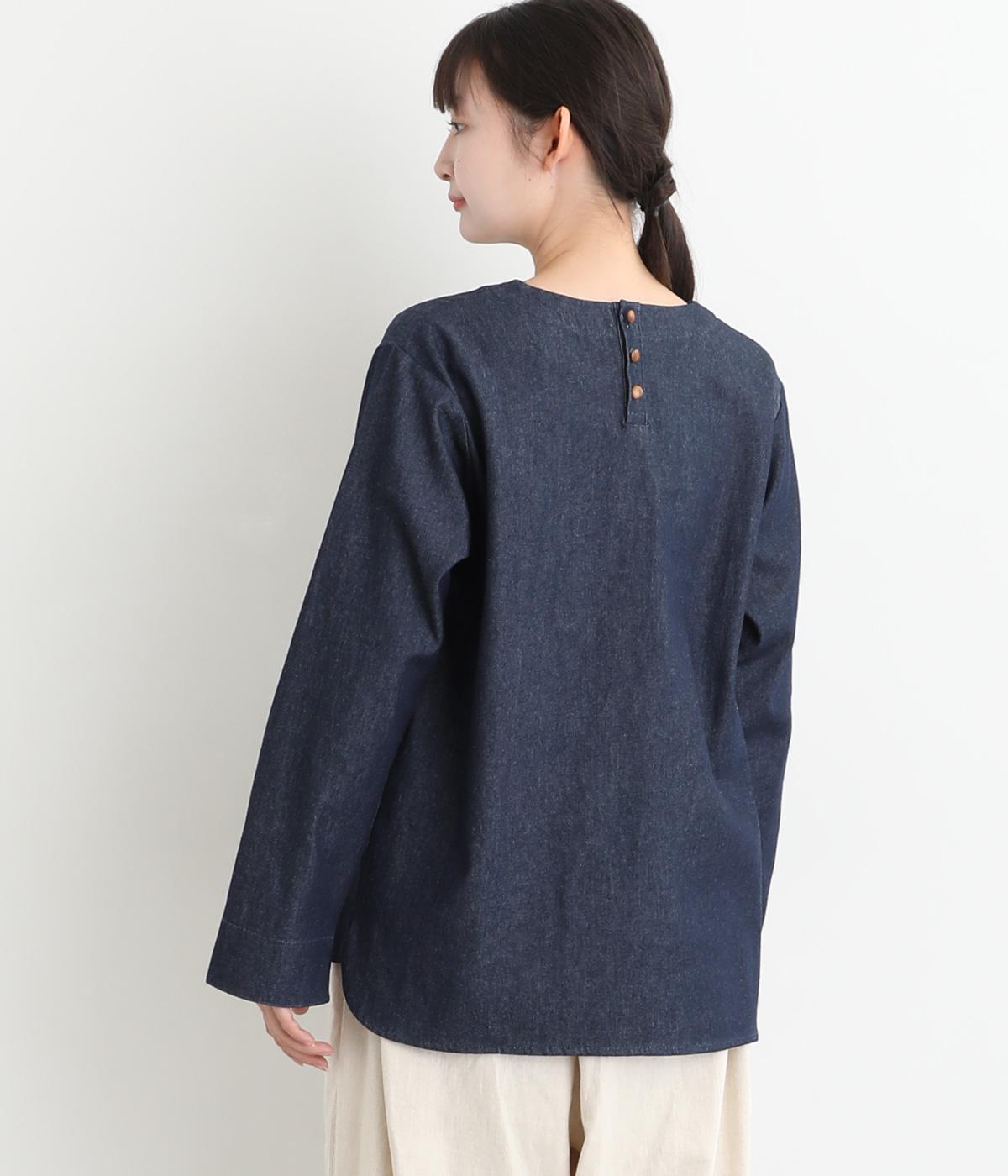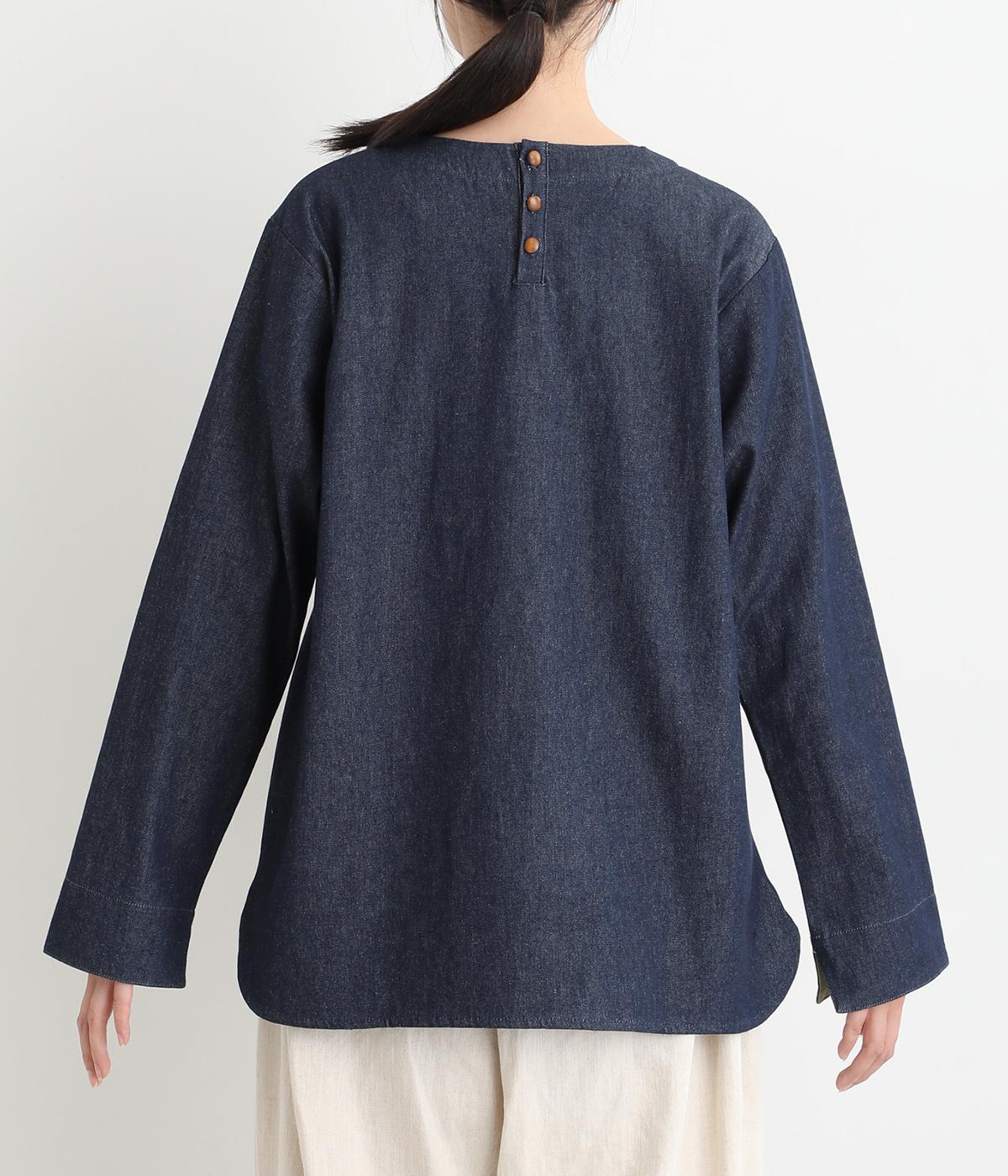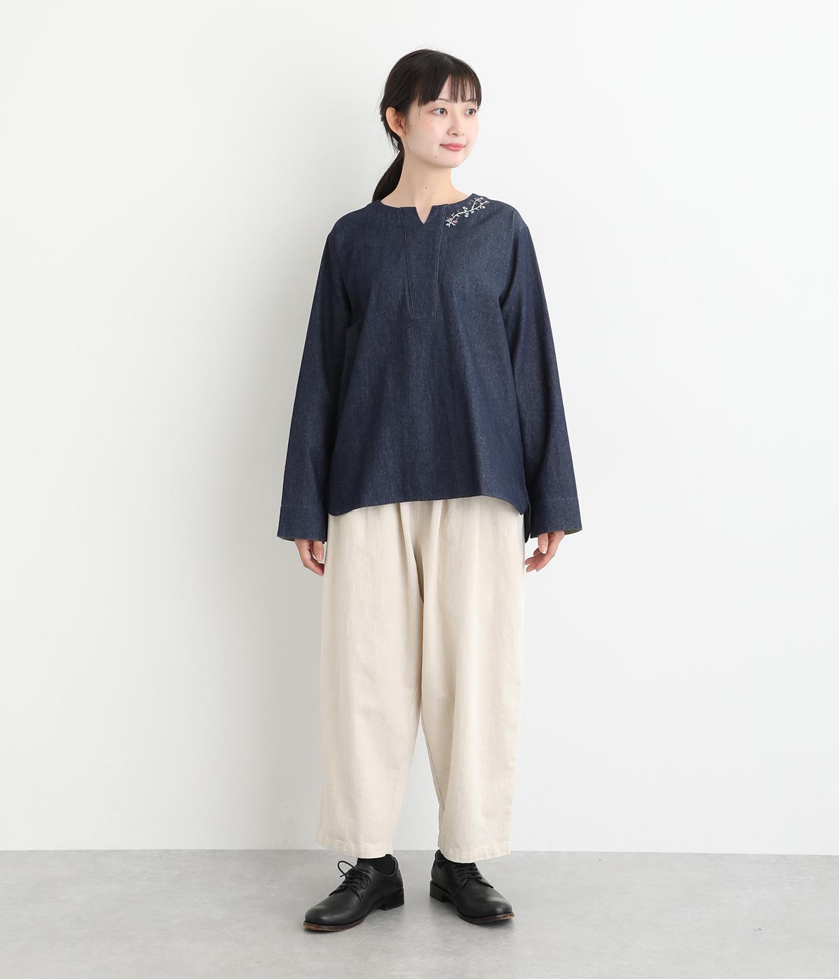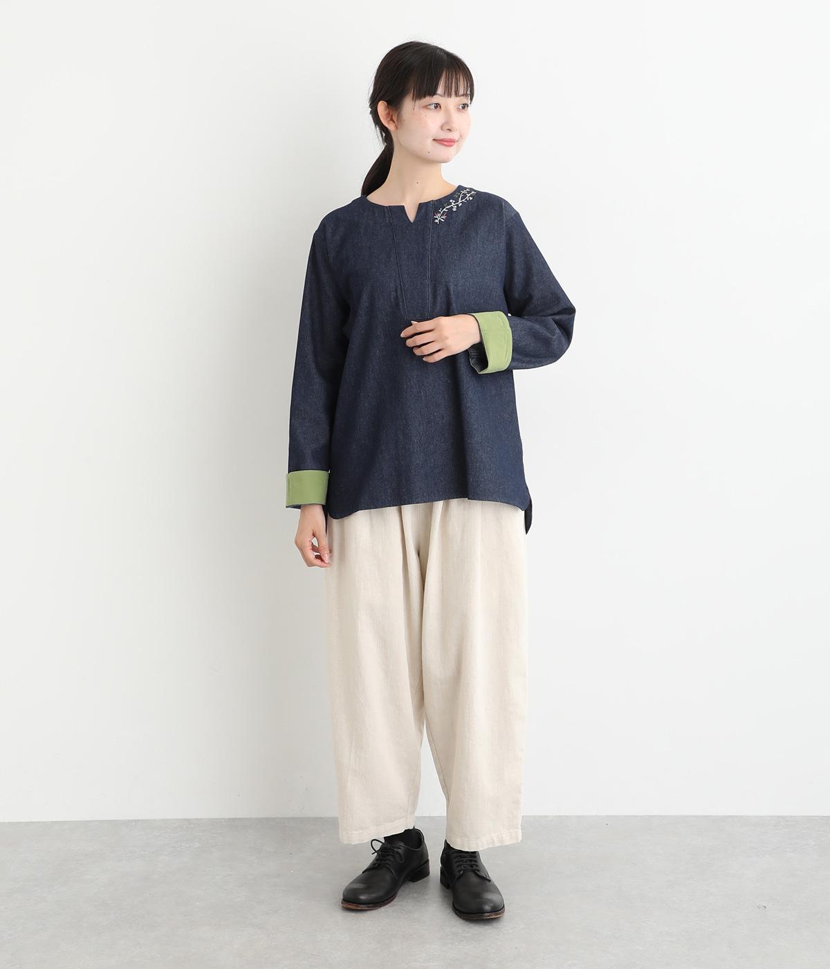 すっきりとした首元にフラワー刺しゅうをあしらったデニムブラウス。スリット入りの袖口の内側には別布を使用し、折り返すことで異なる表情も楽しめます。カジュアルなデニムに女性らしい品を添えた、大人らしい一枚です。