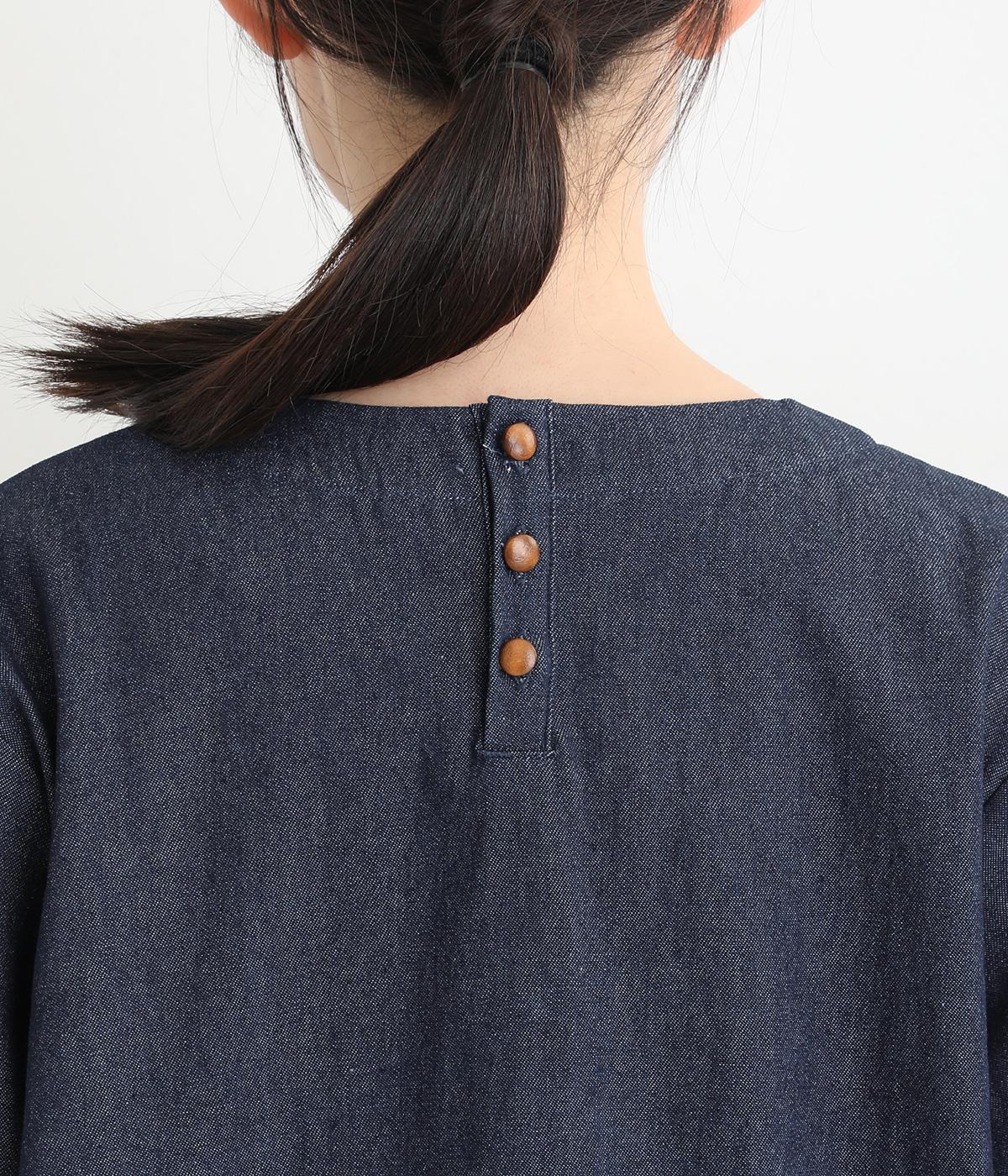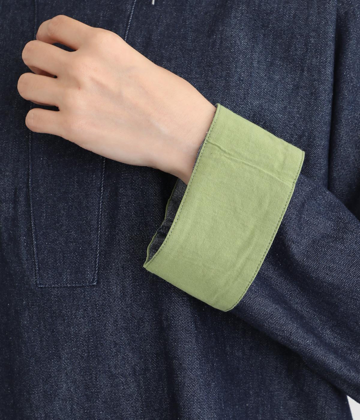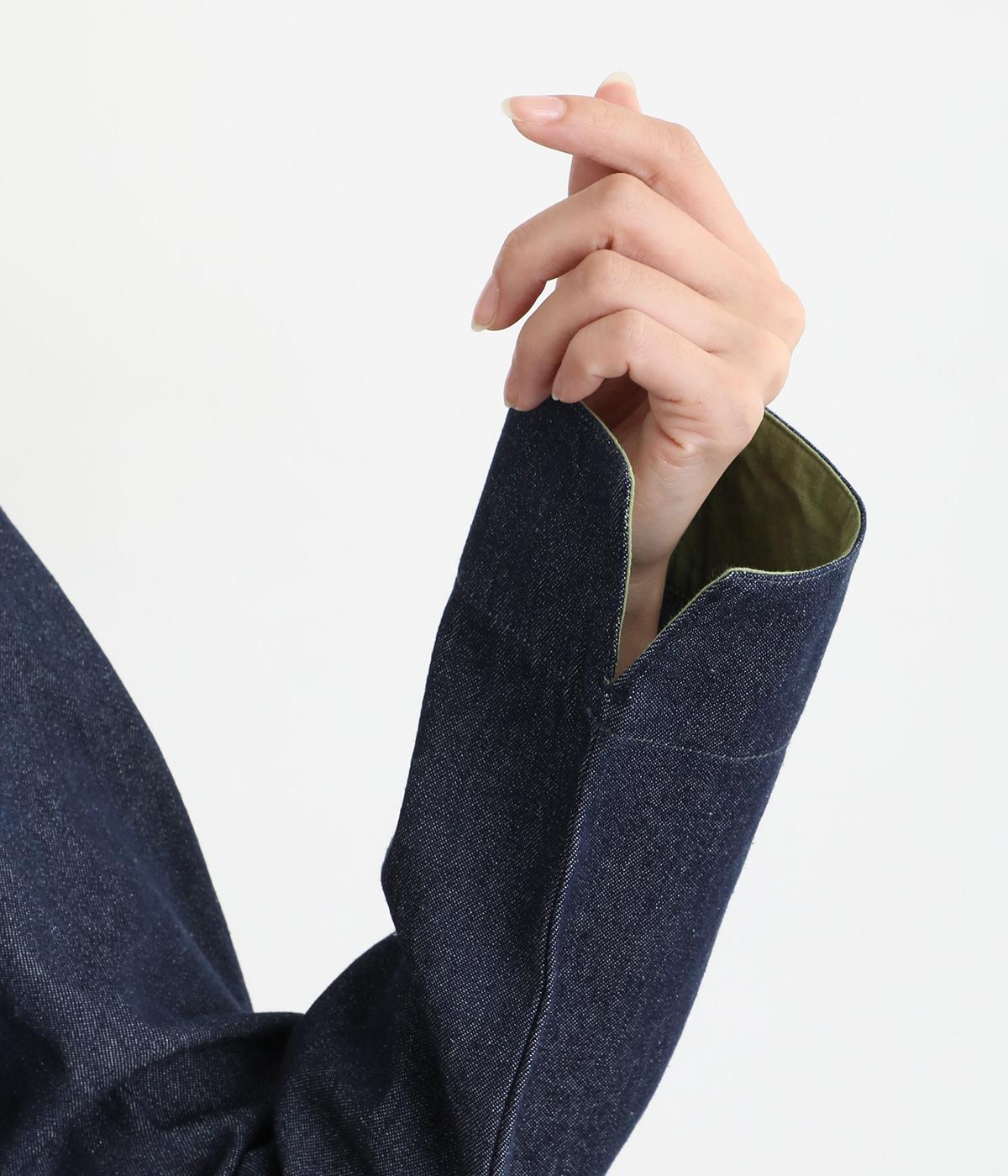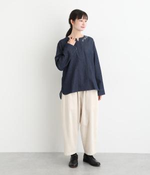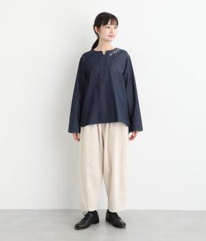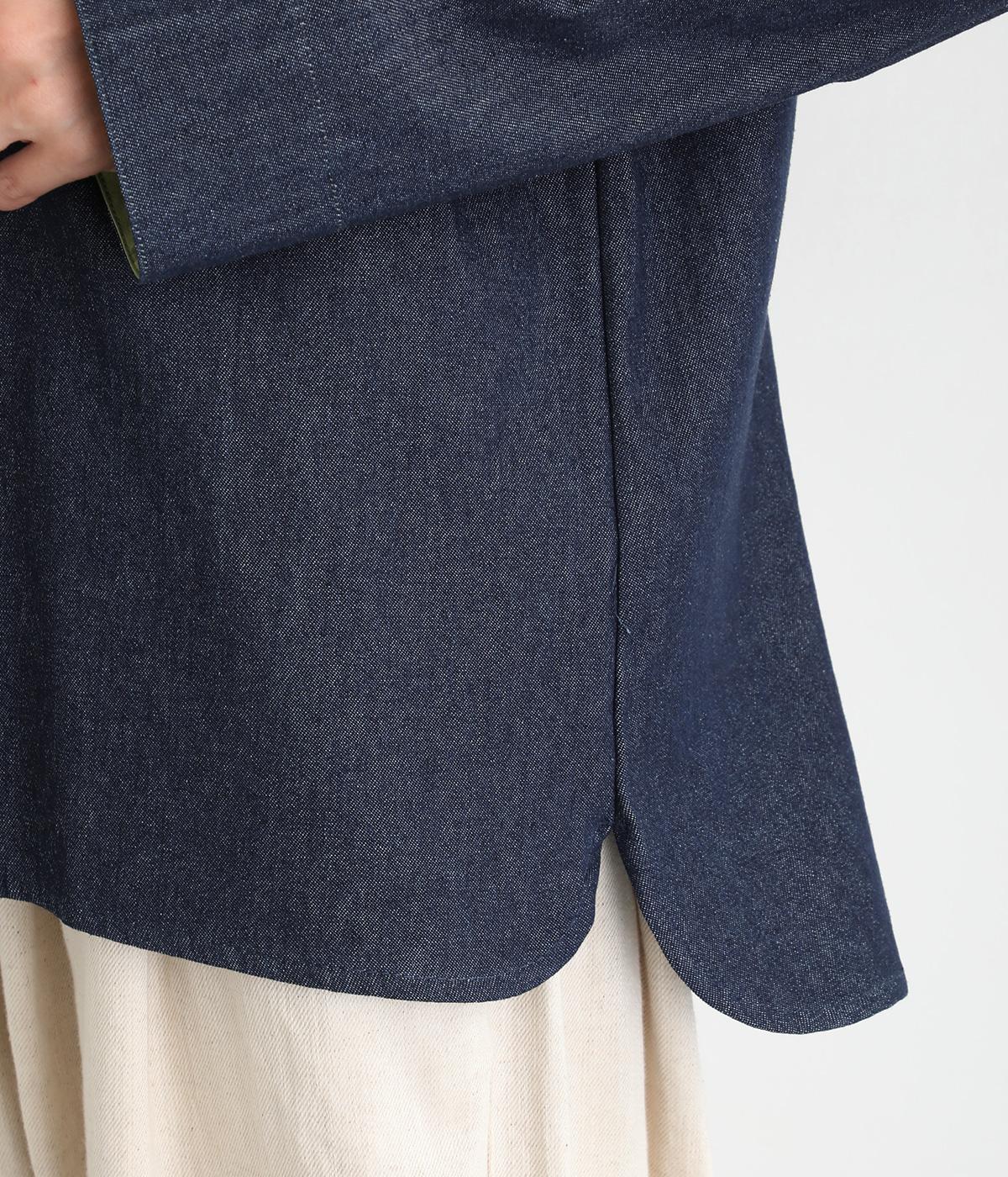 すっきりとした首元にフラワー刺しゅうをあしらったデニムブラウス。スリット入りの袖口の内側には別布を使用し、折り返すことで異なる表情も楽しめます。カジュアルなデニムに女性らしい品を添えた、大人らしい一枚です。