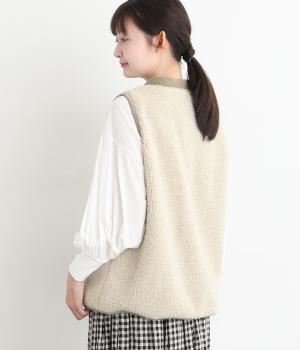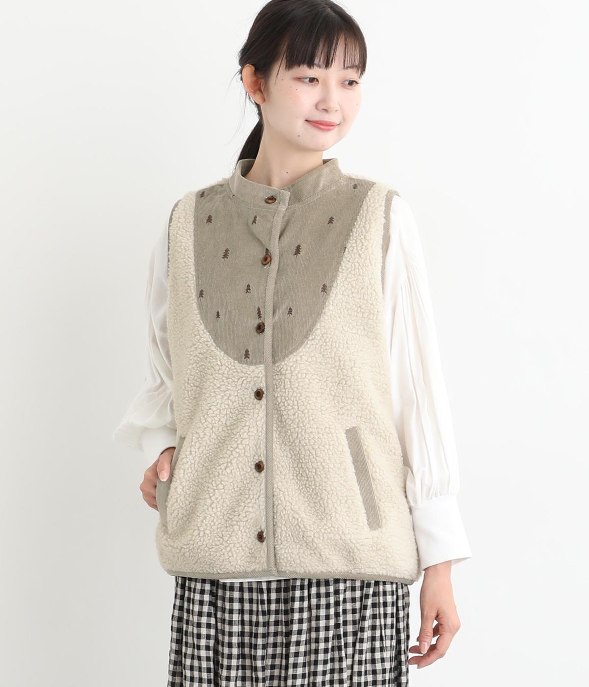 ブザム風の切り替え仕立てが個性的なボアベストです。素朴な木の柄の刺しゅうも自然な風合いを演出しています。カジュアルなボアベストにかわいらしさを添えた一枚です。前を開けてさらりと羽織るだけでもサマになります。