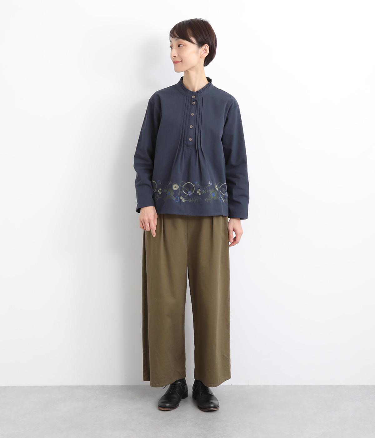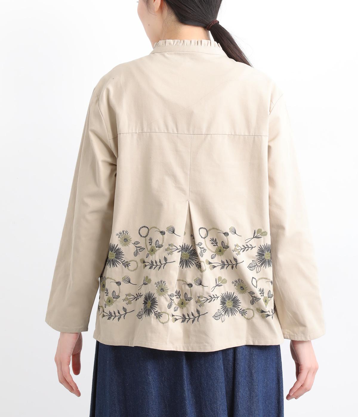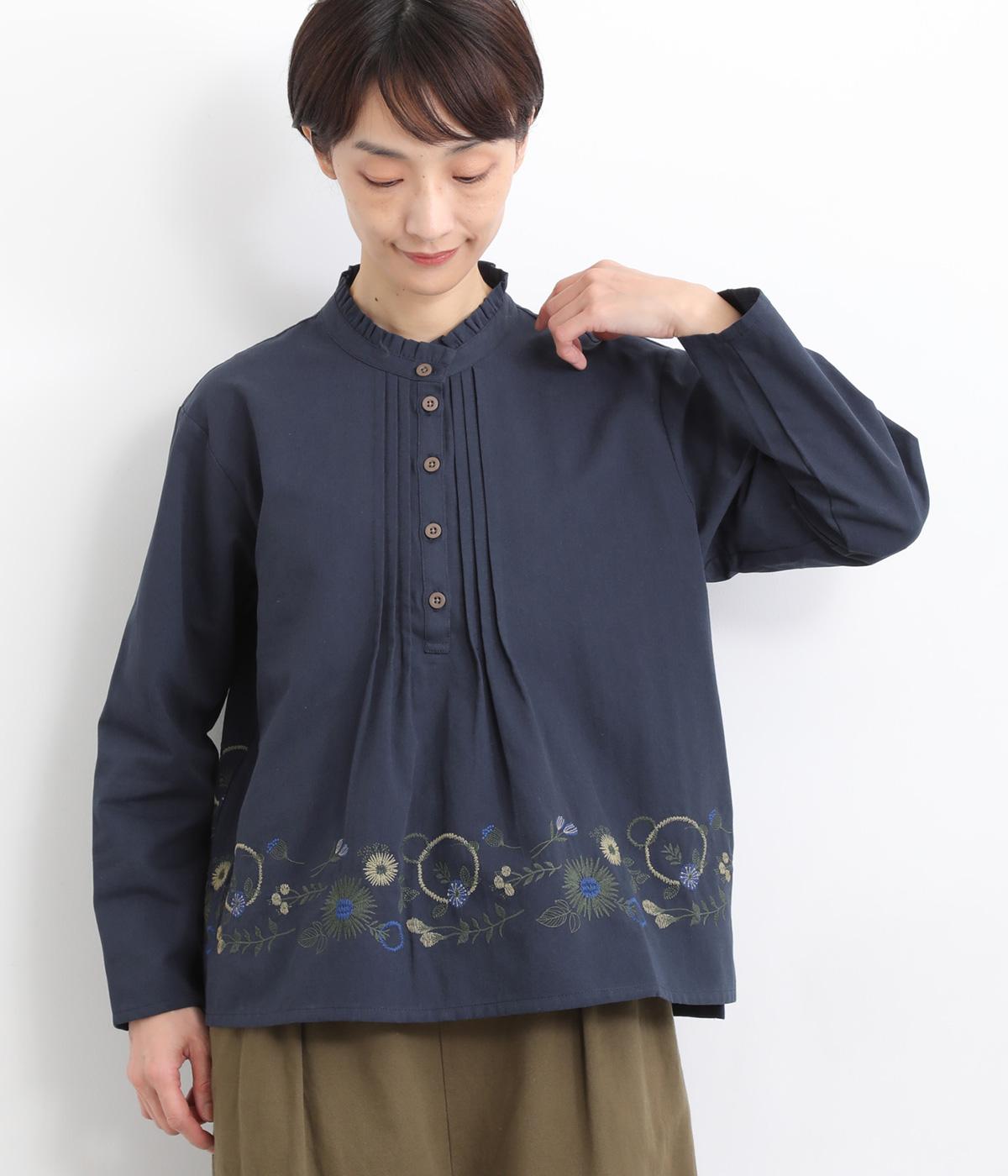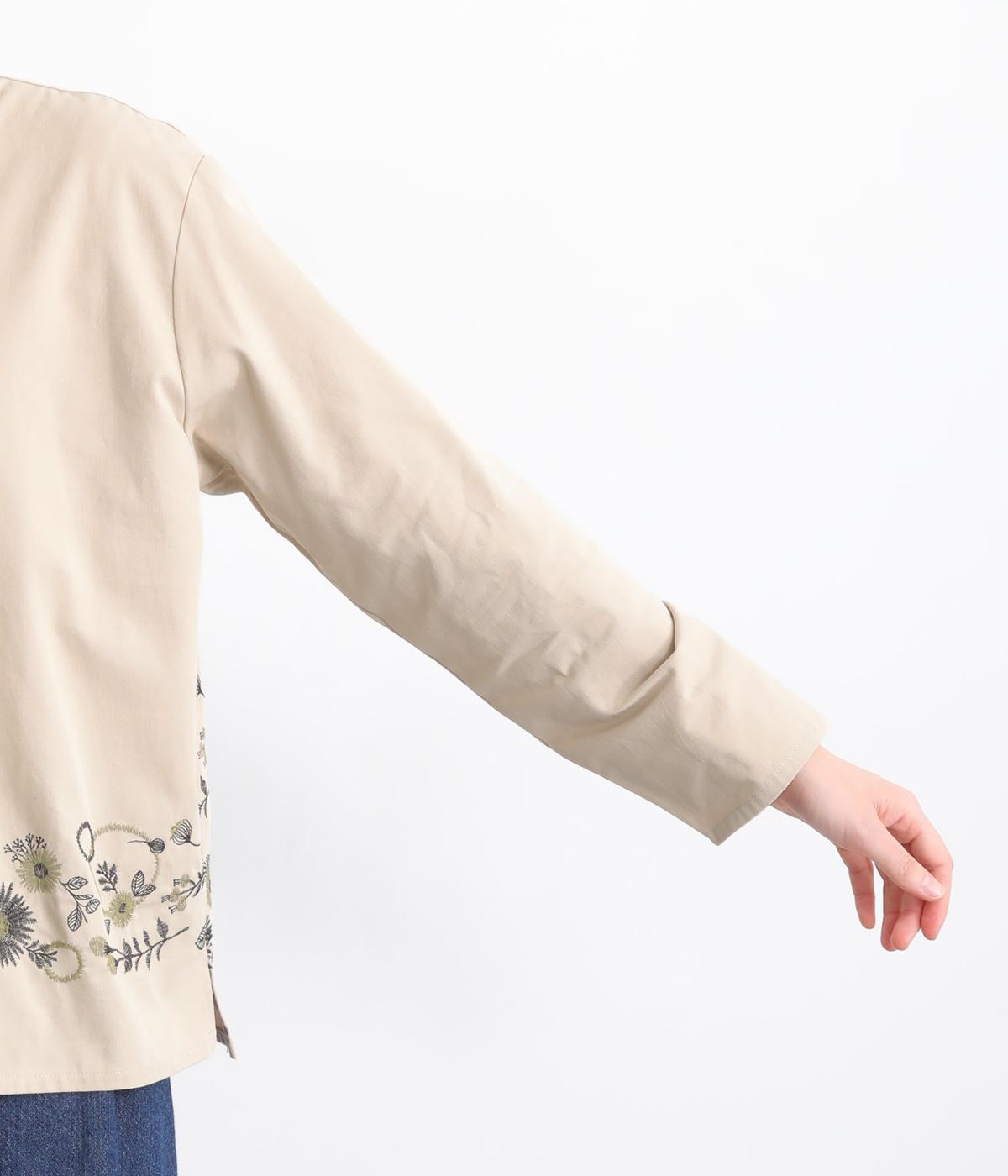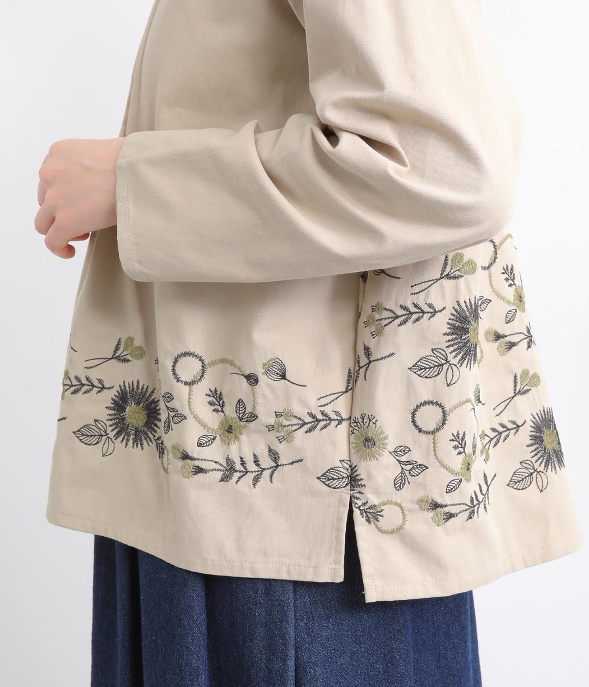 裾にぐるりとほどこした花柄刺しゅうやピンタック、フリルカラーでガーリー要素を詰め込んだ一枚。きちんと感のある生地で甘さを中和し、大人の着こなしになじむ仕上がりです。裾スリット入りでボトム合わせもすっきりきまります。