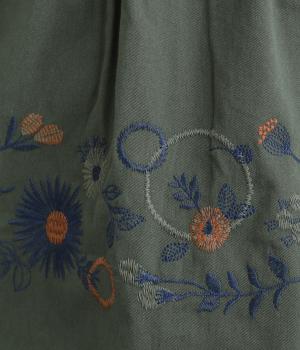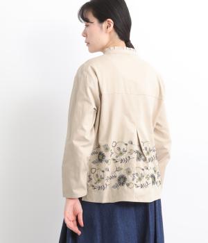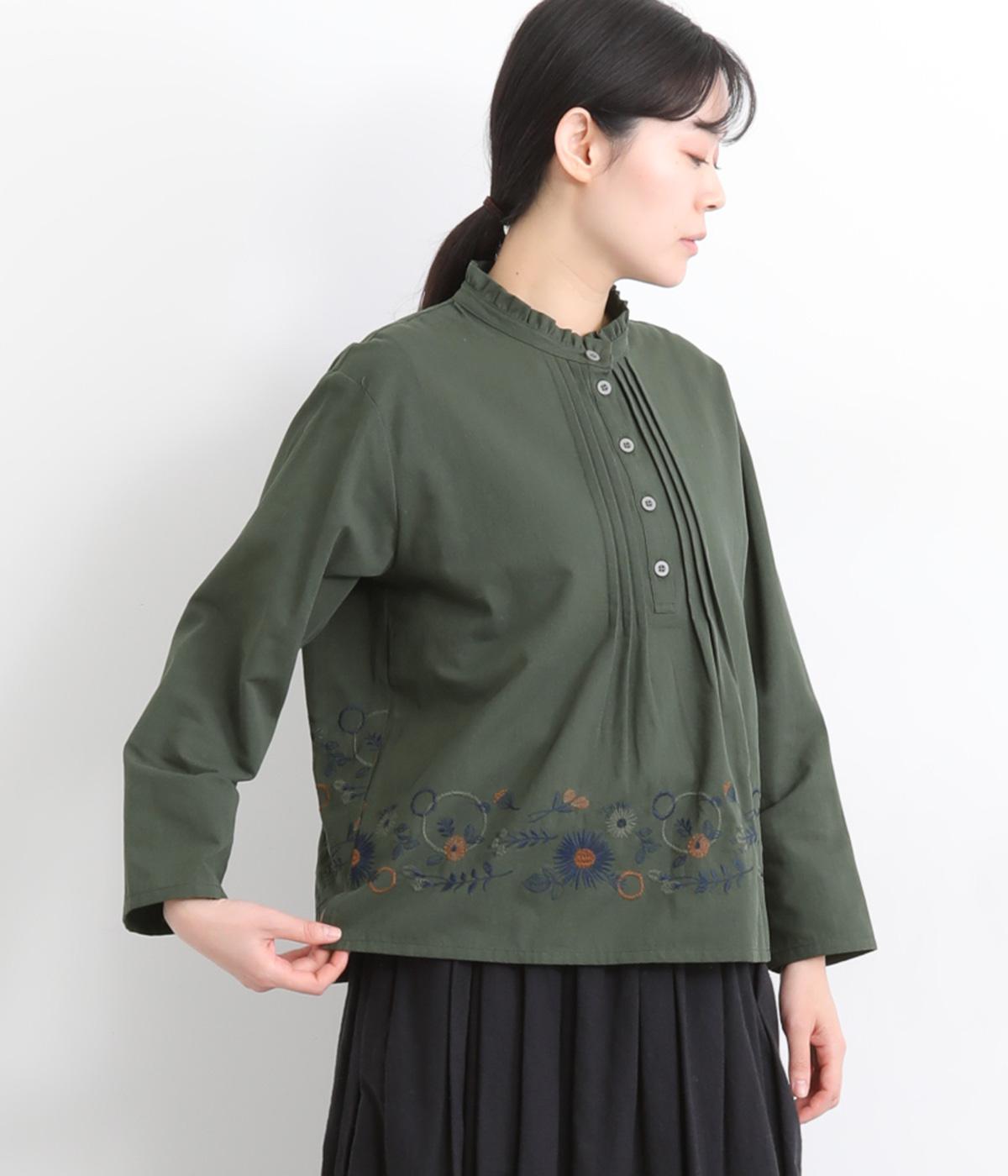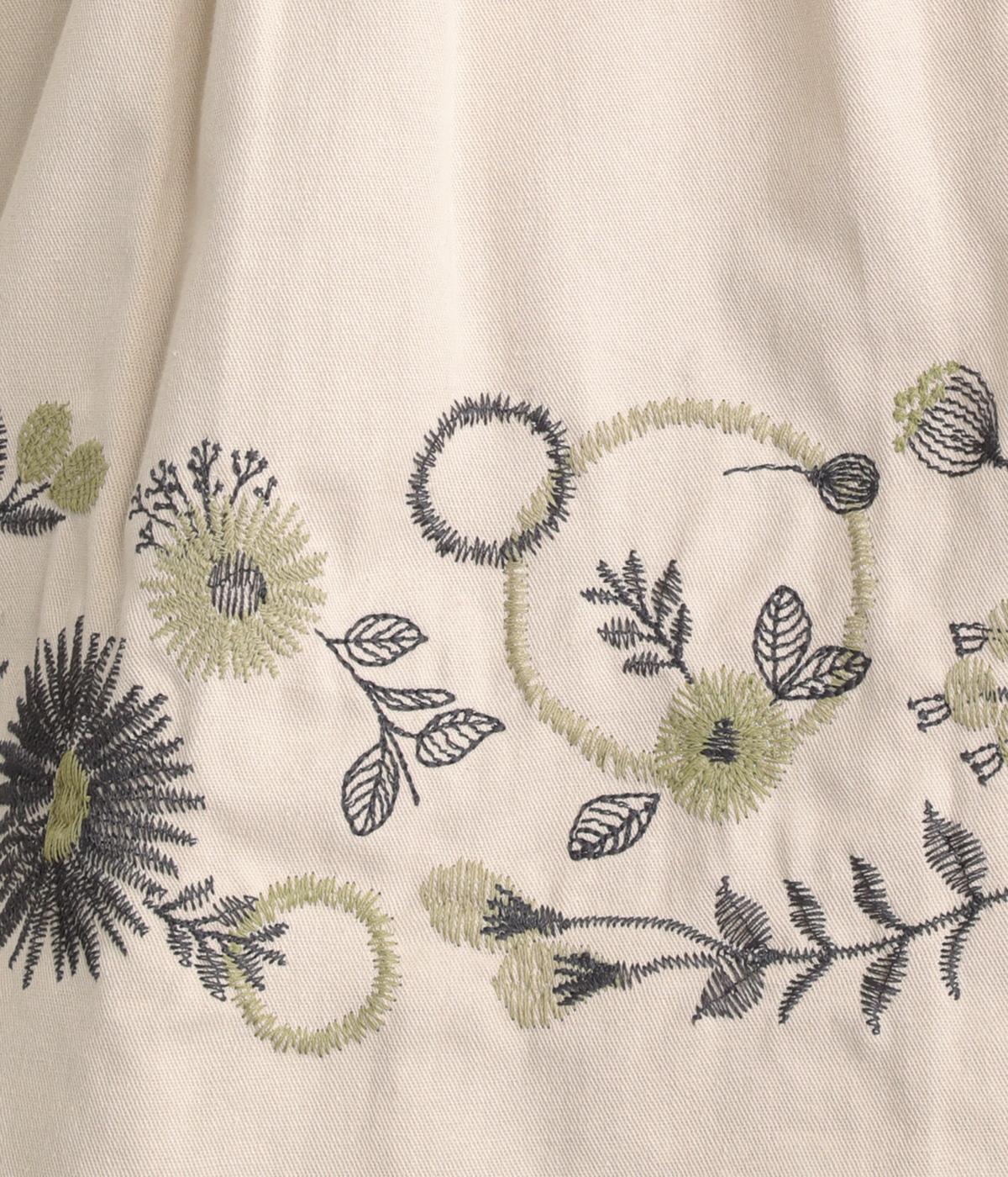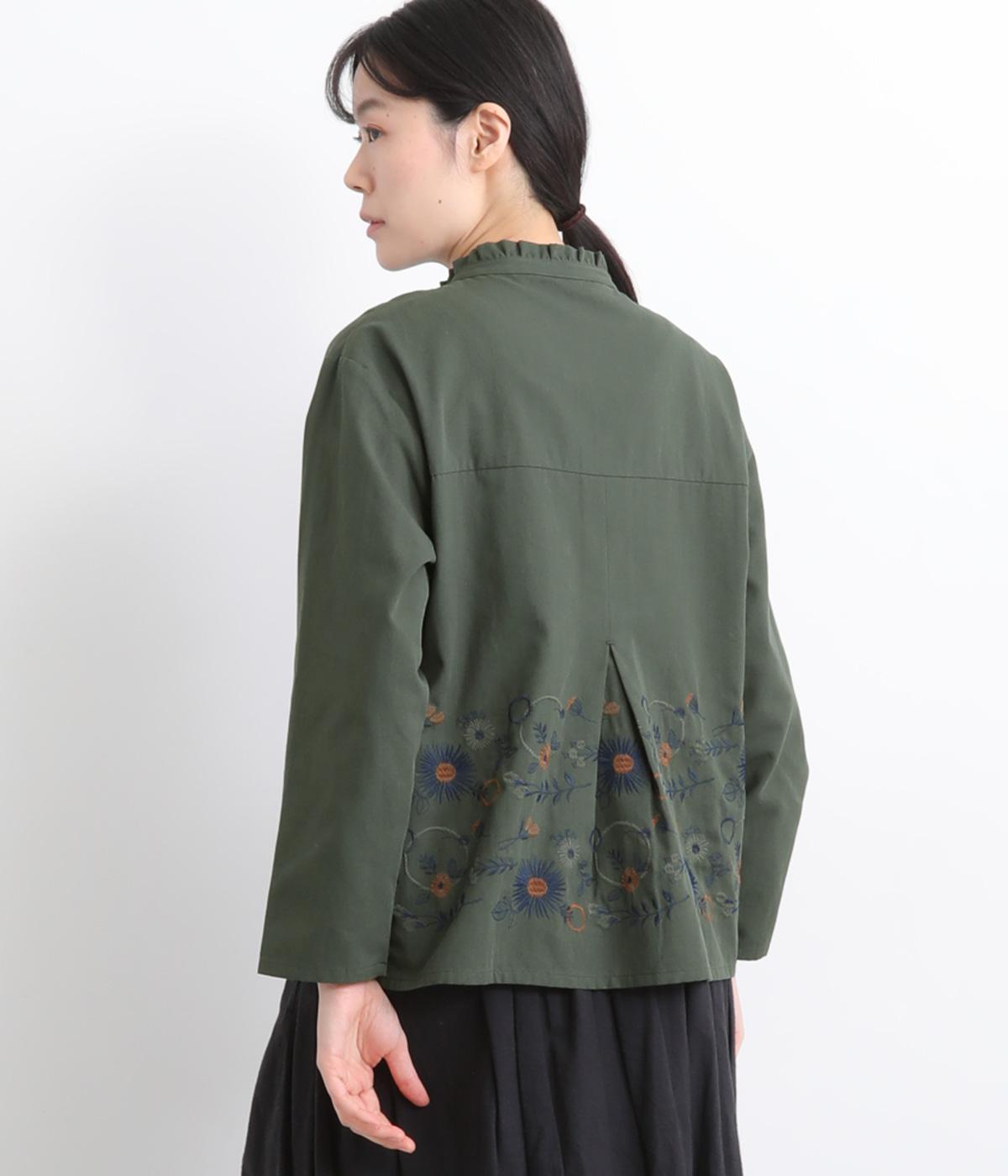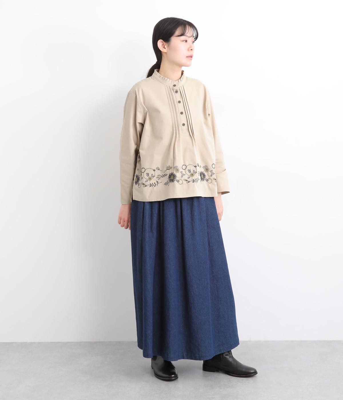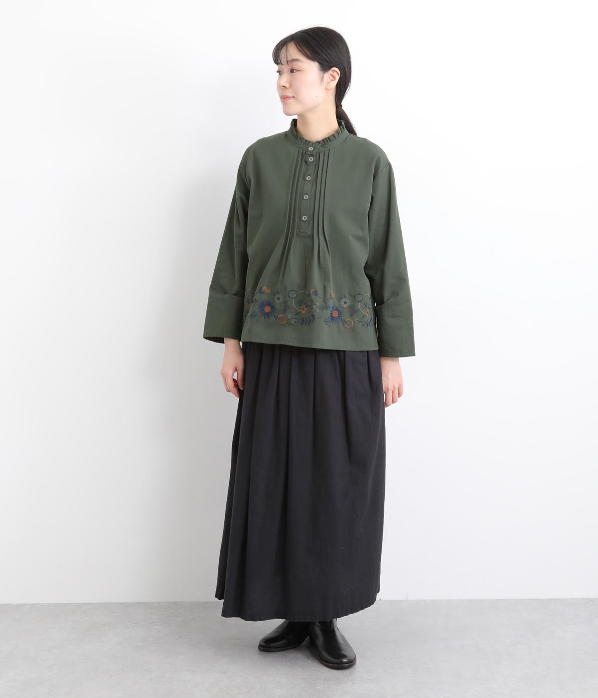 裾にぐるりとほどこした花柄刺しゅうやピンタック、フリルカラーでガーリー要素を詰め込んだ一枚。きちんと感のある生地で甘さを中和し、大人の着こなしになじむ仕上がりです。裾スリット入りでボトム合わせもすっきりきまります。