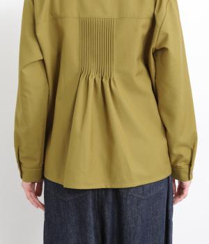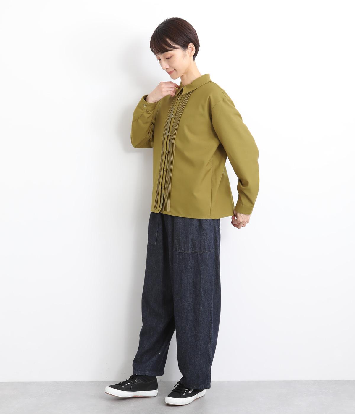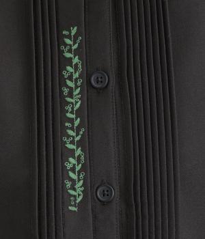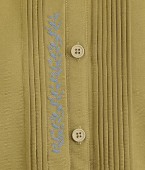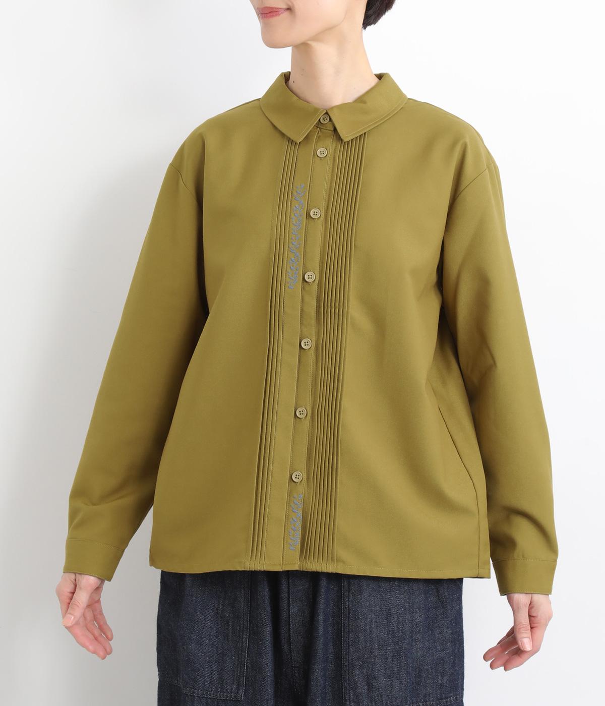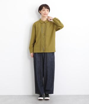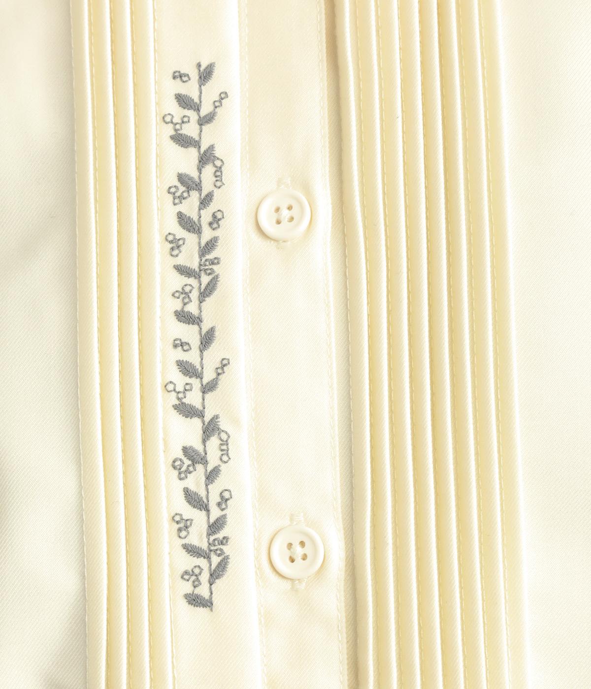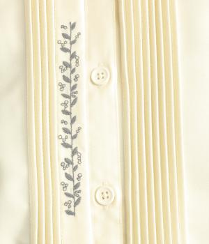 前中心や後ろ身頃に入れたピンタックがきれいめな印象を与える襟つきシャツ。葉っぱの刺しゅうラインが他にはない特別感をプラス。きちんと感もあるのでデイリーにもよそいきスタイルにも活躍し、羽織り使いもたのしめます。