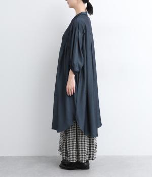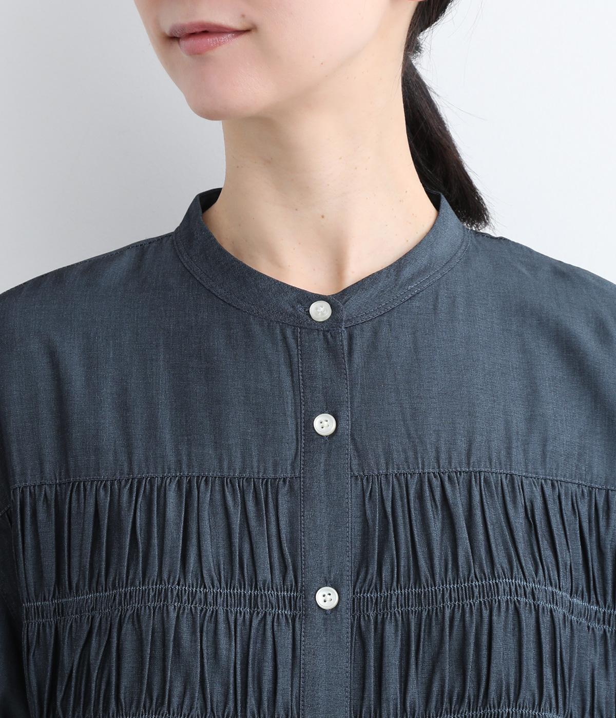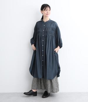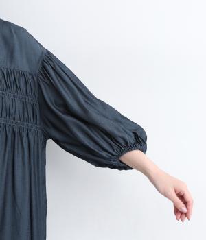 胸元にたっぷりとあしらったシャーリングによって立体的で、動きのあるシルエットを表現。袖口にゴムを通したボリューム袖も大人のかわいさを引き立てるポイントに。前あきで羽織って合わせるのもおすすめな一枚です。