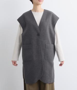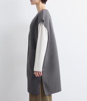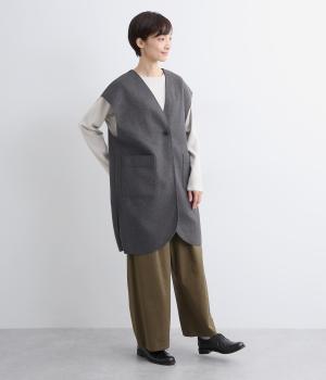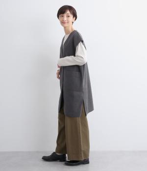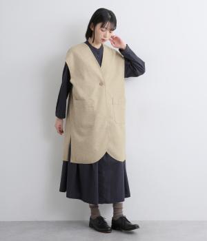少し肌寒くなってきた時のライトアウターに最適なベストです。裏なしの切りっぱなし仕様と、裾に大きく入ったスリットが全体を軽やかに見せてくれます。アームホールは広めで窮屈さを感じにくいのも嬉しいポイント。