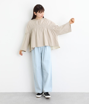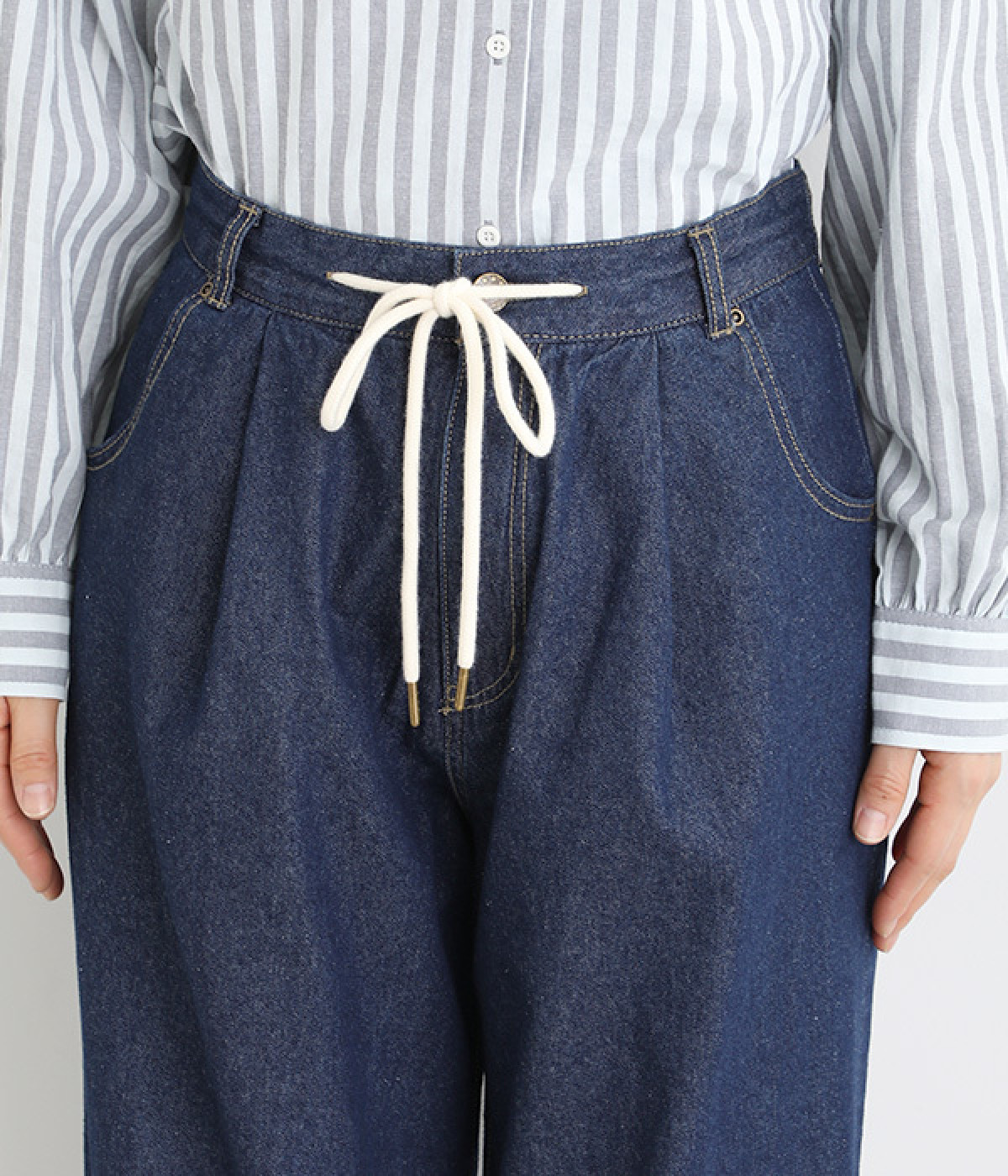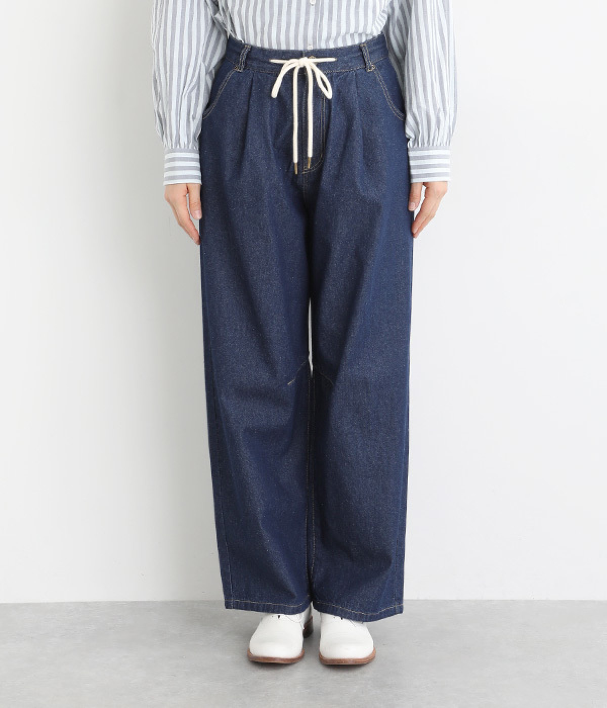 脚のラインを拾いにくい、ゆったりとした仕立てのパンツ。ひざ部分にダーツを入れ、立体感のあるシルエットに仕上げました。ウエストはあえてゴム仕様を避けることで、腰まわりがすっきりとした印象に。ウエストリボンでフィット調節が可能です。
