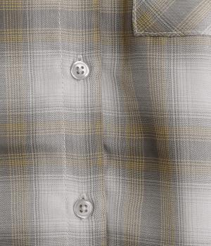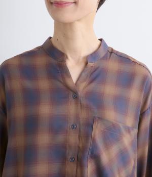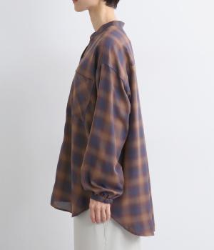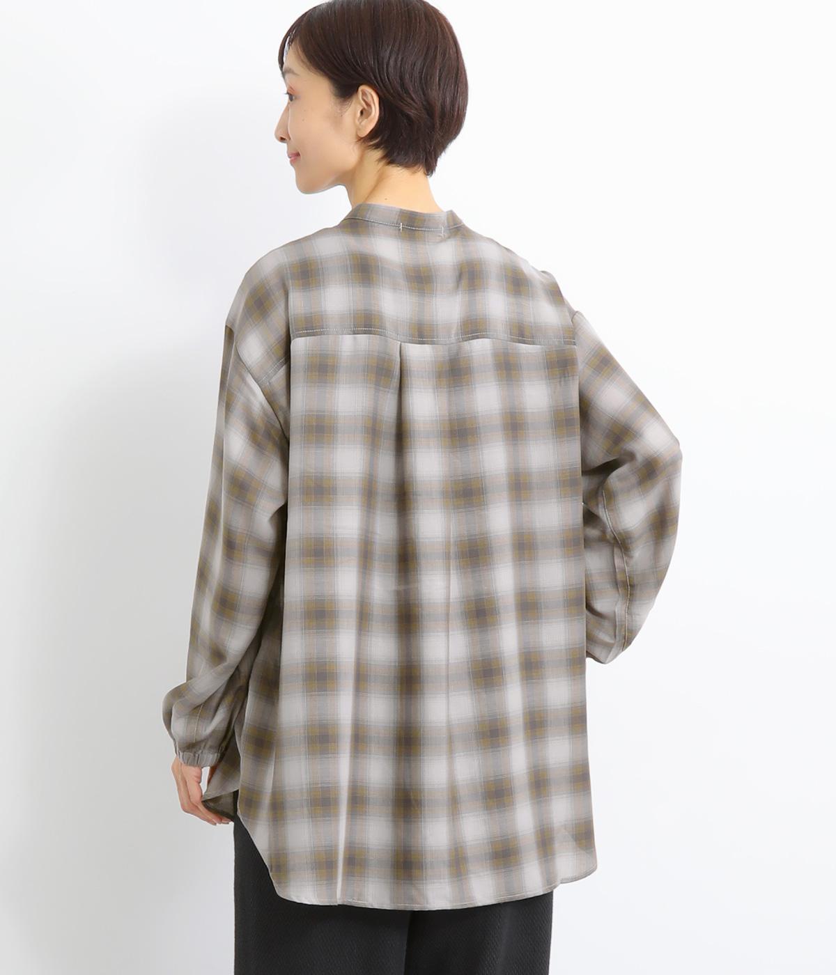 ポリエステルのさらっとしたオンブレーチェック生地です。生地は透け感が気になりにくい薄手生地なので、羽織りものとしても着用可能です。