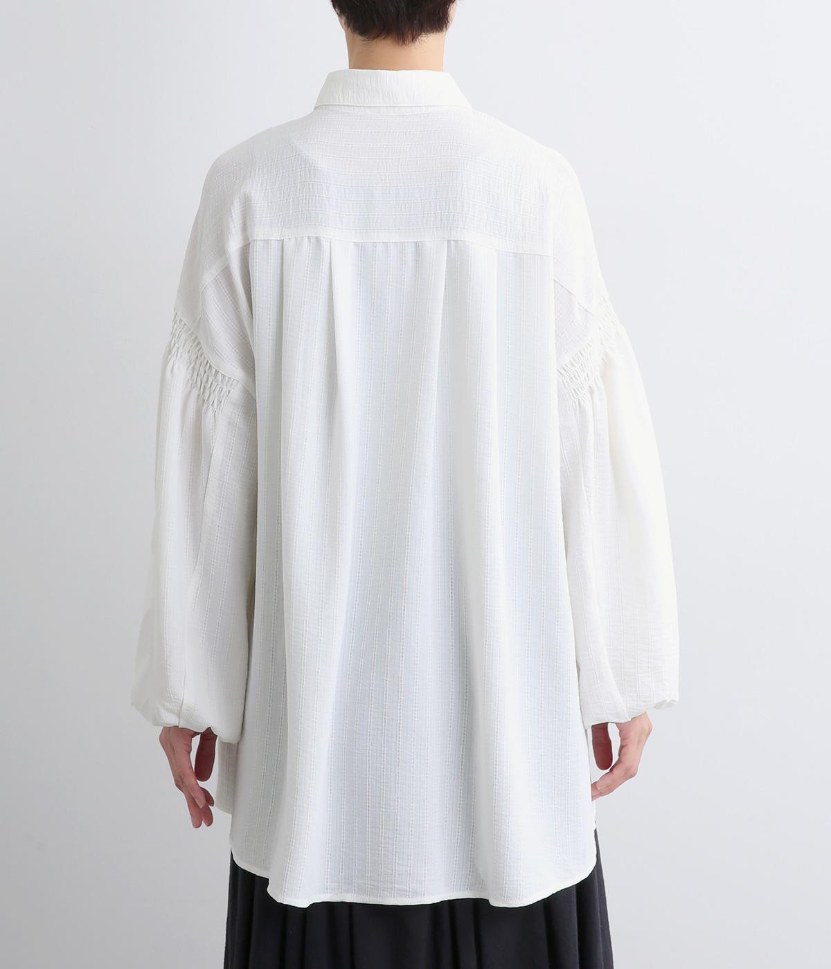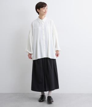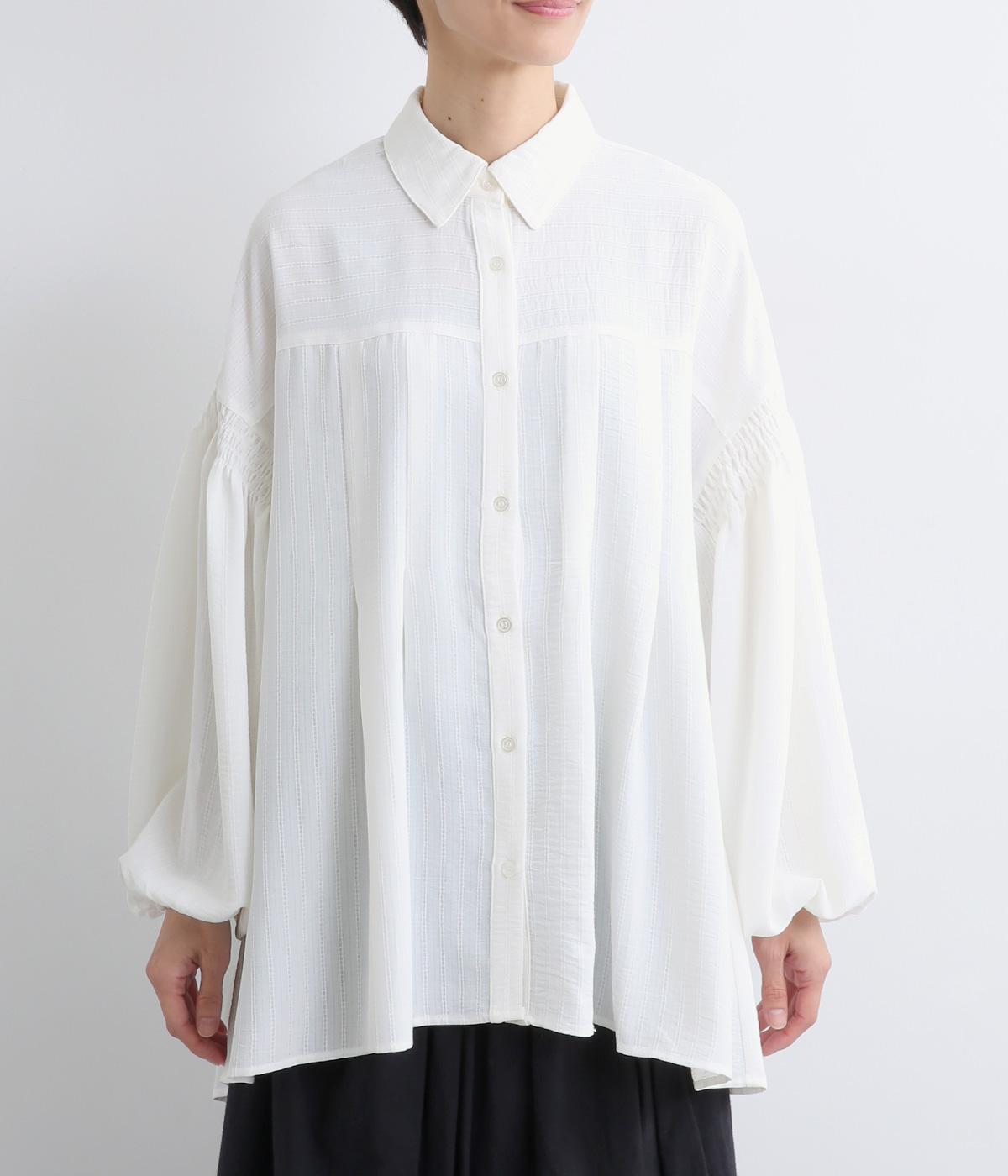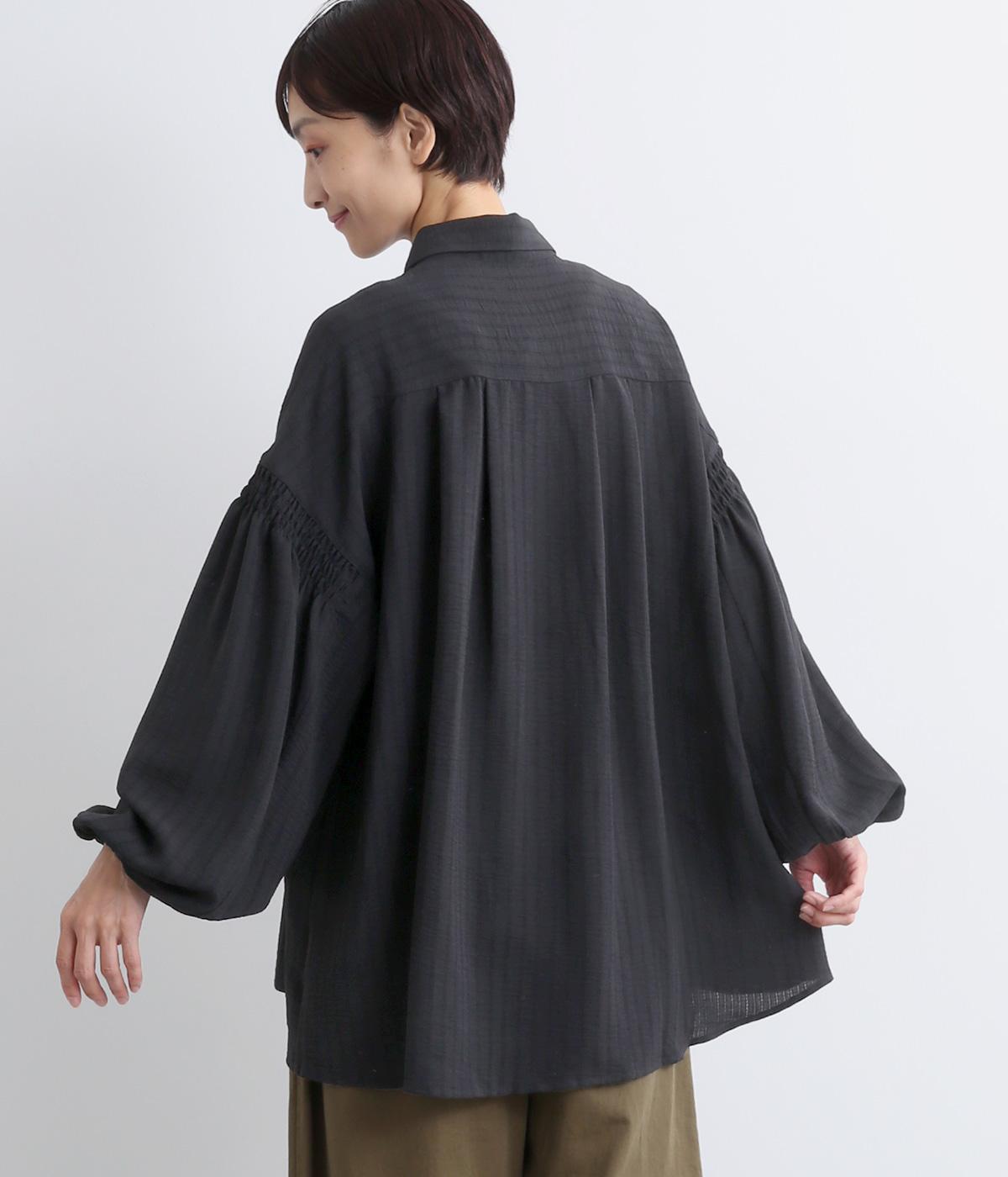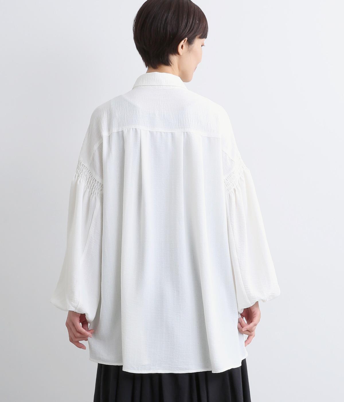 前後に深いタックを2本ずつ入れてボリュームをだして、前後差のある着丈に仕立てたチュニックブラウスです。袖山にシャーリングゴムギャザーをあしらったボリューム袖もポイントに。袖口はゴム入りで、袖丈の調節も可能です。