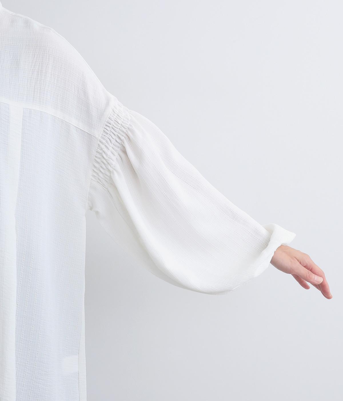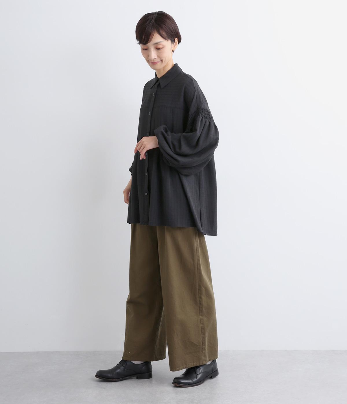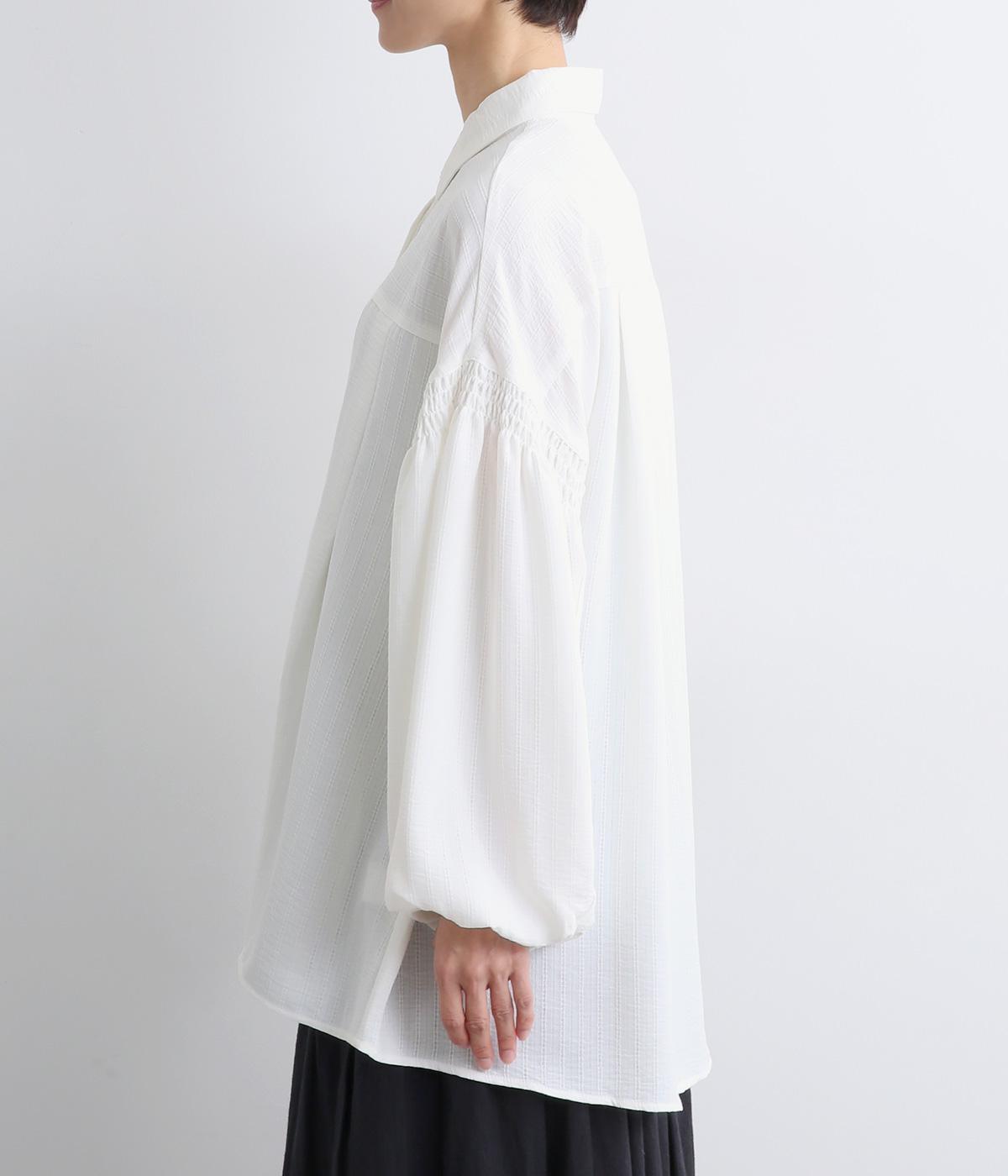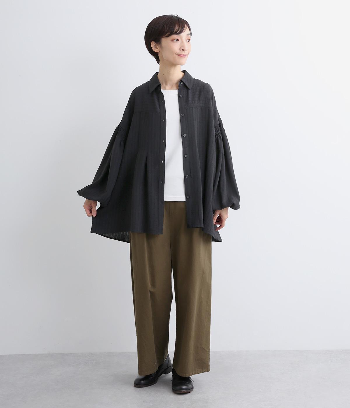 前後に深いタックを2本ずつ入れてボリュームをだして、前後差のある着丈に仕立てたチュニックブラウスです。袖山にシャーリングゴムギャザーをあしらったボリューム袖もポイントに。袖口はゴム入りで、袖丈の調節も可能です。