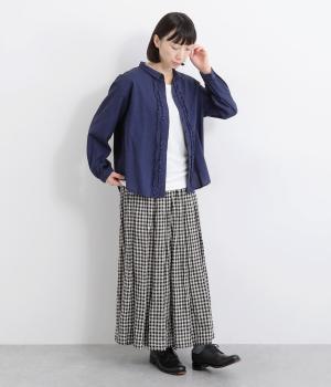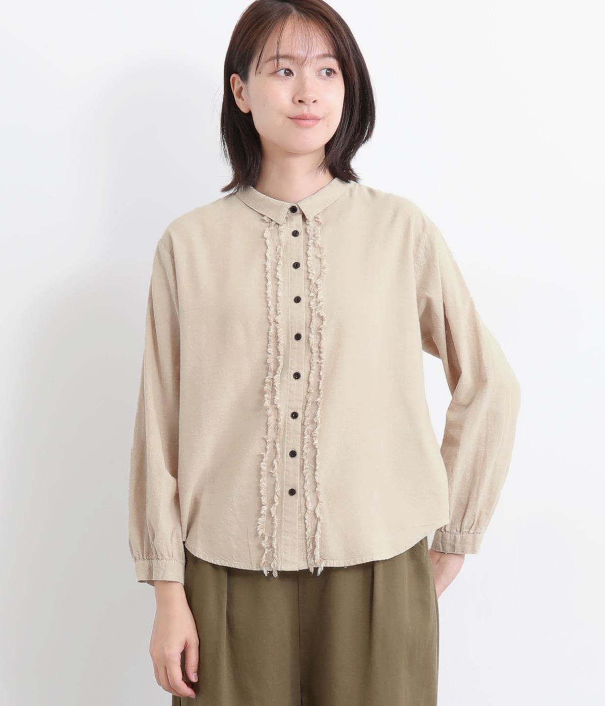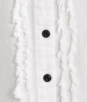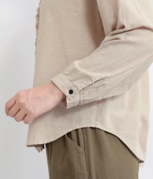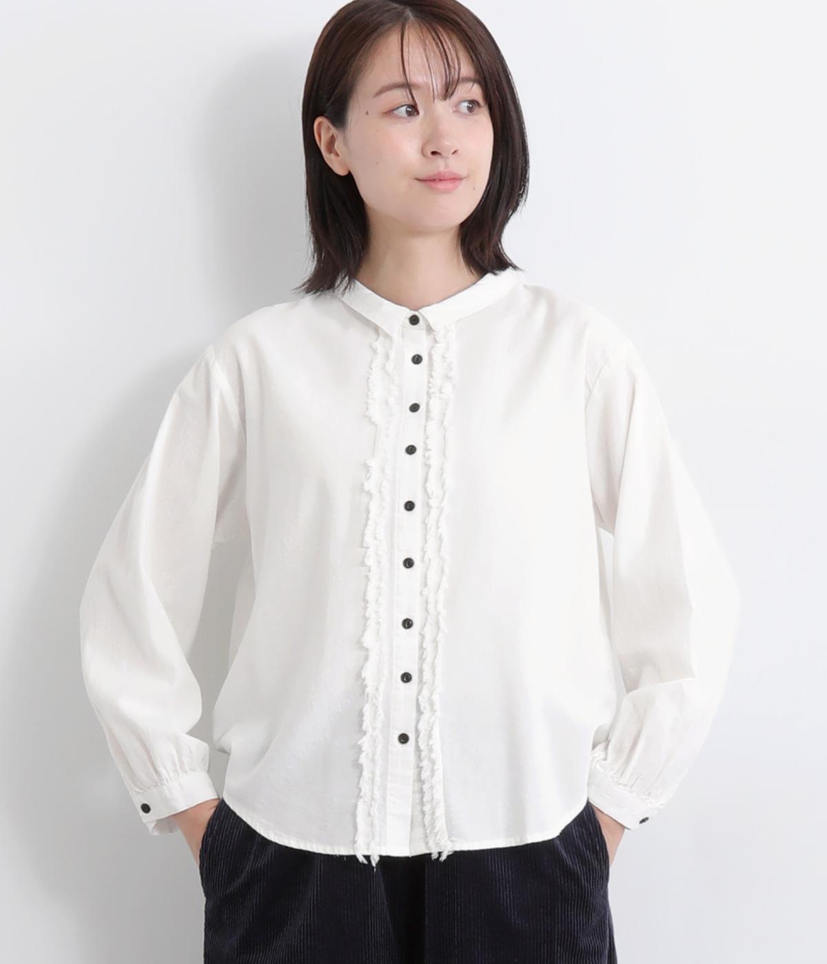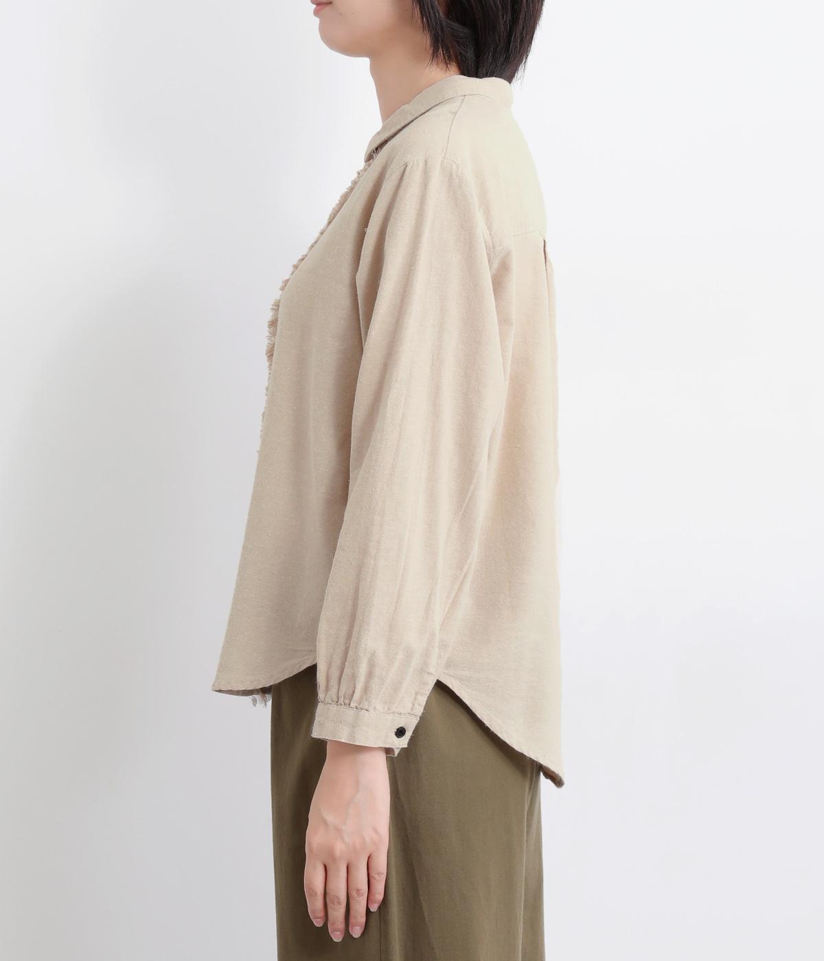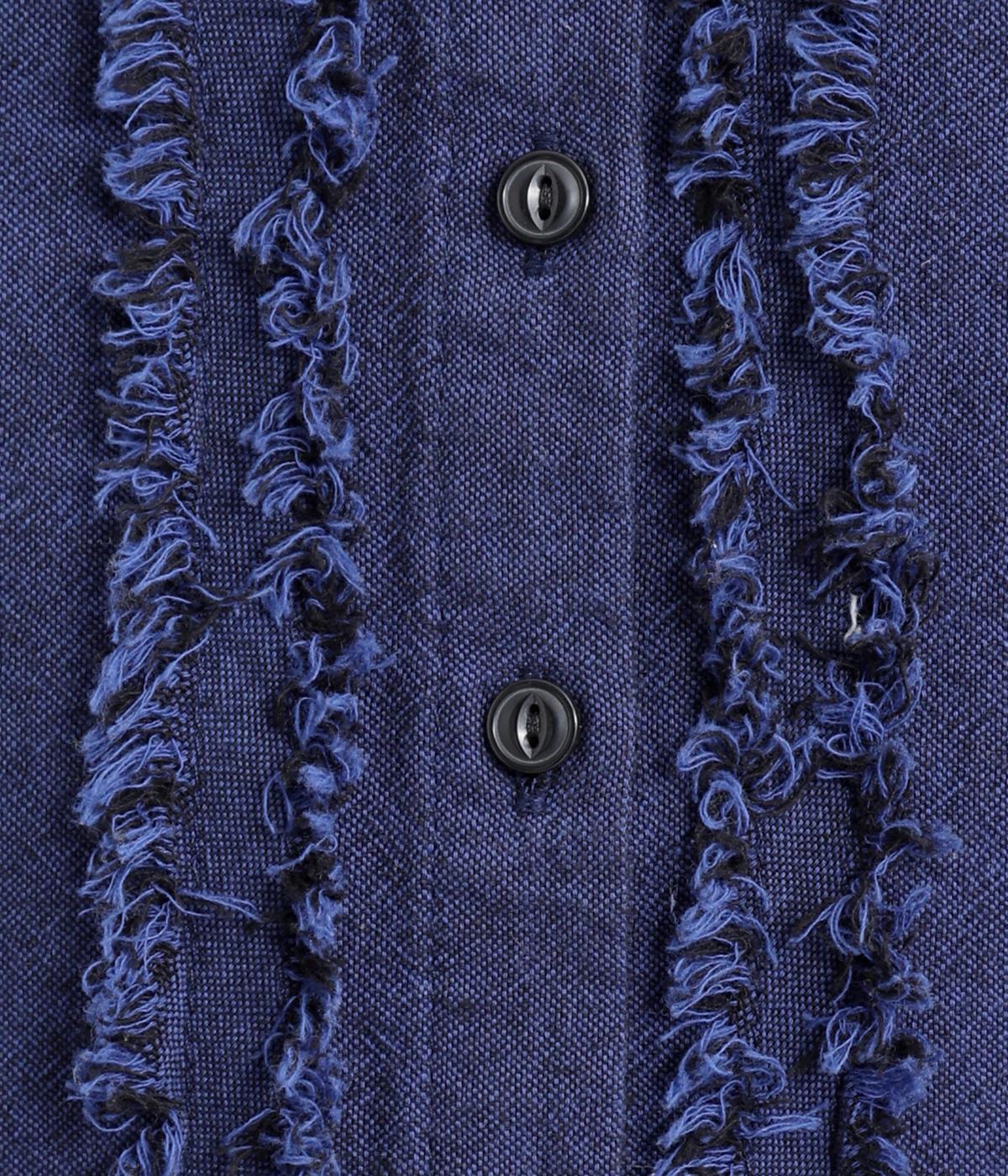 前立てに沿ったフリンジディテールが目を惹く一枚。黒ボタンもタテラインをつくり、すっきりとした印象に仕上がっています。シャツのようなメイン使いから羽織りまで、幅広く着まわせるのも魅力のひとつ。すっきりしたカフスと小さな襟も◎。