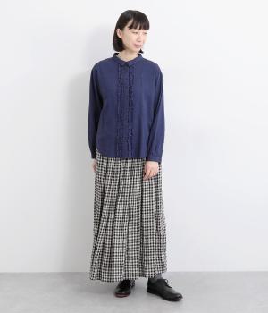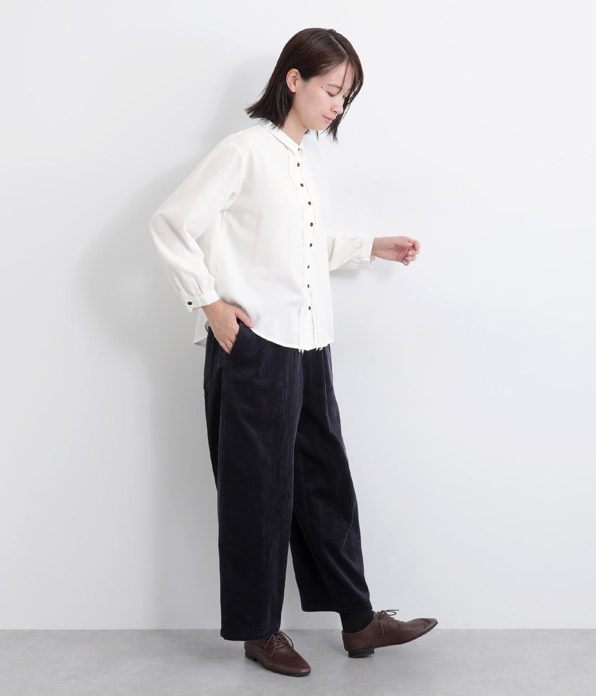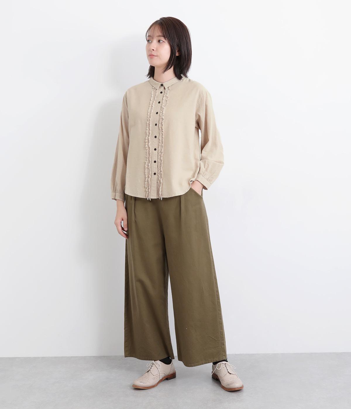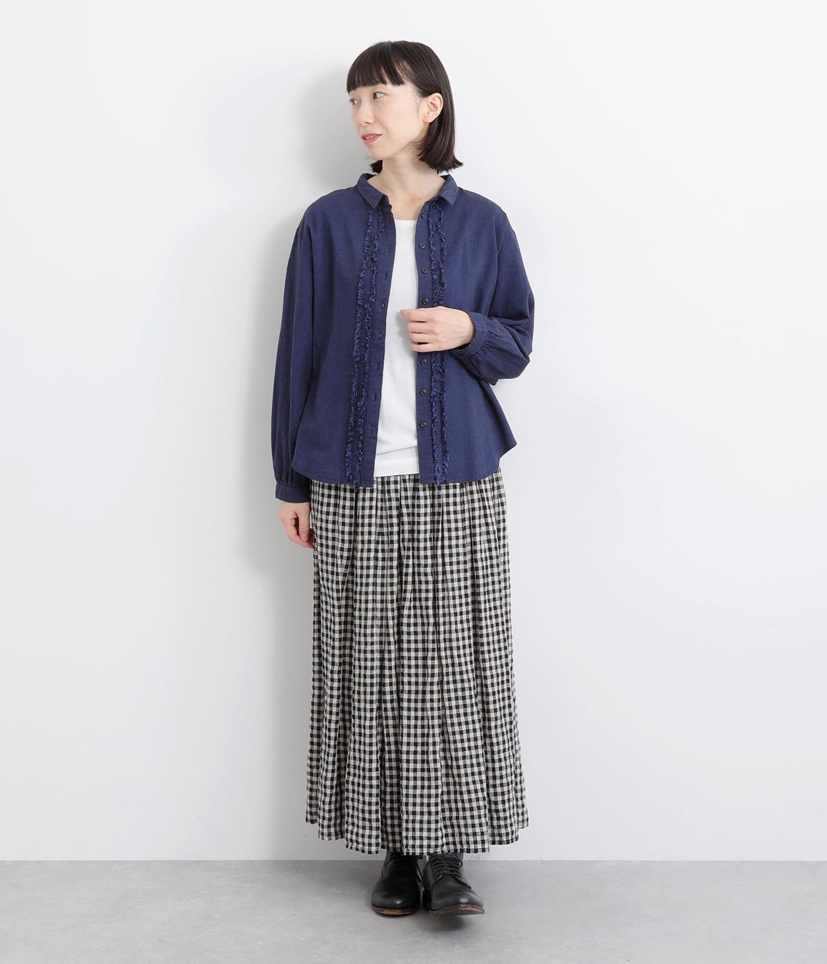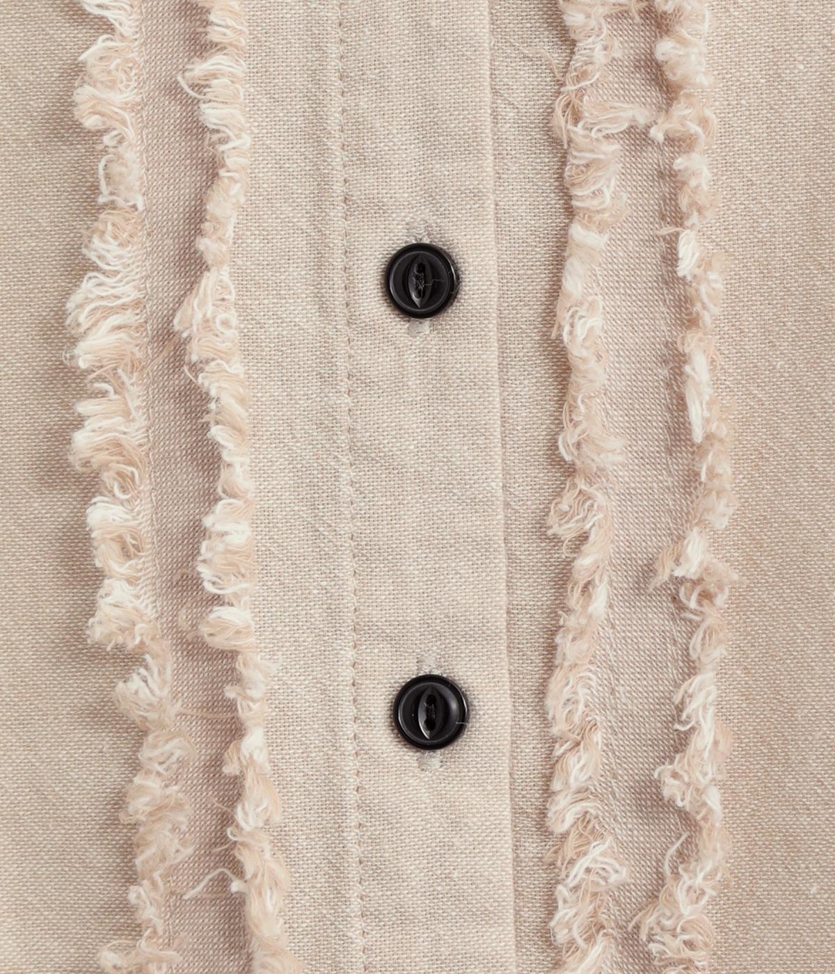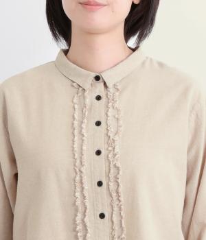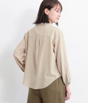 前立てに沿ったフリンジディテールが目を惹く一枚。黒ボタンもタテラインをつくり、すっきりとした印象に仕上がっています。シャツのようなメイン使いから羽織りまで、幅広く着まわせるのも魅力のひとつ。すっきりしたカフスと小さな襟も◎。