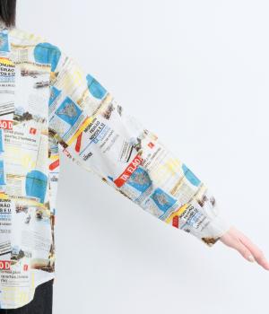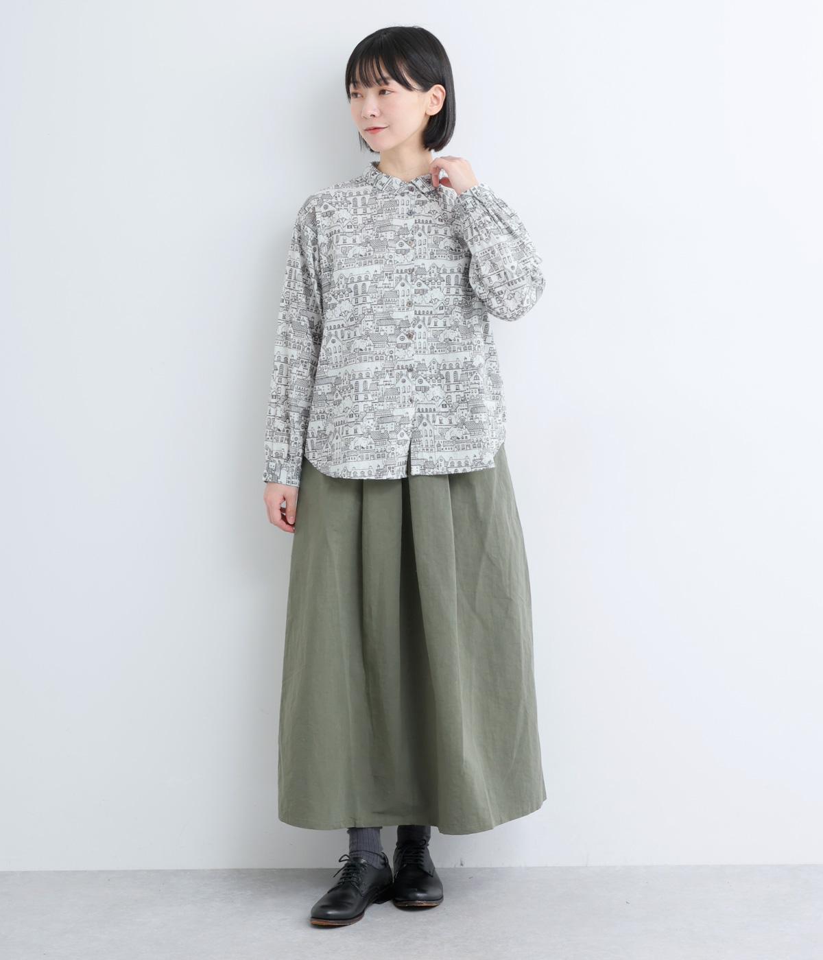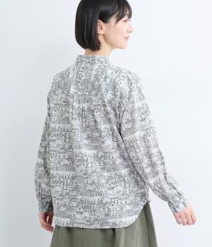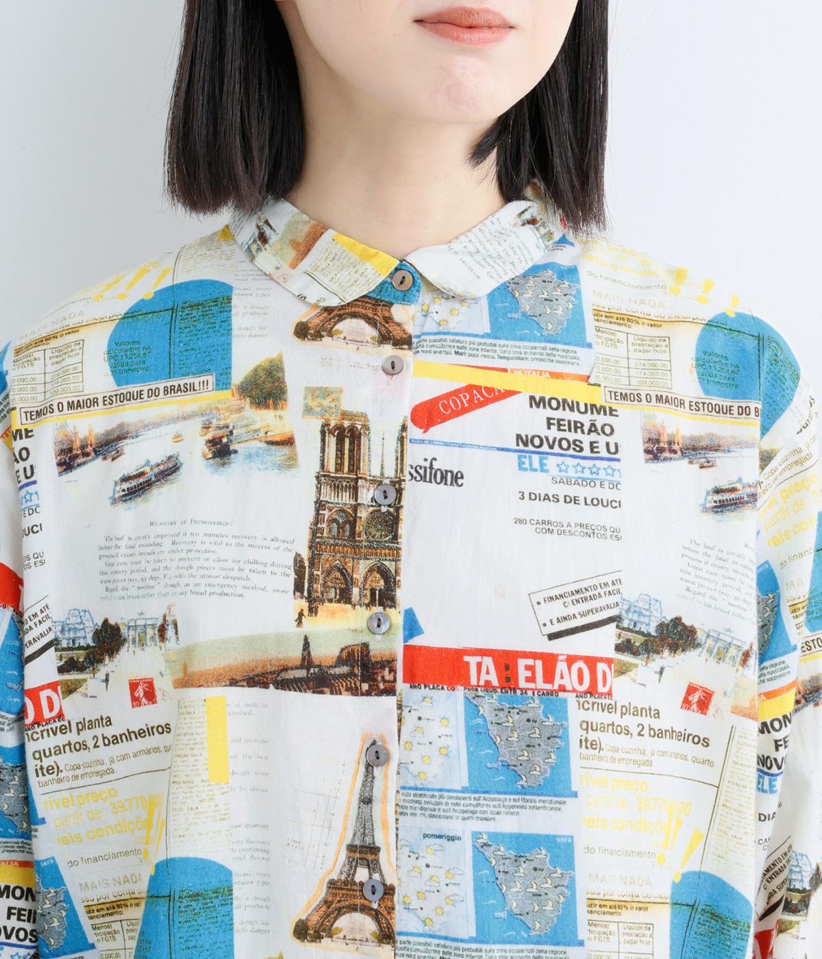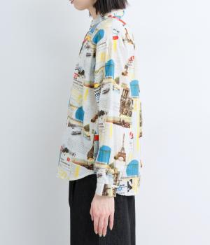 ベーシックなレギュラータイプなのでスタイリングしやすく、それでいて総柄プリントが着こなしのポイントになる一枚。チビ襟で顔まわりはすっきりと。後ろ着丈をやや長めにしているので、ラフなトップスアウトもさまになります。