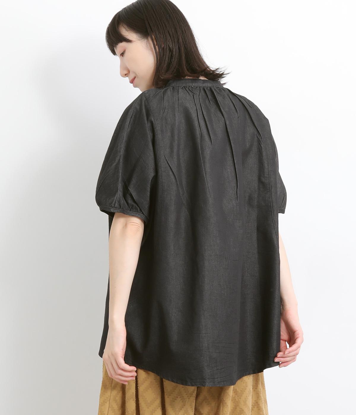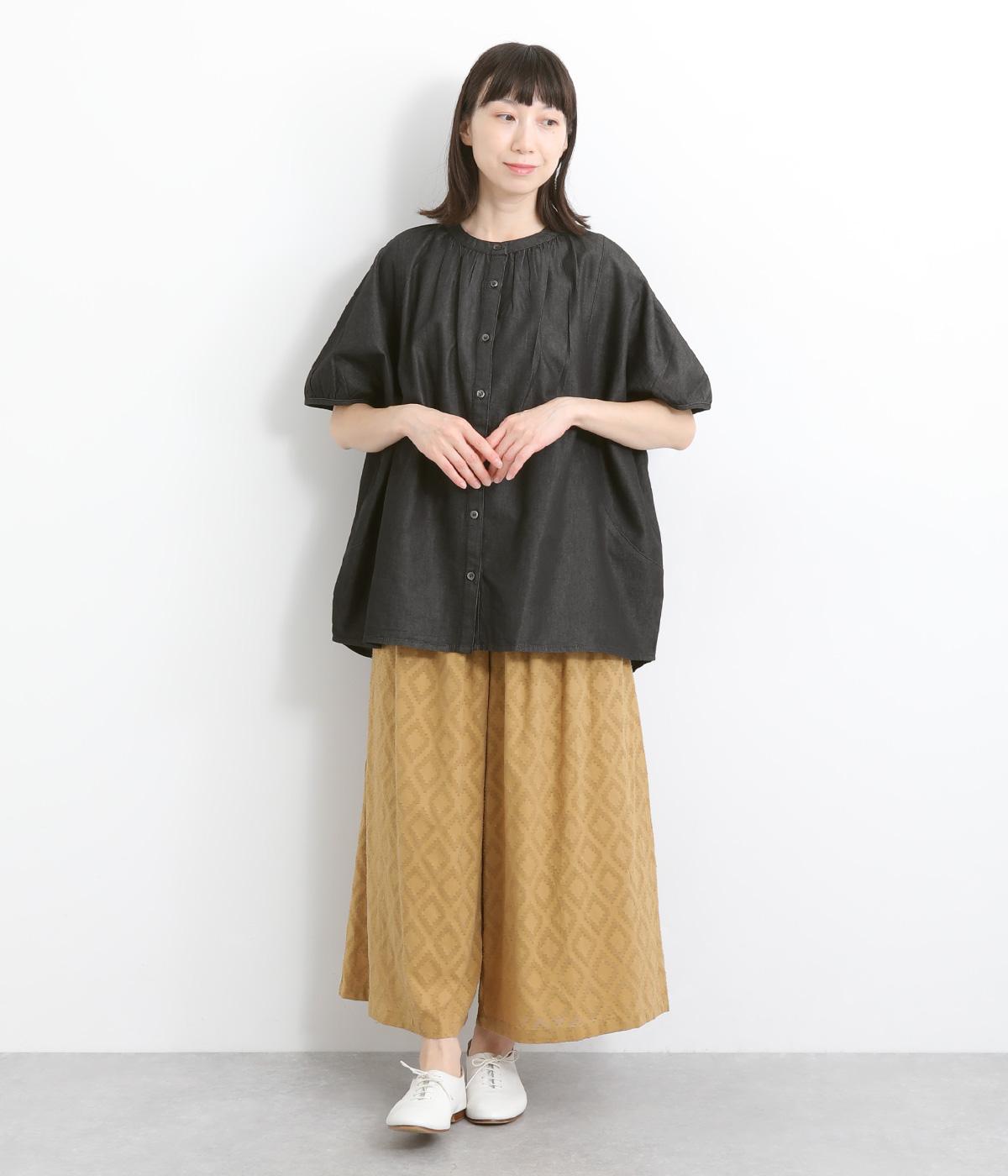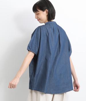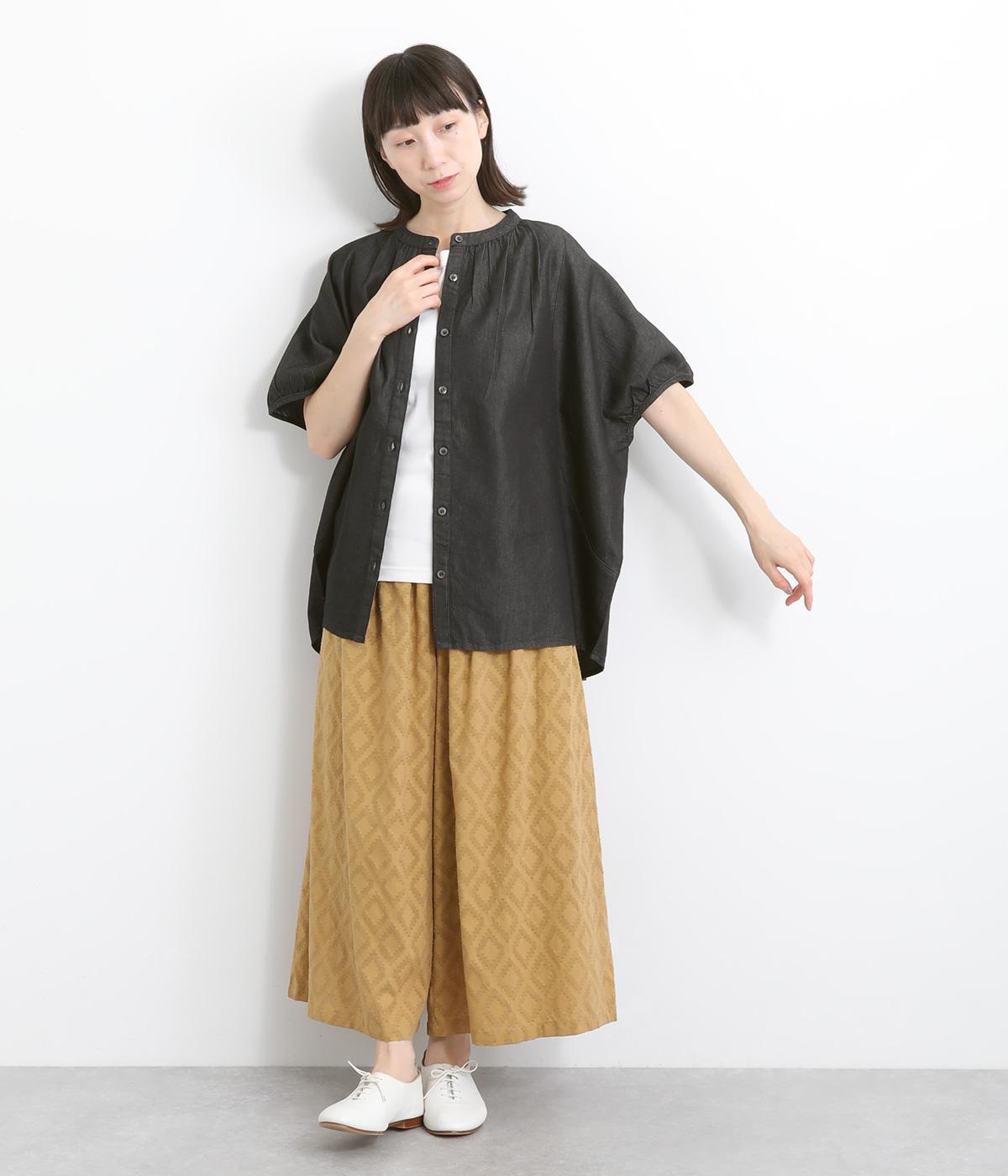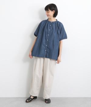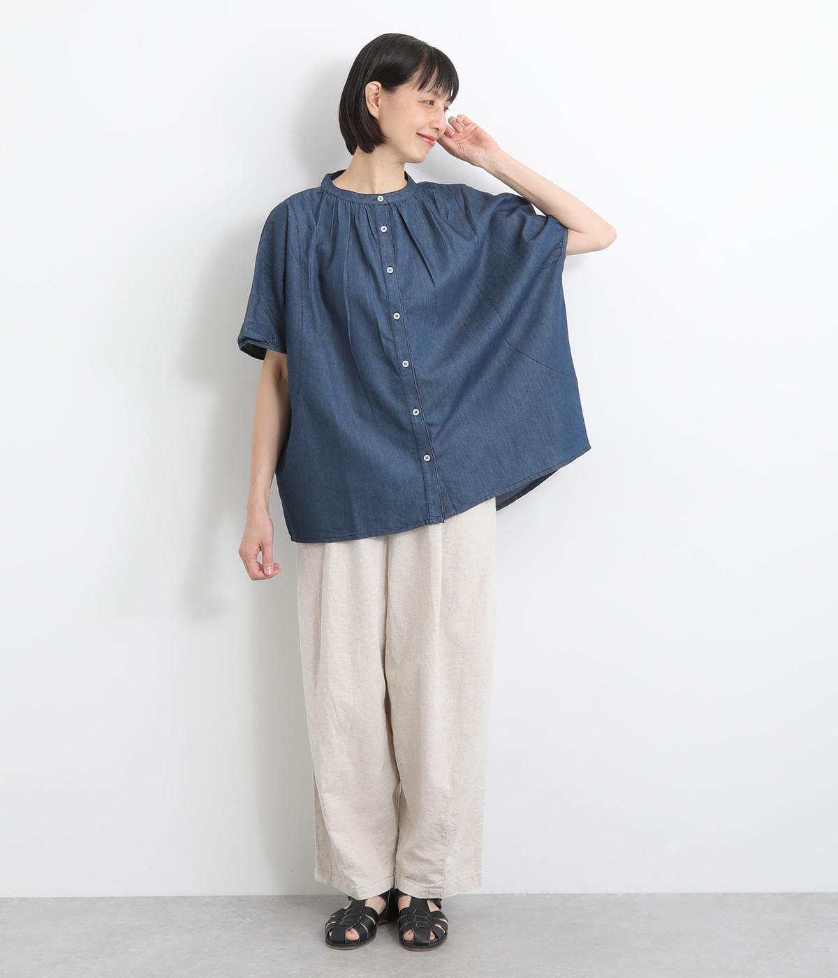 ポンチョのようにたっぷりとしたボックス型シルエットが新鮮なデニムシャツです。袖口はギャザーを寄せてポイントを持たせました。後ろ身頃はやや長めに設定してラフに羽織るだけでもさまになります。