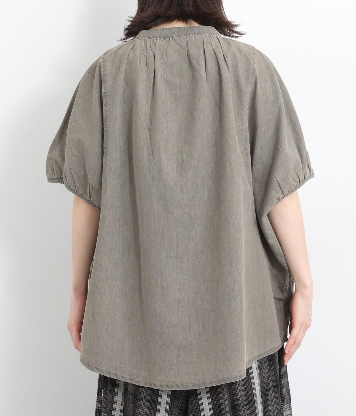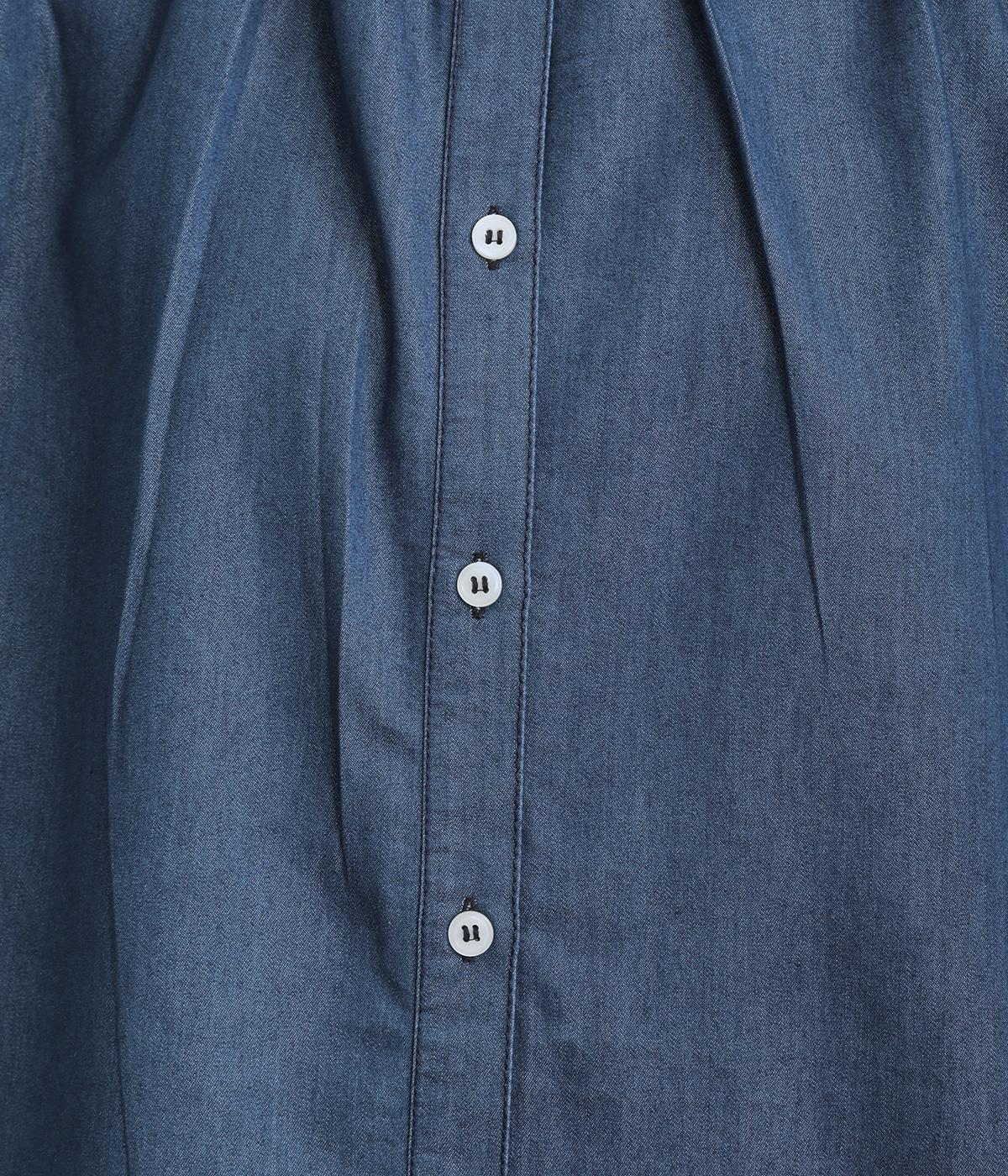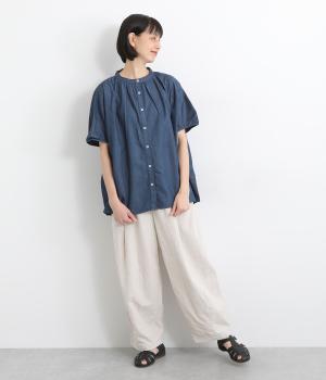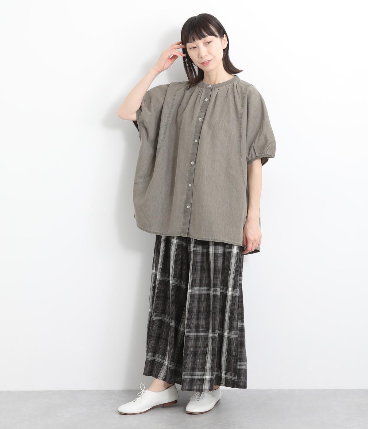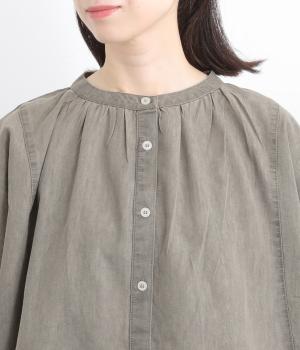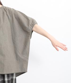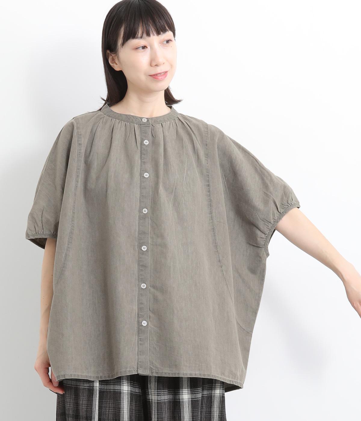 ポンチョのようにたっぷりとしたボックス型シルエットが新鮮なデニムシャツです。袖口はギャザーを寄せてポイントを持たせました。後ろ身頃はやや長めに設定してラフに羽織るだけでもさまになります。