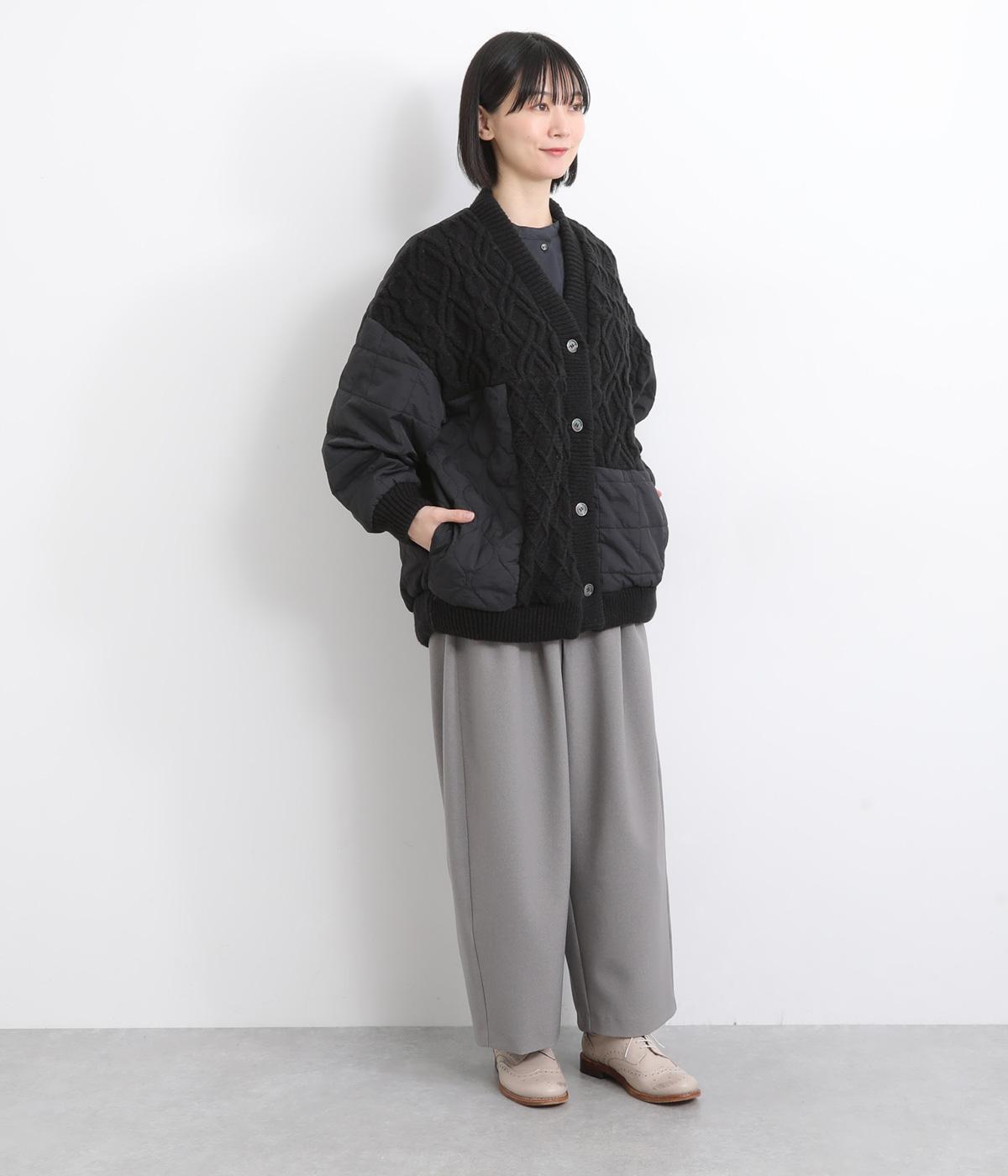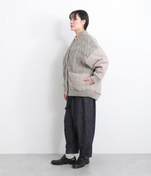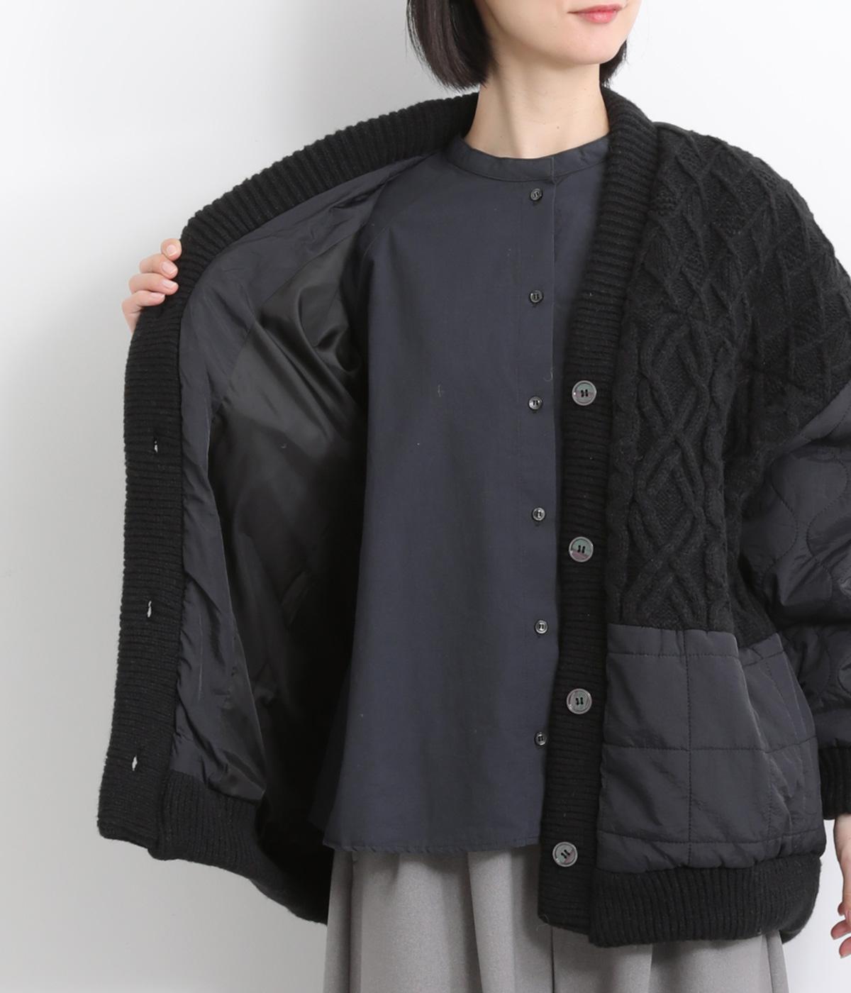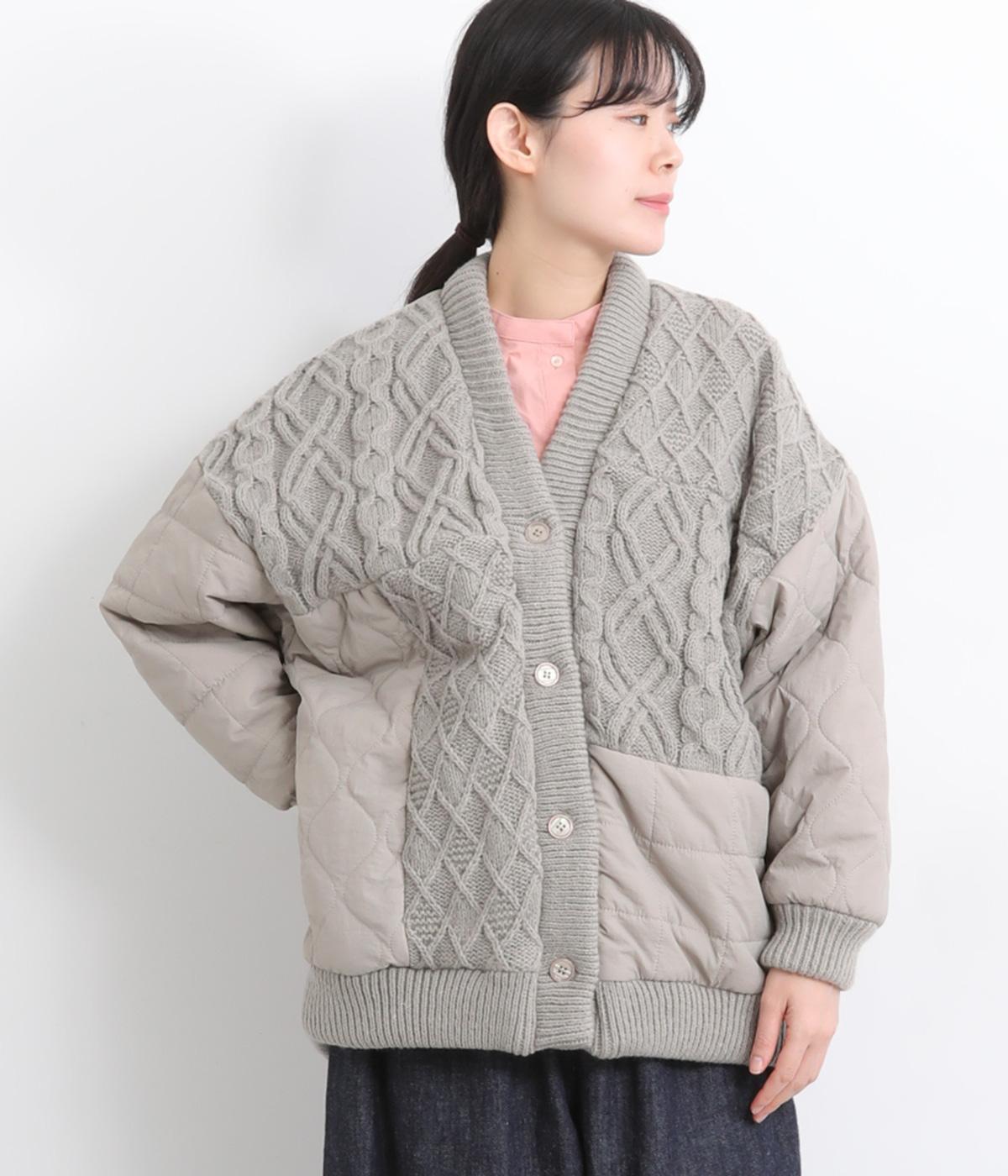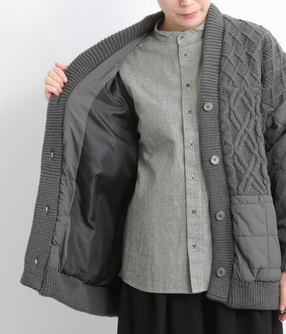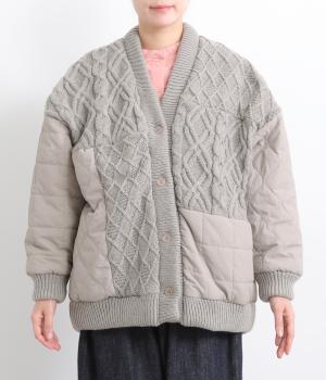 ステッチに変化をつけたキルティングとアラン模様のニットをドッキングしたカーディガン。さまざまな柄の組み合わせをシックな雰囲気でバランスよくまとめました。ライトアウターとしても活躍するアイテムです。