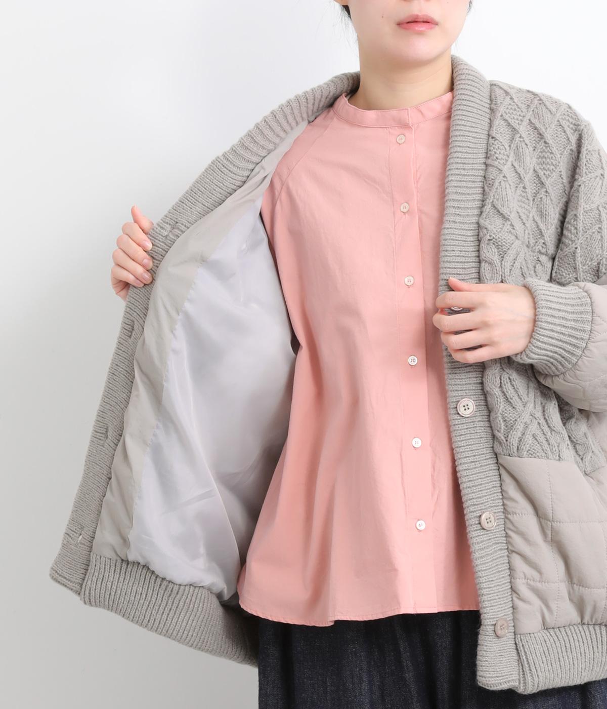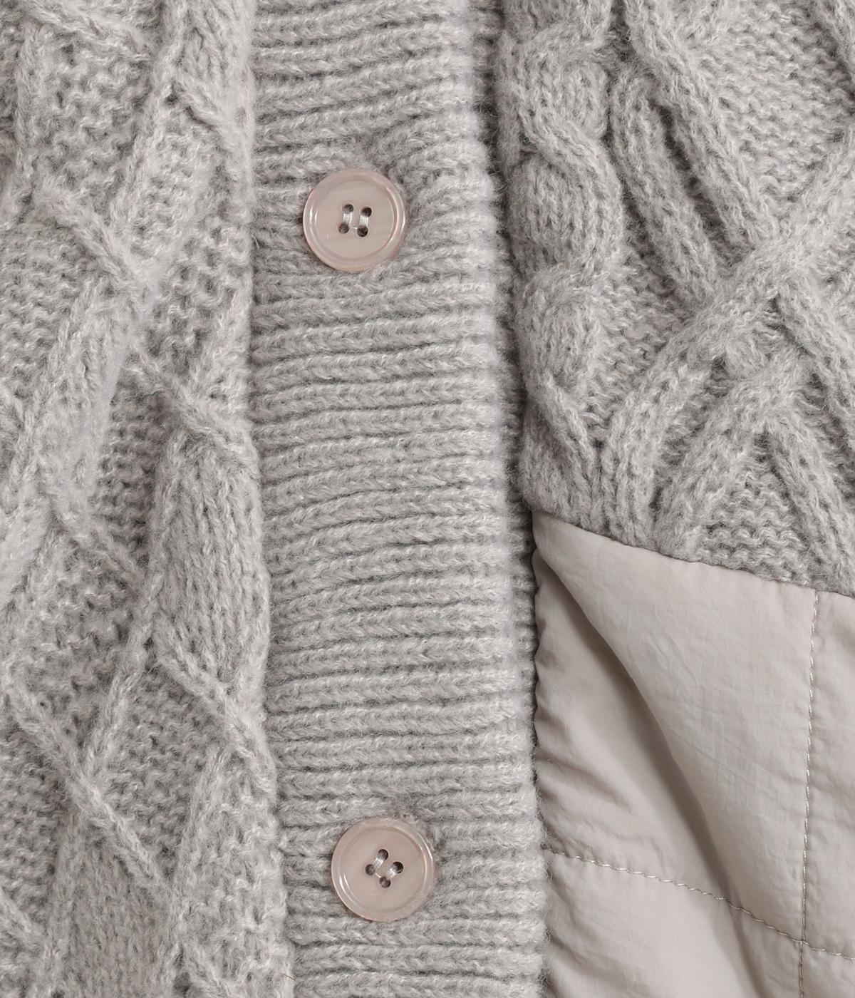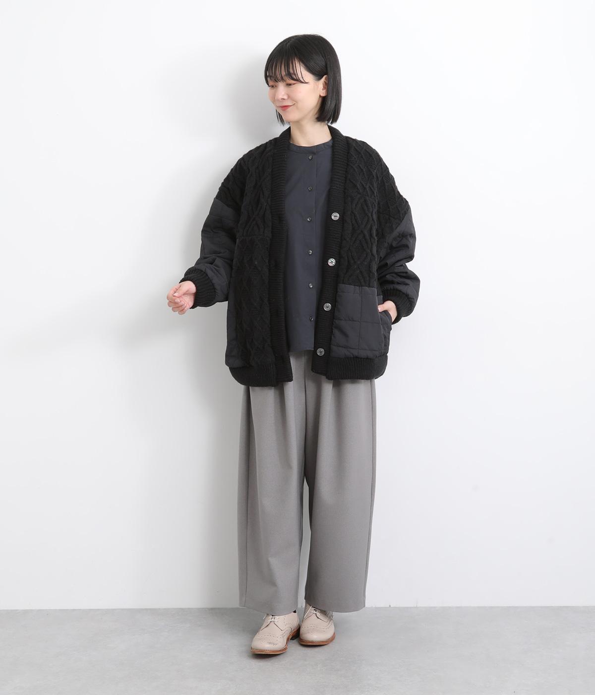 ステッチに変化をつけたキルティングとアラン模様のニットをドッキングしたカーディガン。さまざまな柄の組み合わせをシックな雰囲気でバランスよくまとめました。ライトアウターとしても活躍するアイテムです。