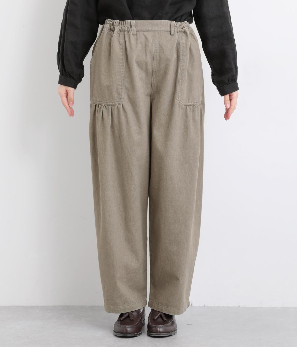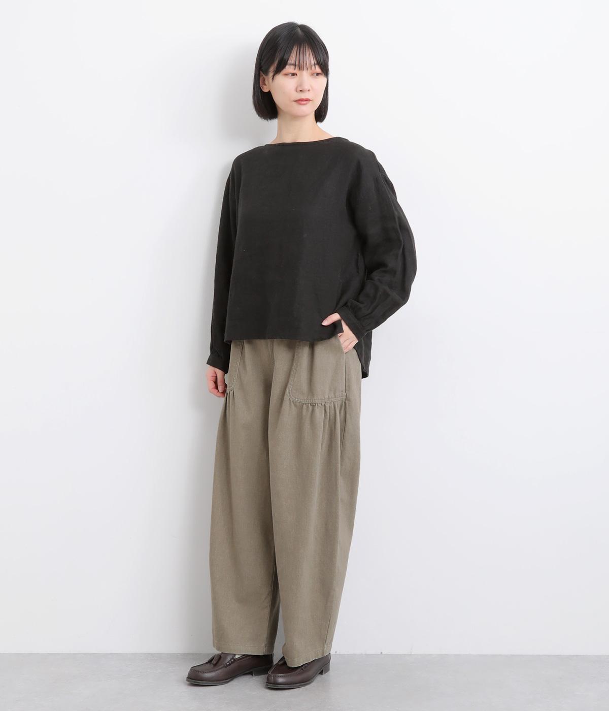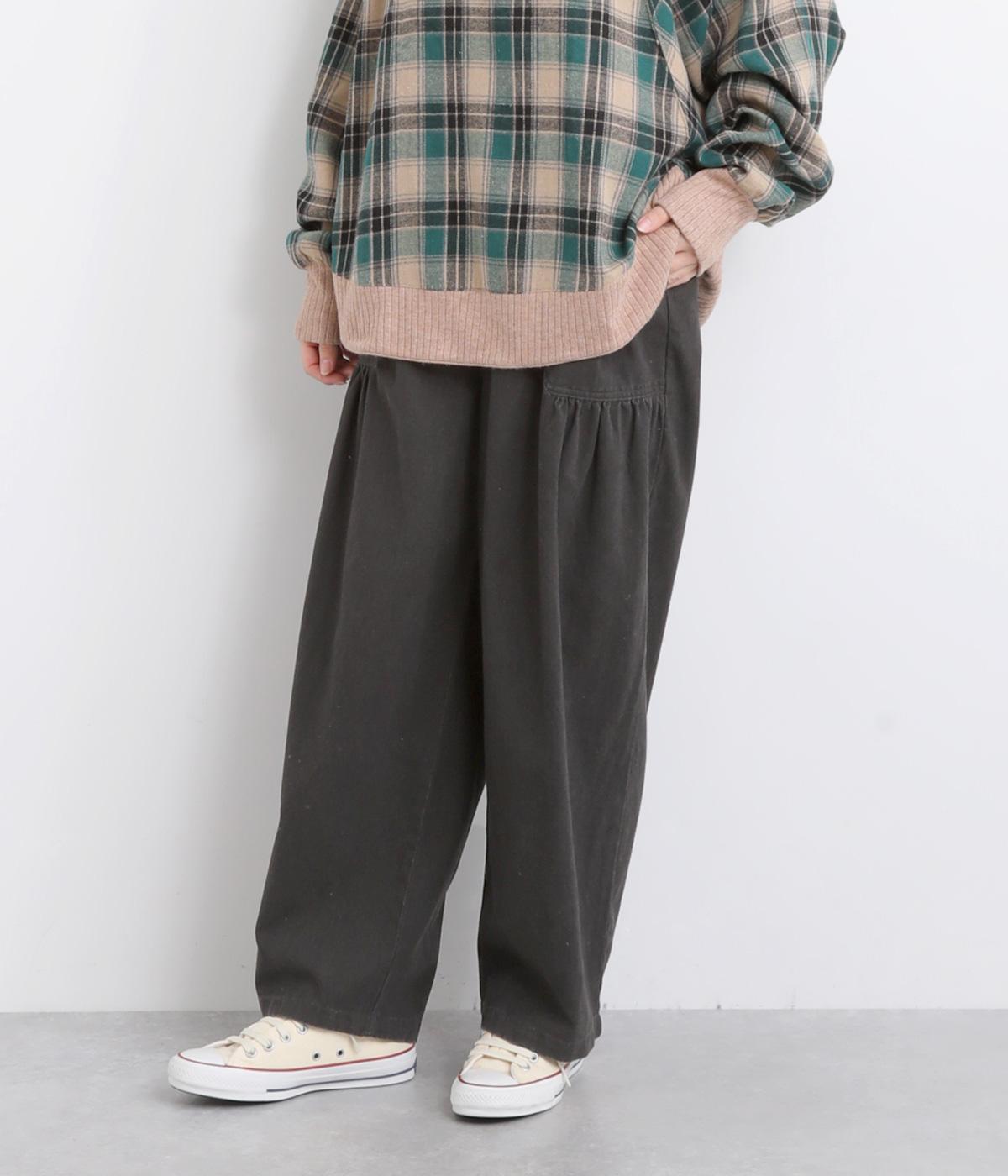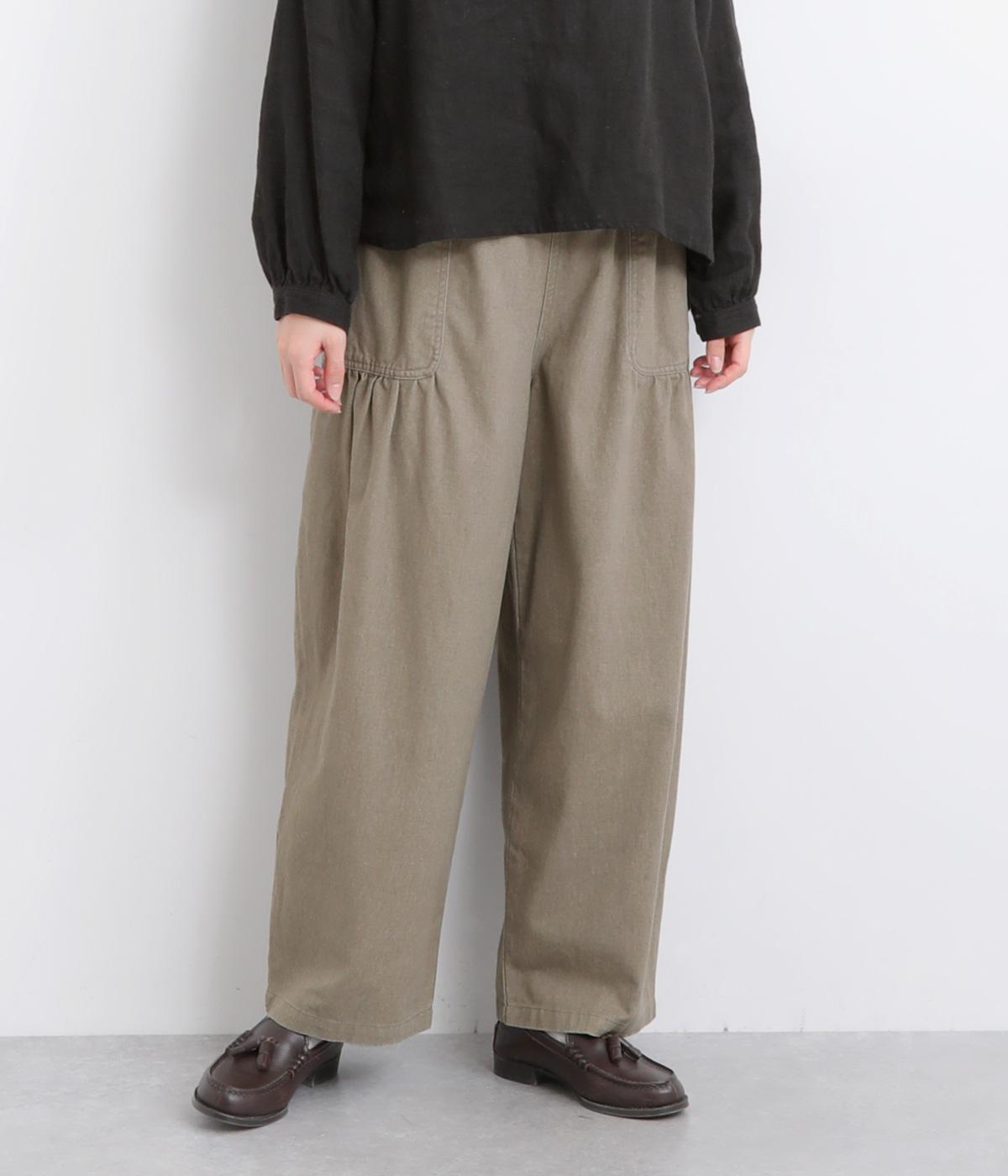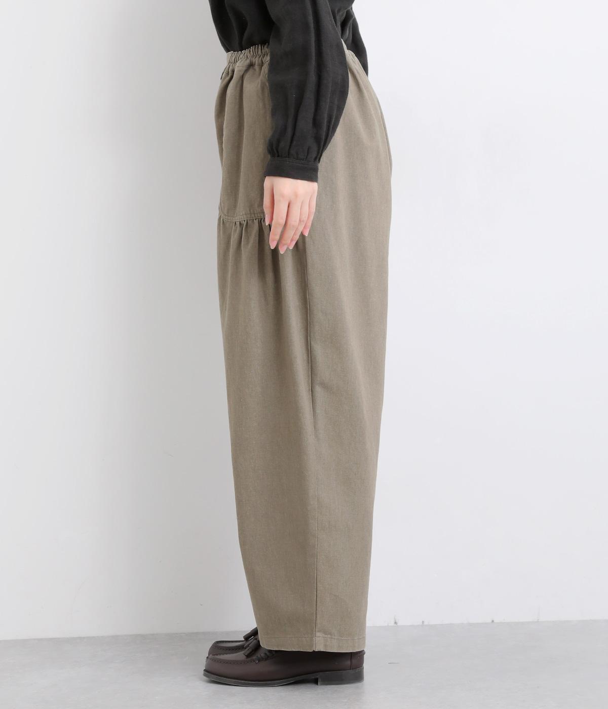 大胆に配置したベイカーポケットと、ウエストに寄せたギャザーが印象的なパンツ。ぽってりとした丸みを描くバルーンシルエットは、動くたびに表情が生まれ、抜け感のある着こなしを叶えます。裾へ向かってゆるやかにすぼまるラインが足元をすっきりと見せ、野暮ったくならないのも魅力です。