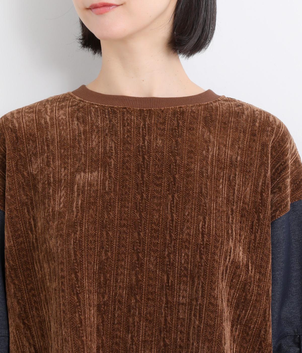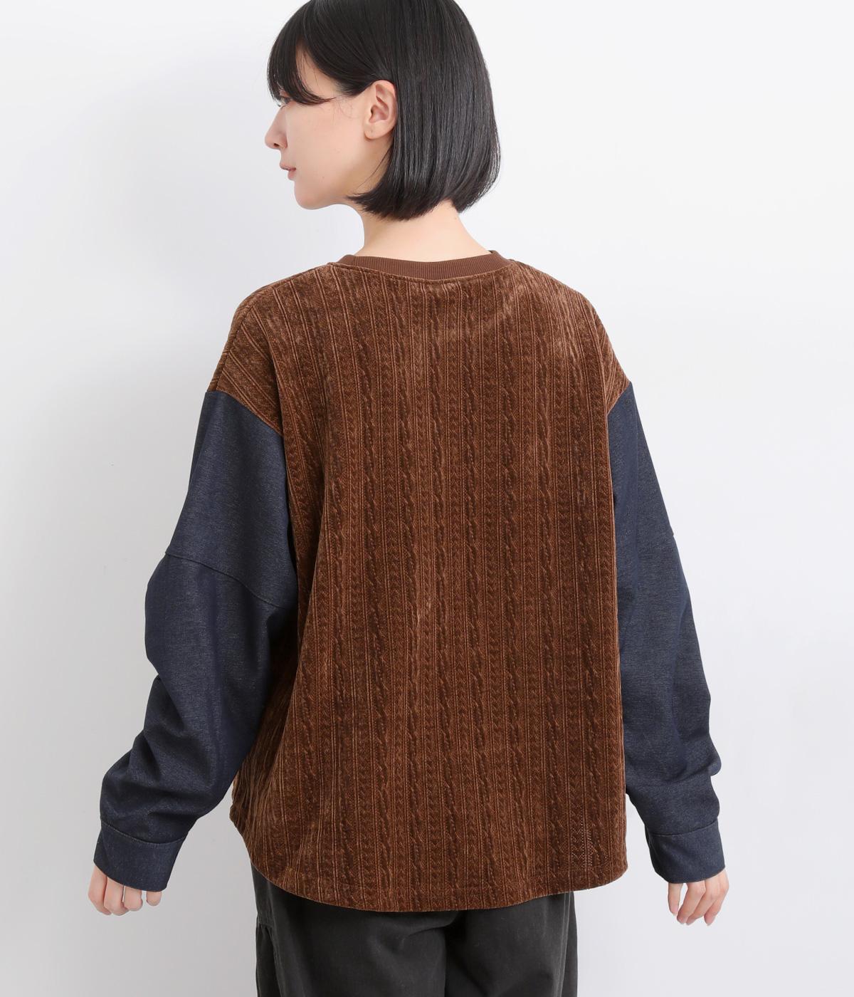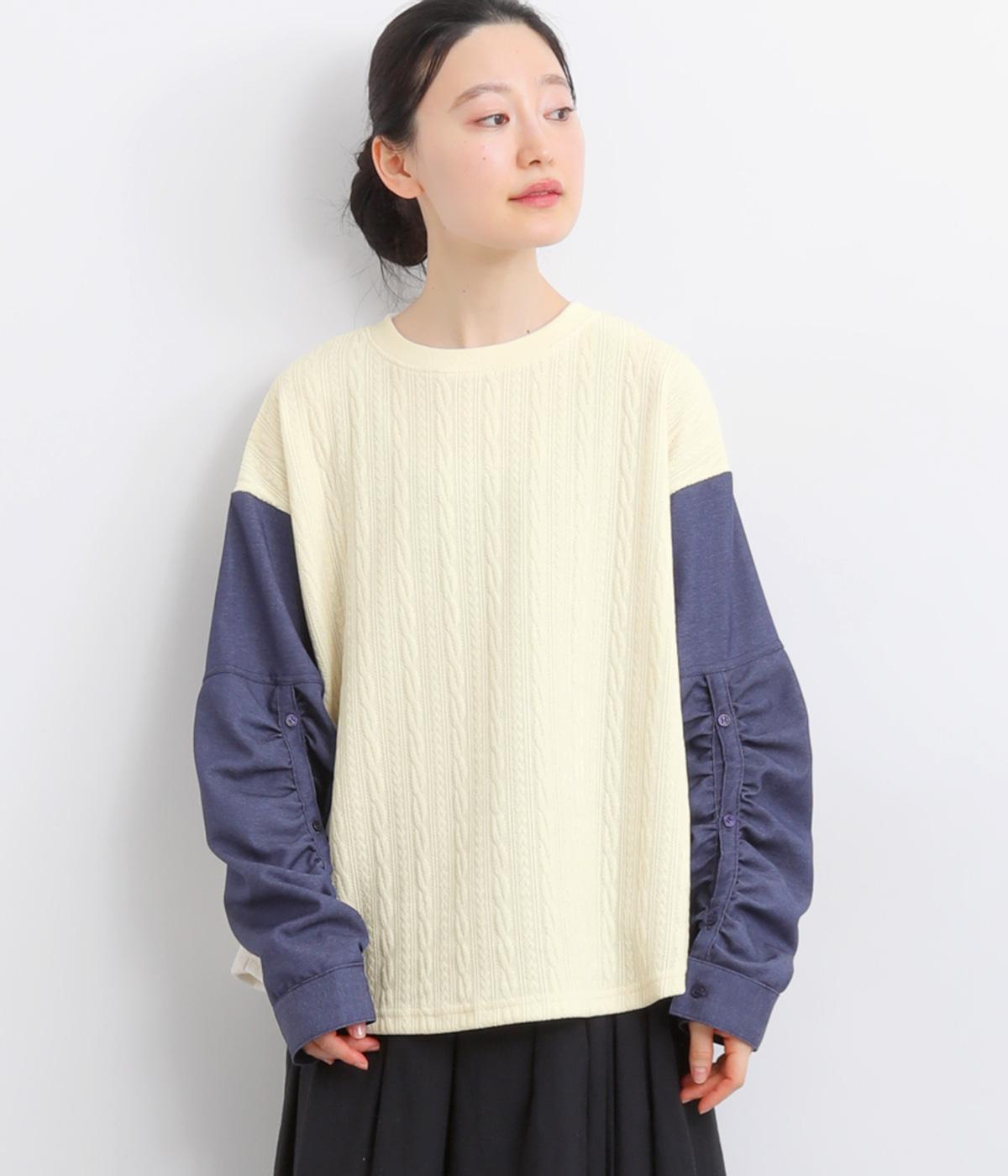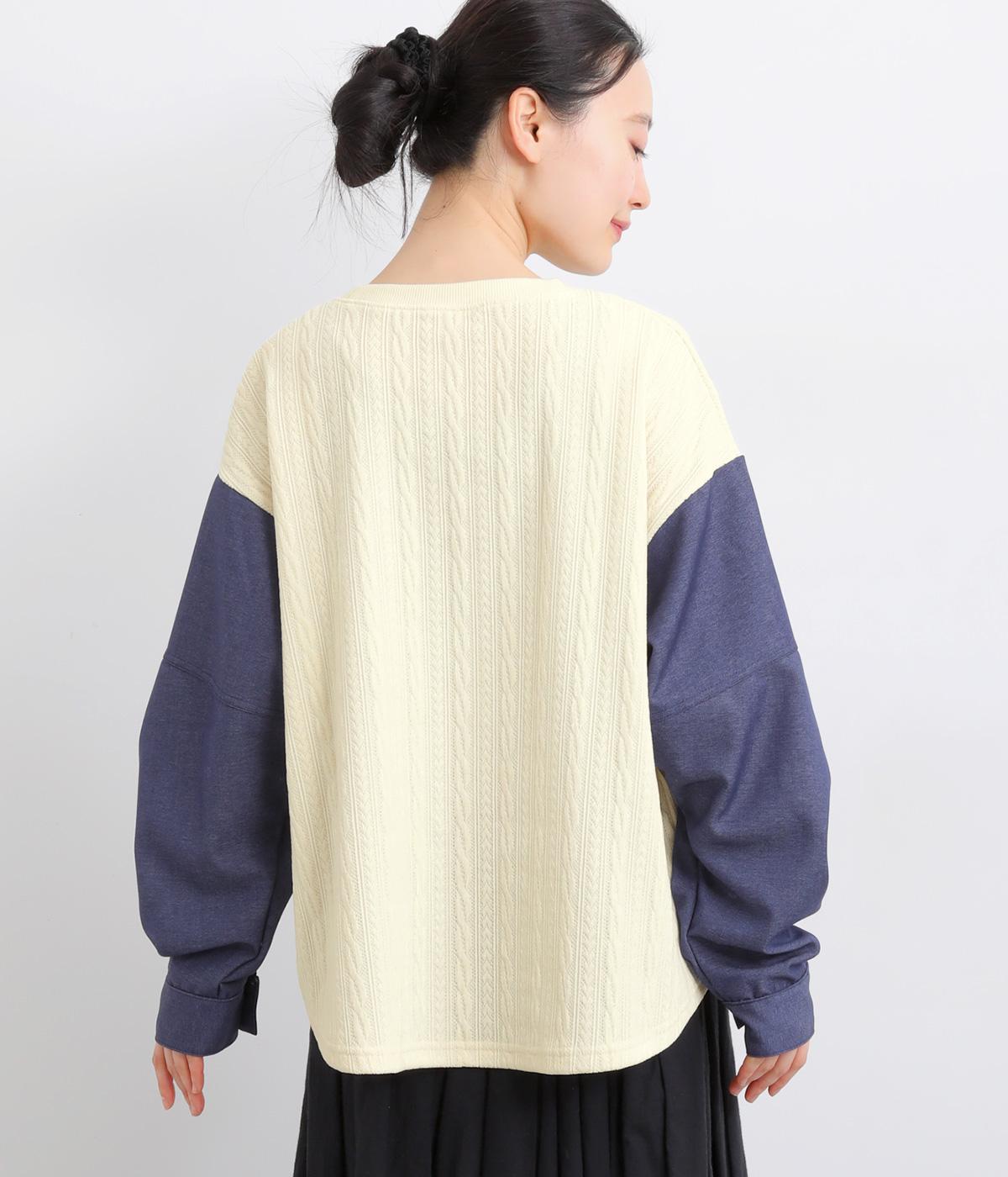 繊細な凹凸が魅力のケーブル編みカットソーは、空気をふくんだようなやさしいタッチ。袖は薄手のインディゴデニム生地を使用し、さらっとした風合いと上品な光沢感が特徴です。