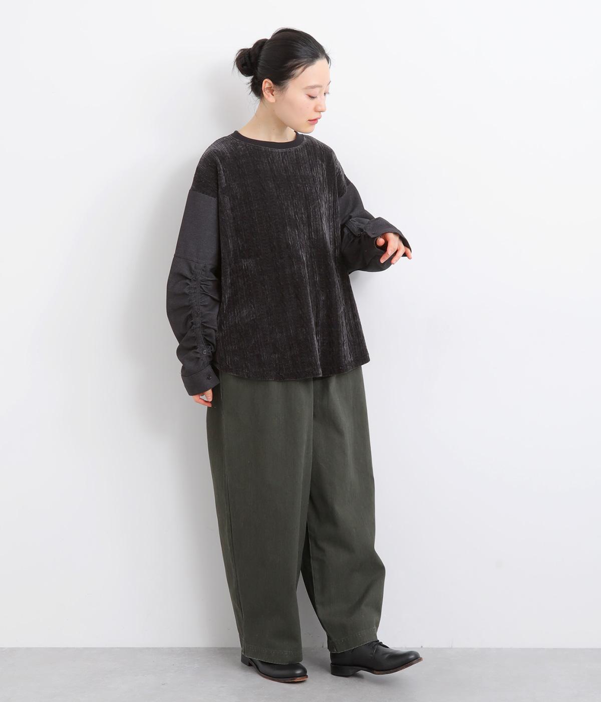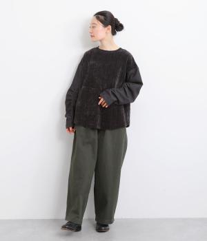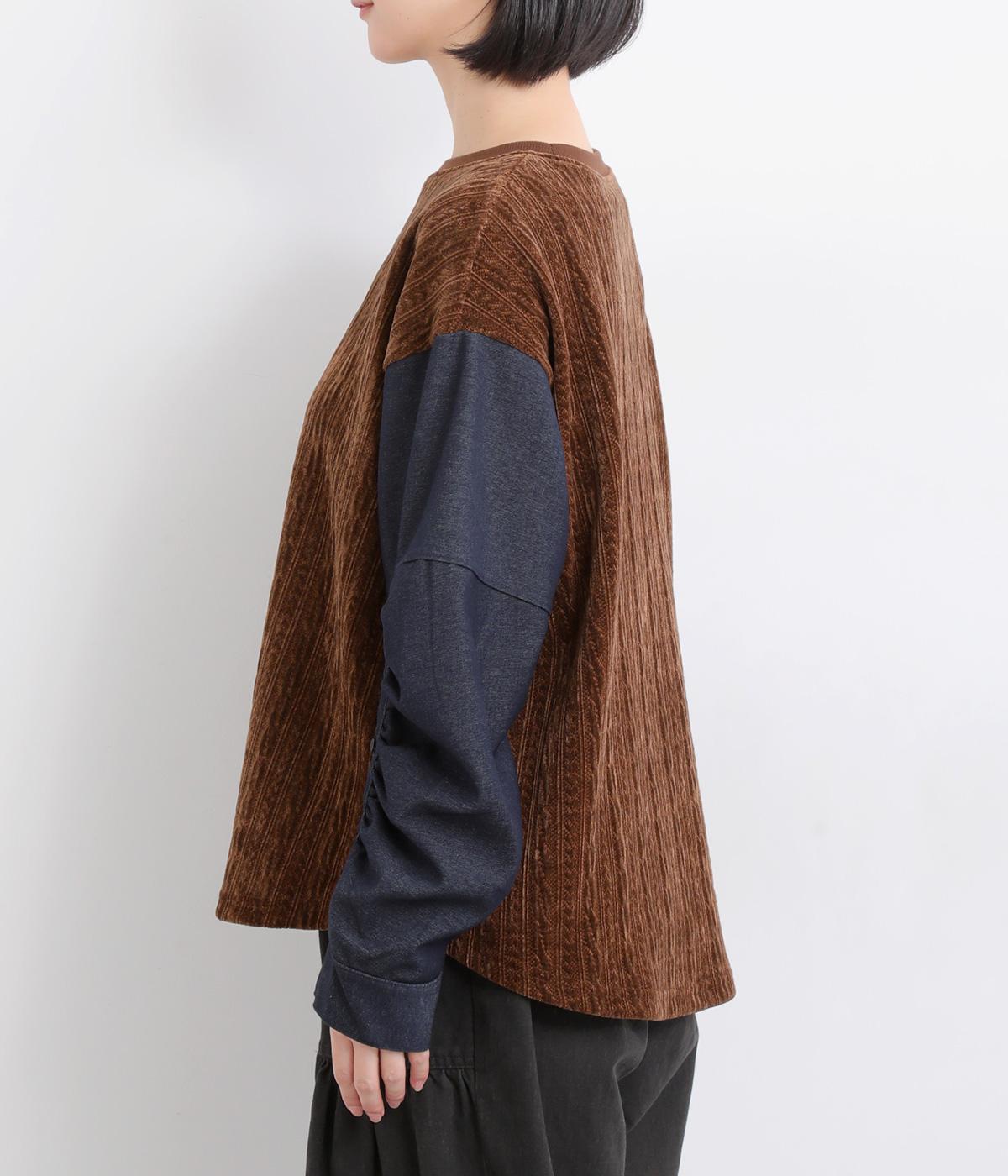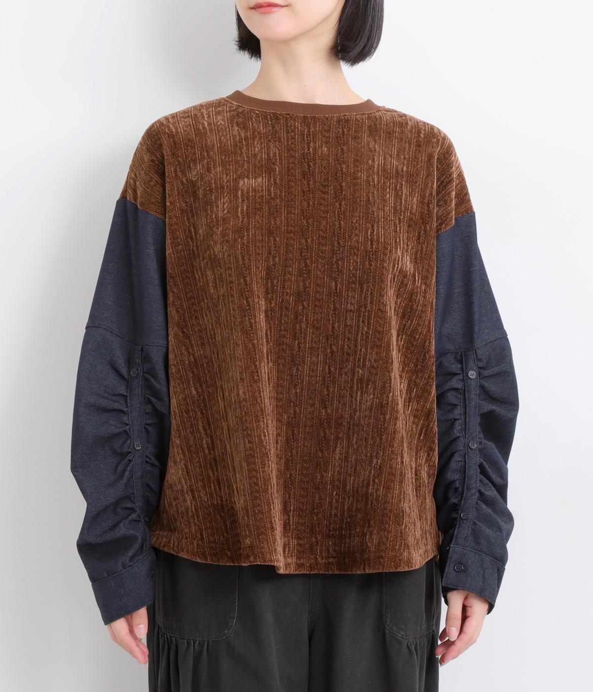 繊細な凹凸が魅力のケーブル編みカットソーは、空気をふくんだようなやさしいタッチ。袖は薄手のインディゴデニム生地を使用し、さらっとした風合いと上品な光沢感が特徴です。