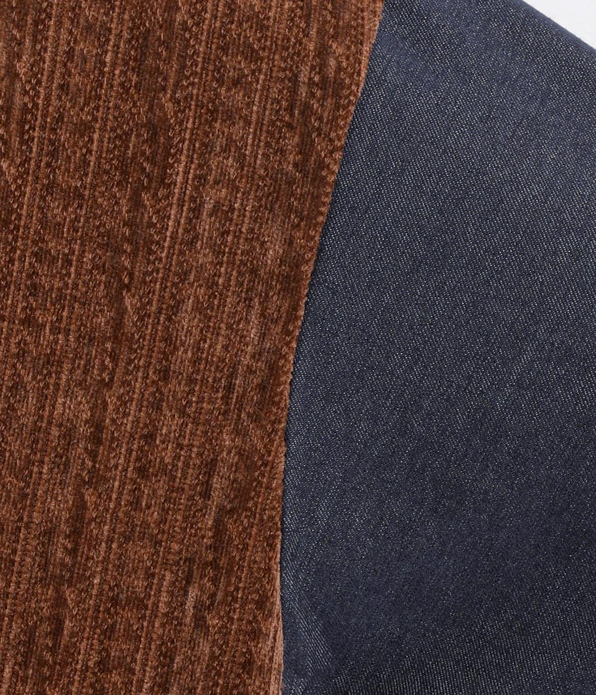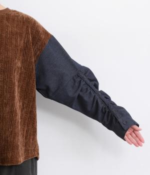 身頃はナチュラルなケーブル編み、袖はデニムの異素材で切り替え、一枚でレイヤードしたような奥行きを演出しました。ボタンを添えた袖のギャザーが自然なドレープを生み出し、女性らしいやわらかなシルエットに。ゆったりとしたサイズ感で着心地も◎。着るだけでコーディネートの主役になる一枚です。