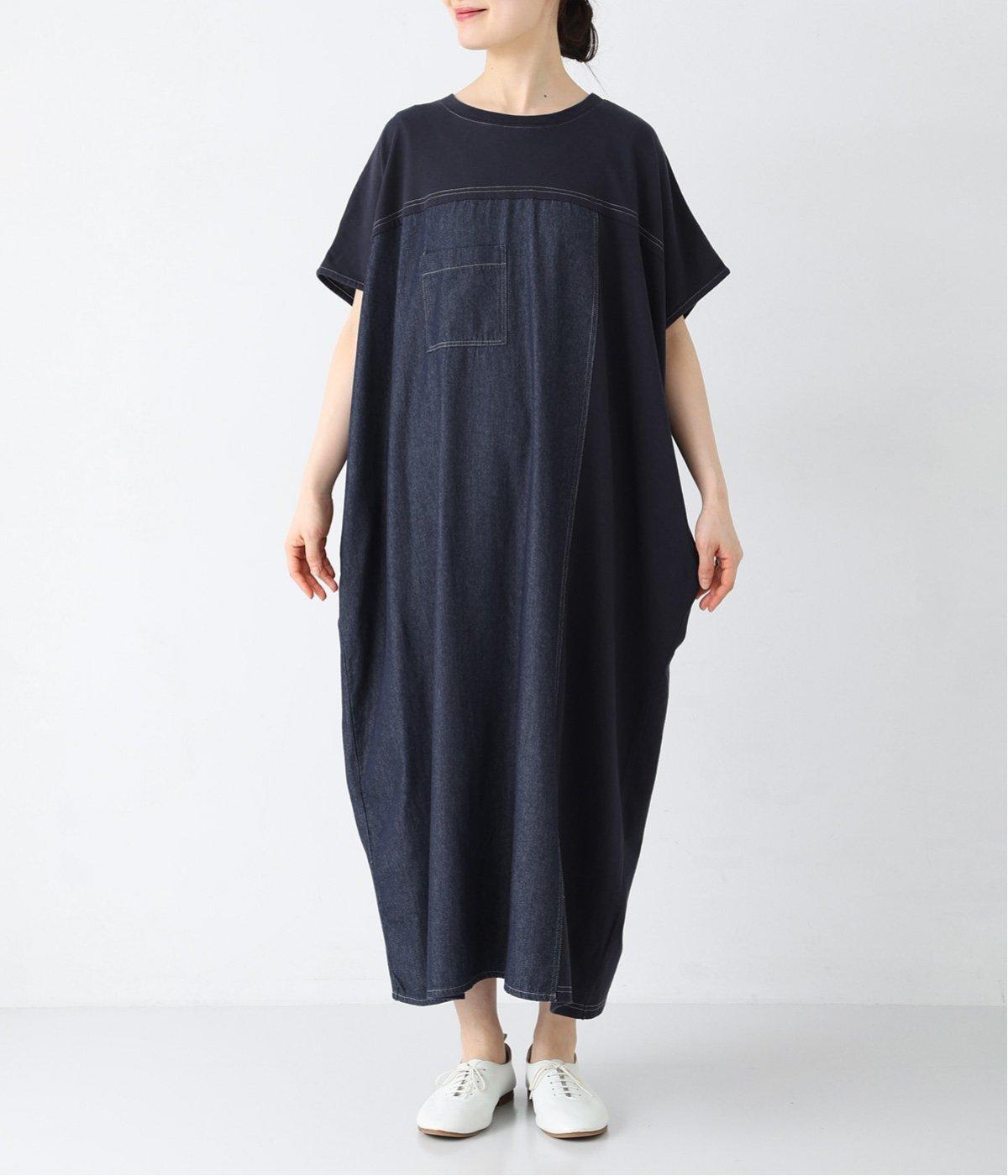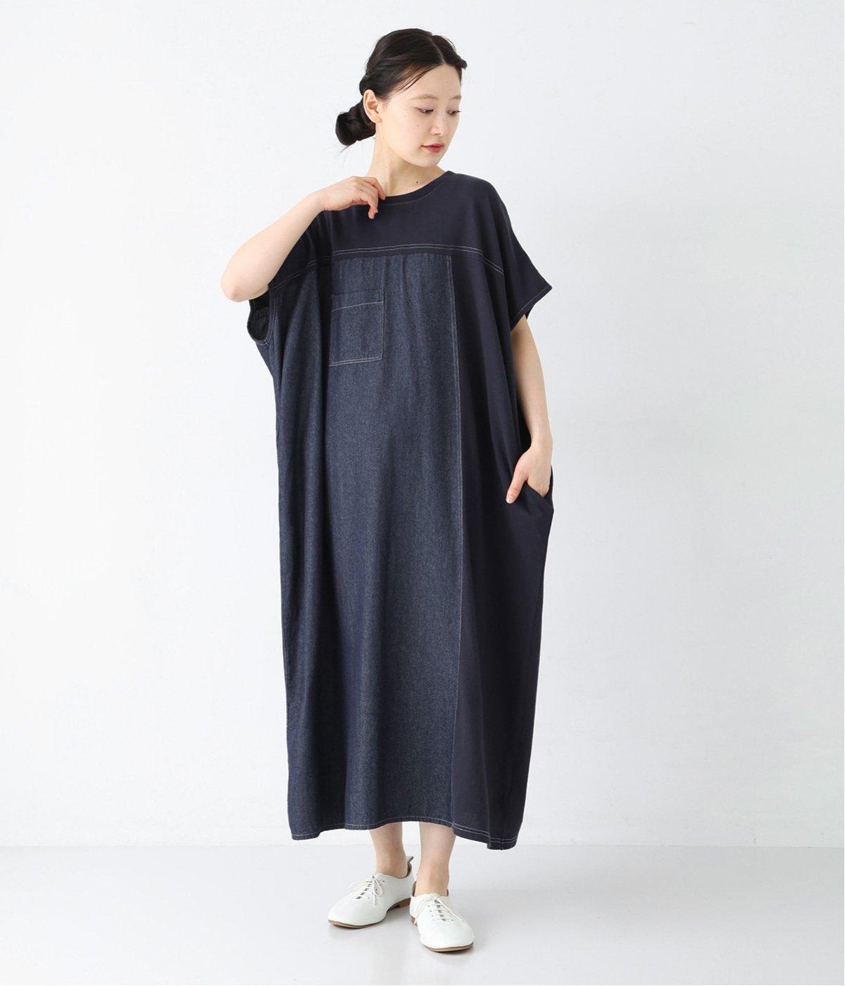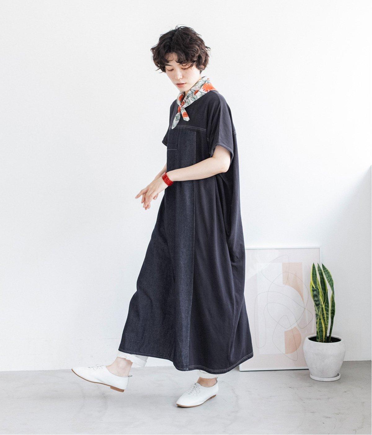 パッチワークワンピースのインディゴは、白いパンツを合わせた爽やかなスタイリング。カジュアルな印象も落ち着いた色合いのネイビーで、大人らしく着ていただけます。