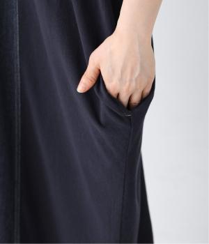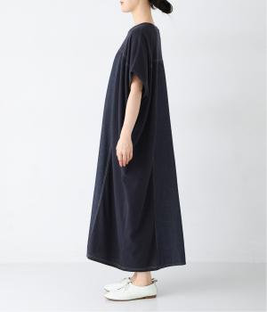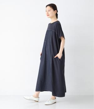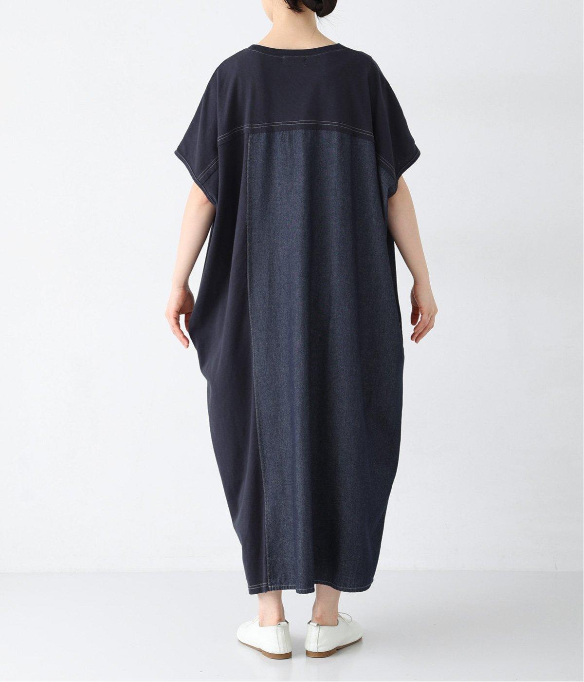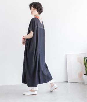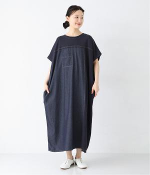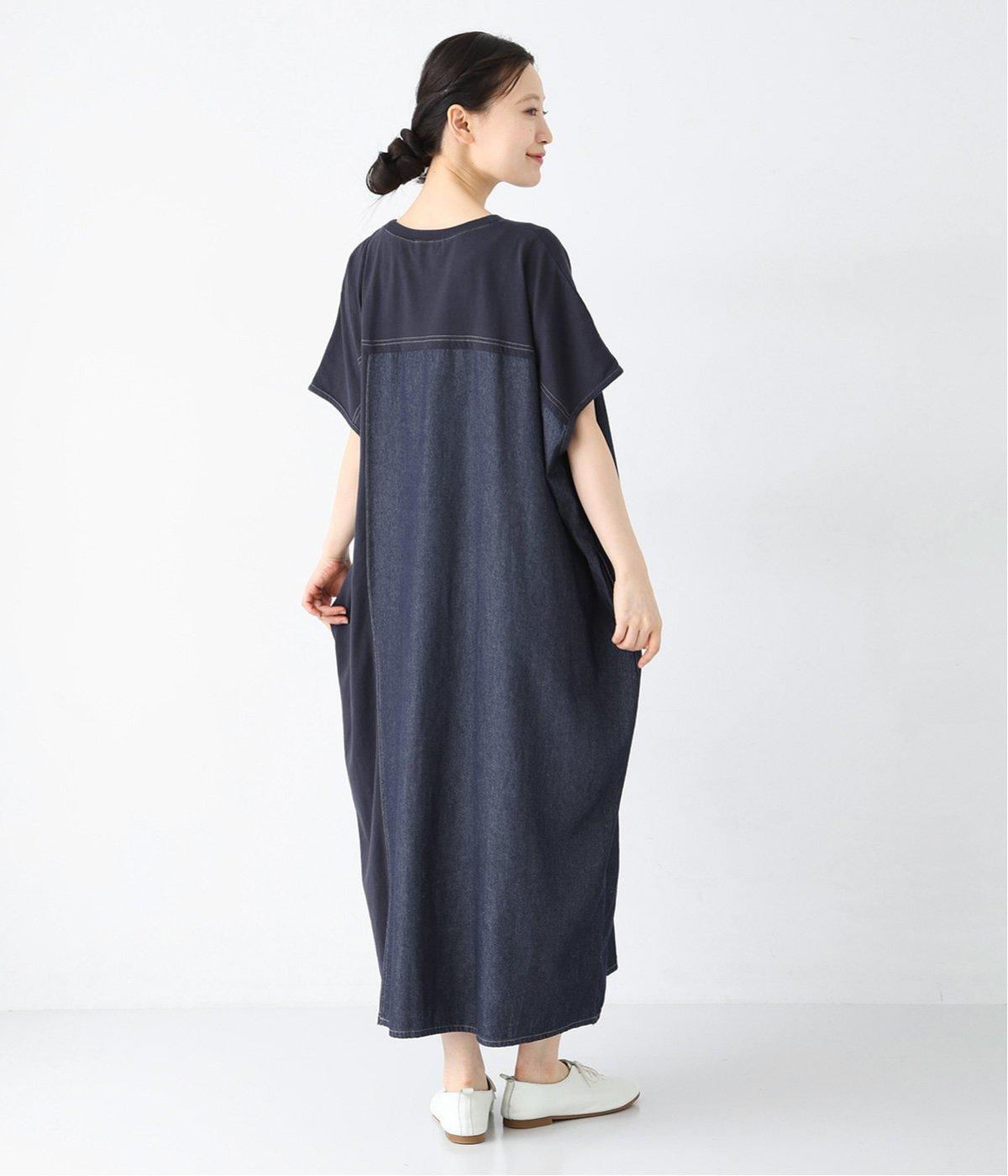 パッチワークワンピースのインディゴは、白いパンツを合わせた爽やかなスタイリング。カジュアルな印象も落ち着いた色合いのネイビーで、大人らしく着ていただけます。