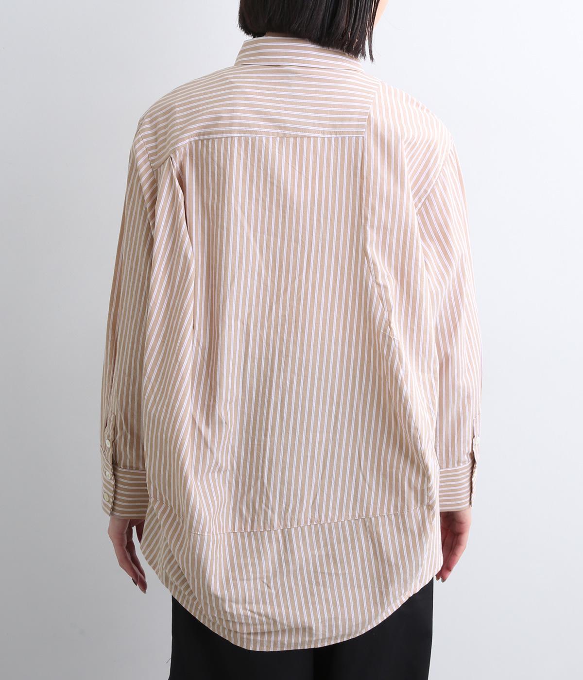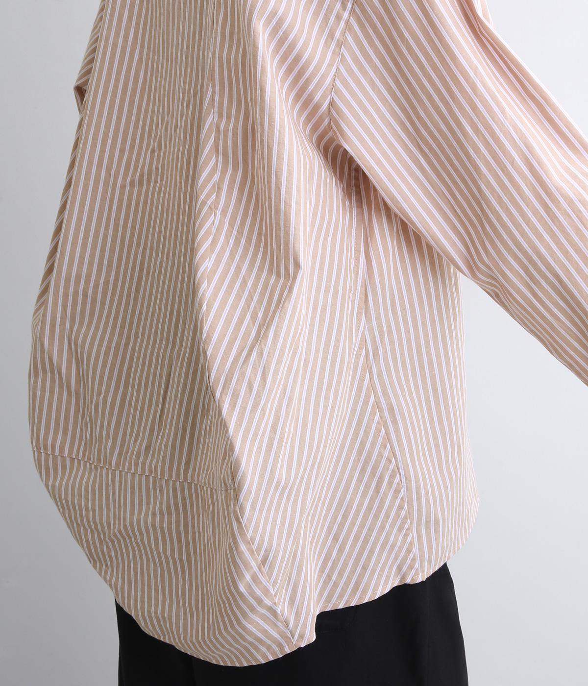 フロントにはアシンメトリー切り替え、バックスタイルは球体上のシルエットになるように制作されたパターンワークが特徴的なシャツです。長めの後ろ裾が自然とヒップをカバー。ラフに羽織って合わせるのもおすすめです。