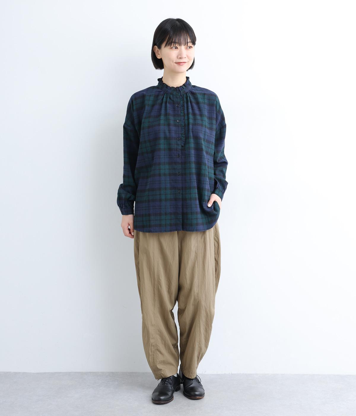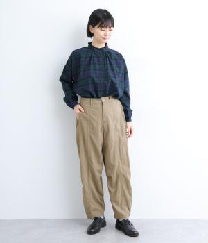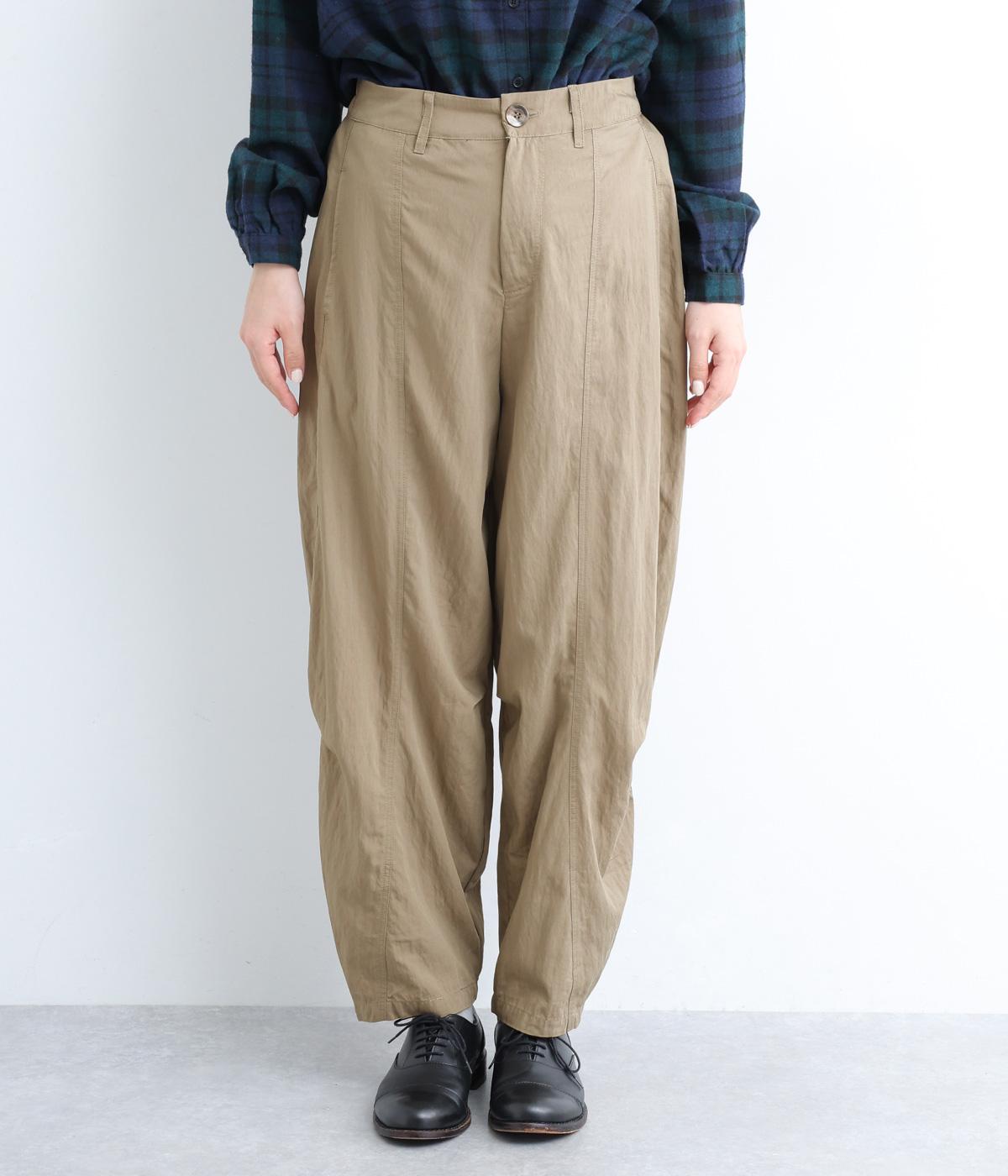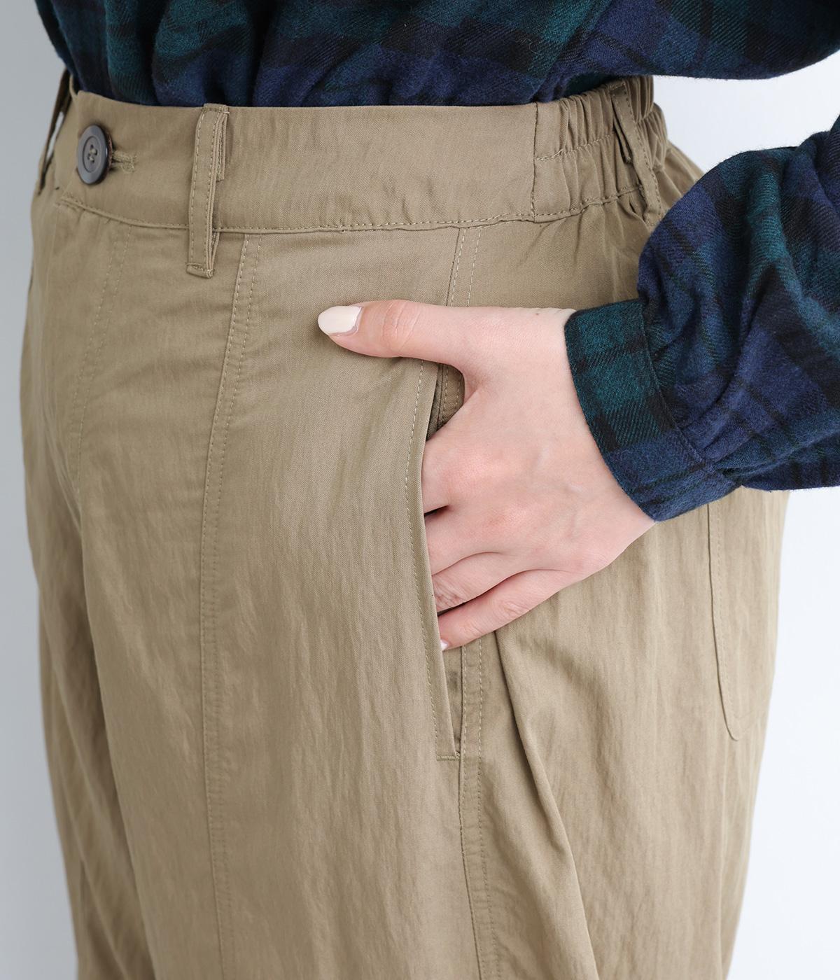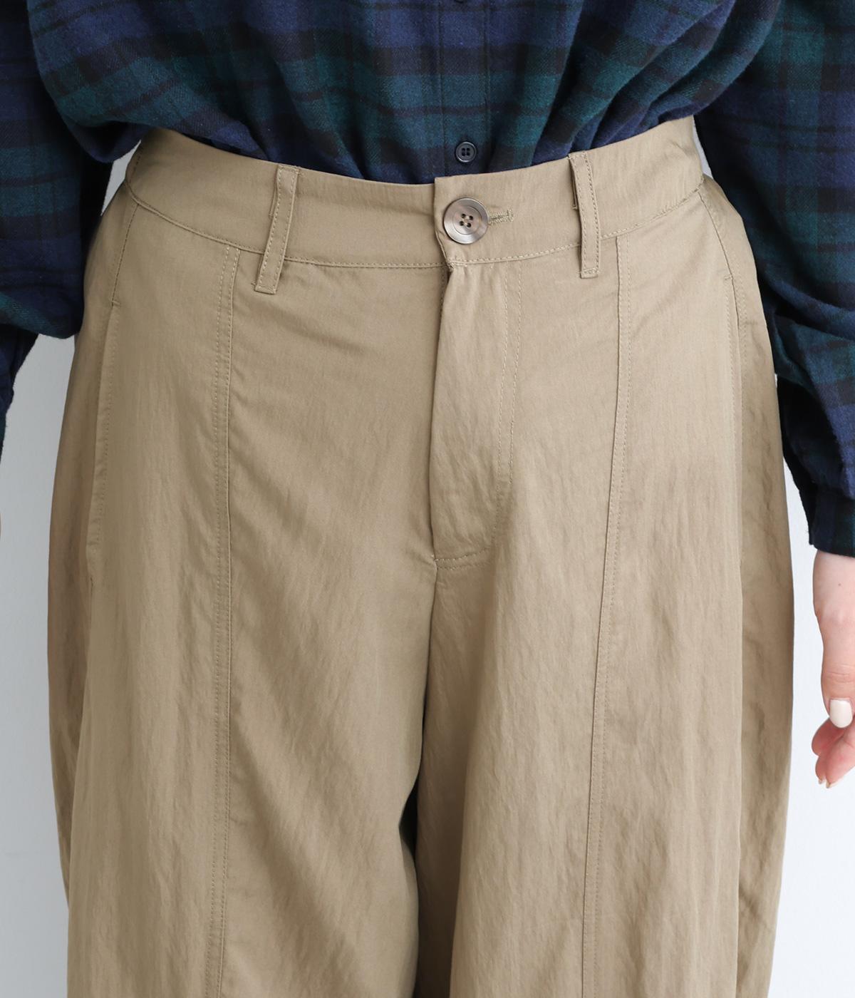 タテに切り替えを入れてすっきり感を高めたパンツは、ひざ部分にタックを入れて自然な立体感をつけました。シューズ合わせがたのしめる丈感で、合わせるトップスも選ばない万能な一本。フロントファスナーで脱ぎはきしやすく、後ろゴムでフィット感も◎。