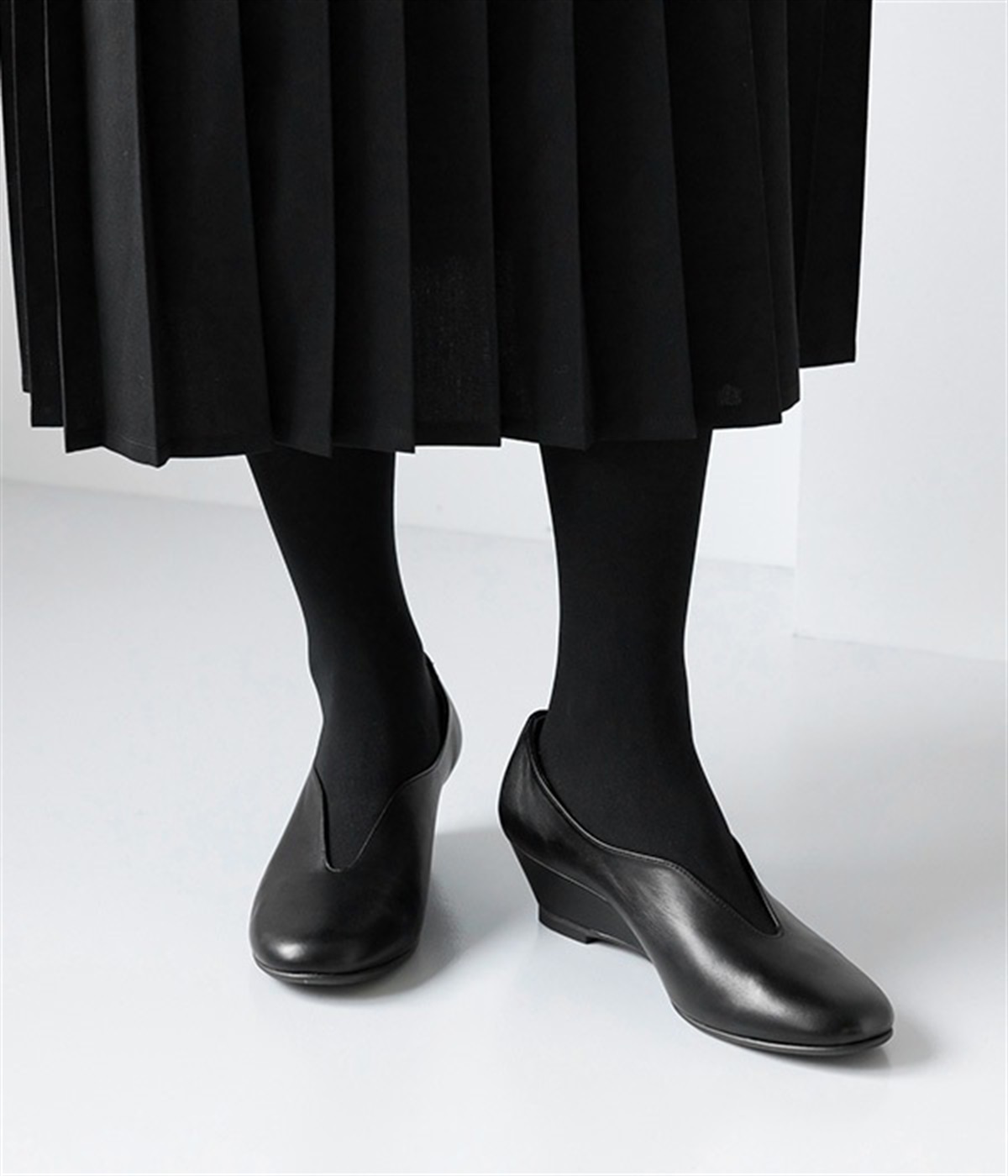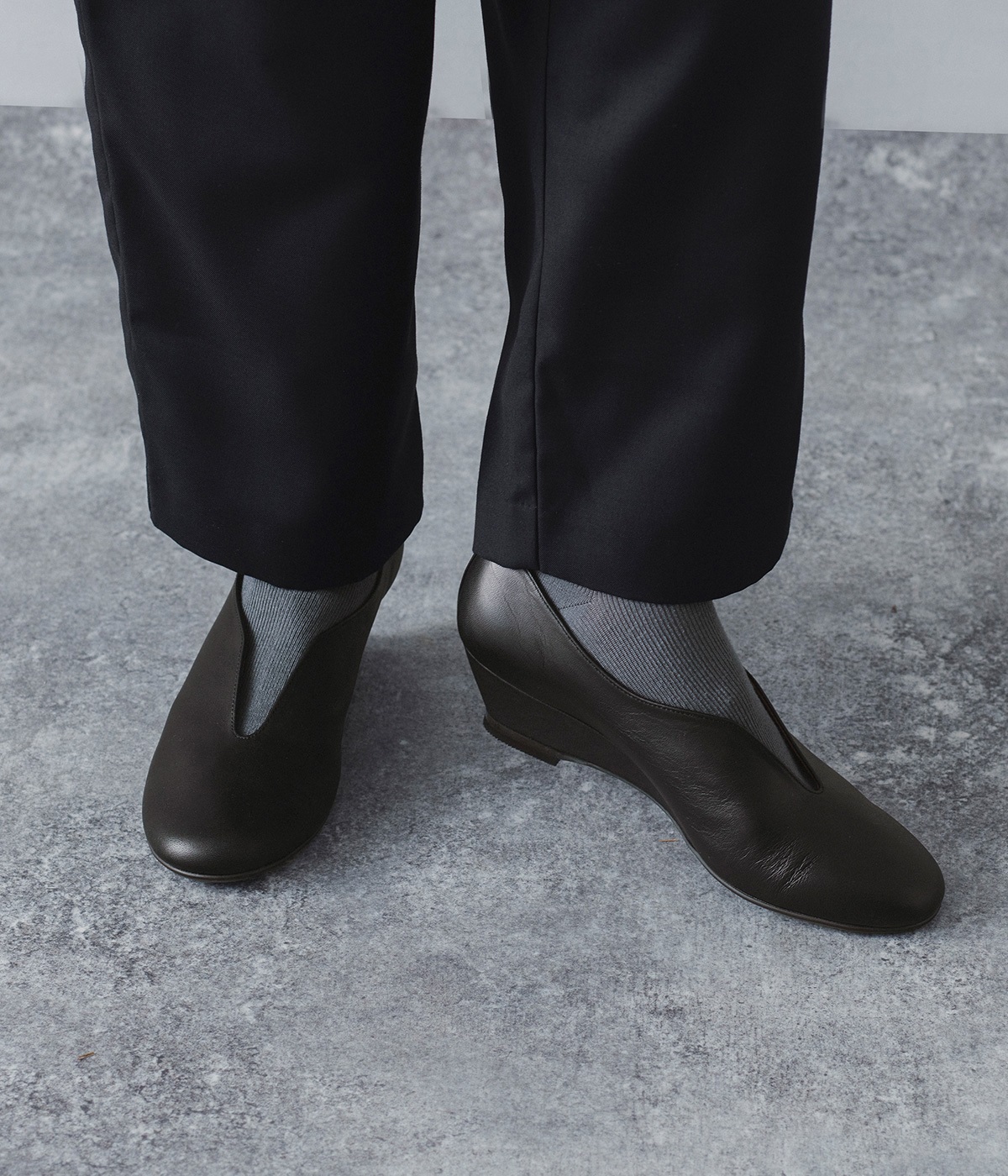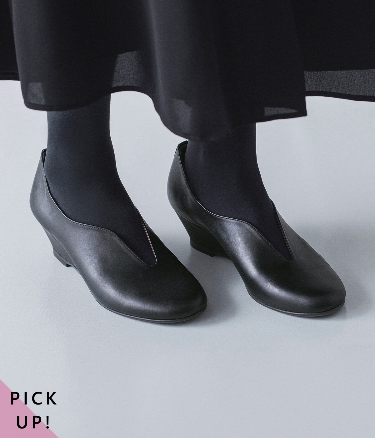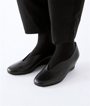 流れるような曲線が、エレガントな佇まい。安定感のあるウェッジソールに、やわらかな天然皮革とクッション性に優れたインソールを組み合わせ、見た目だけでなく履き心地も抜群です。