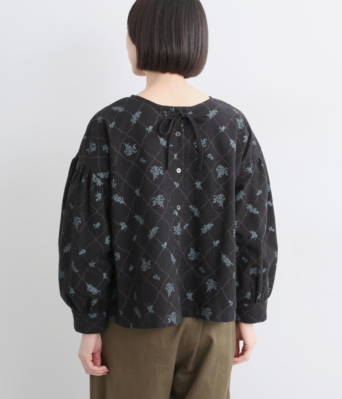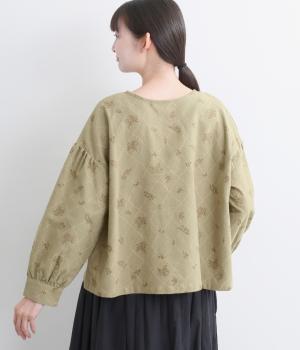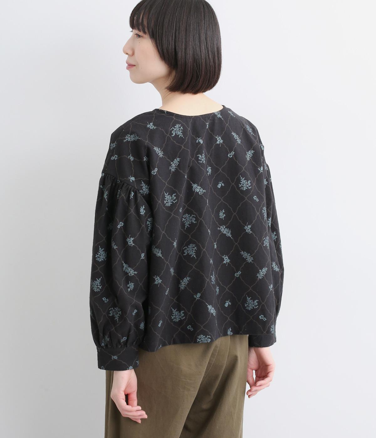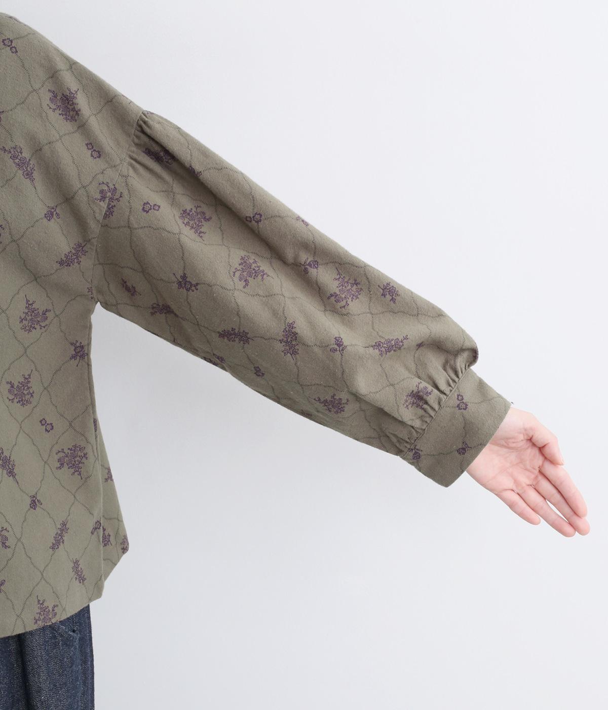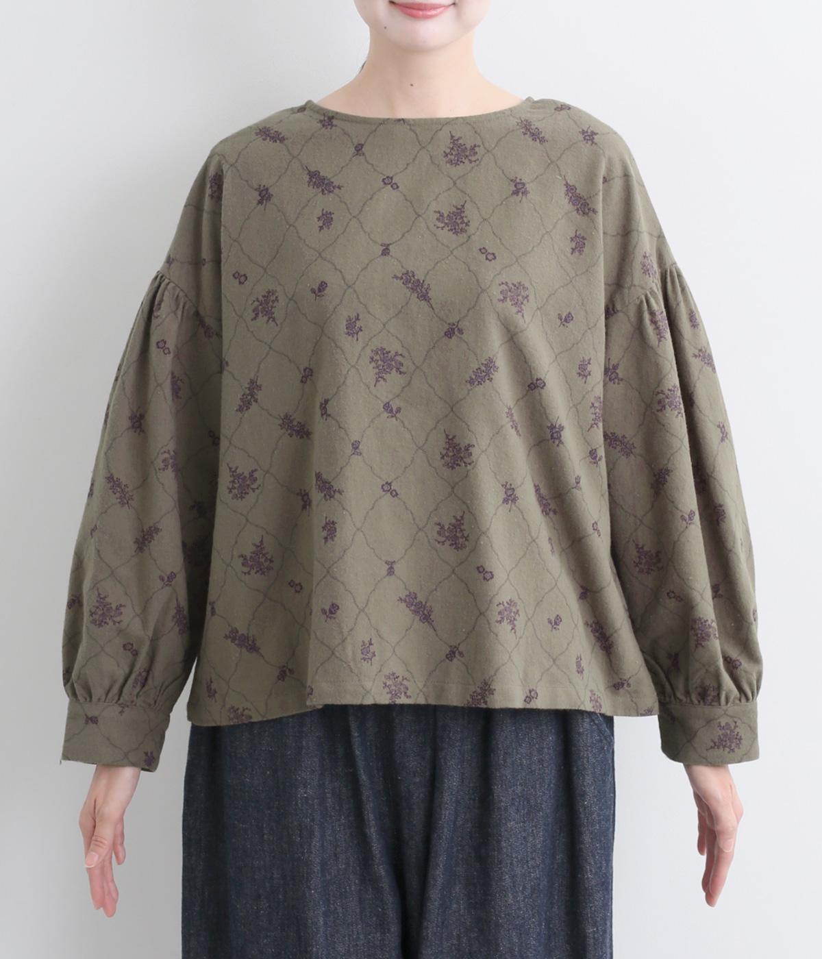 前後で着用できる2way仕様のブラウスです。レトロな雰囲気の総柄プリントが落ち着いた表情に仕上げています。ギャザーをほどこし、ふんわりとした袖のシルエットが華やかさをプラス。ゆったりした身幅とほどよい丈感でさまざまなボトムスと合わせられます。