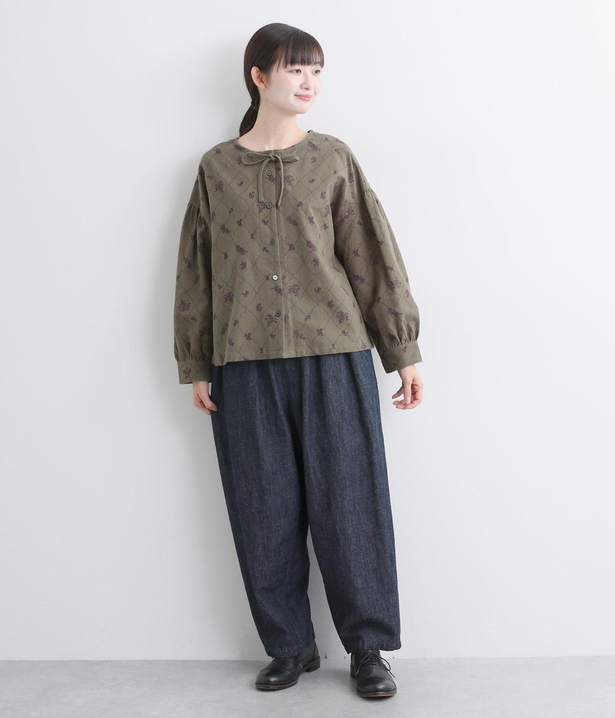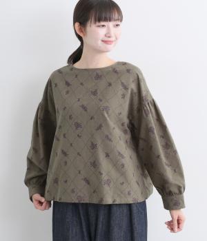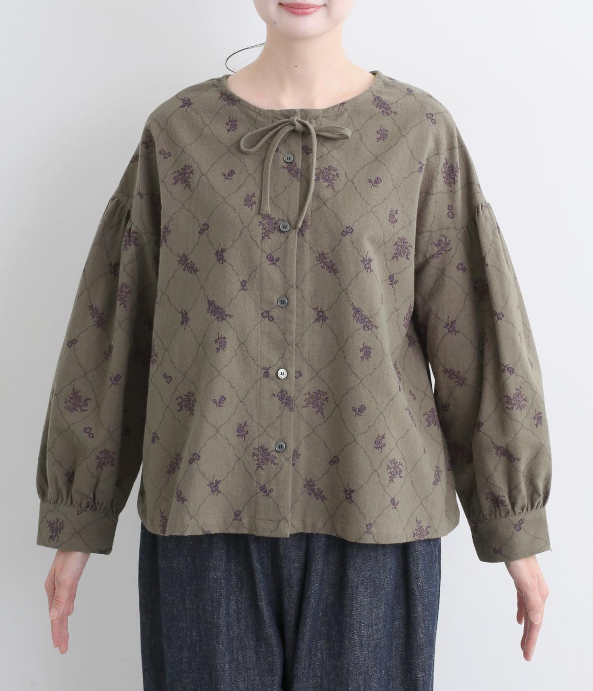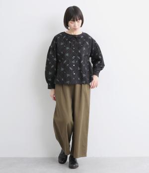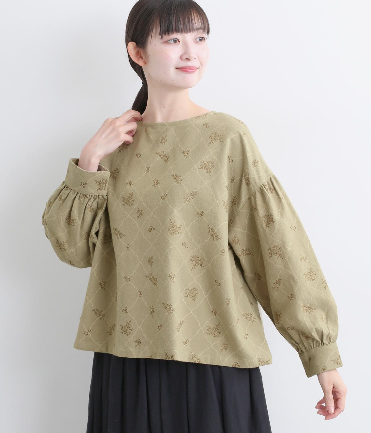 前後で着用できる2way仕様のブラウスです。レトロな雰囲気の総柄プリントが落ち着いた表情に仕上げています。ギャザーをほどこし、ふんわりとした袖のシルエットが華やかさをプラス。ゆったりした身幅とほどよい丈感でさまざまなボトムスと合わせられます。