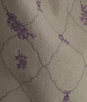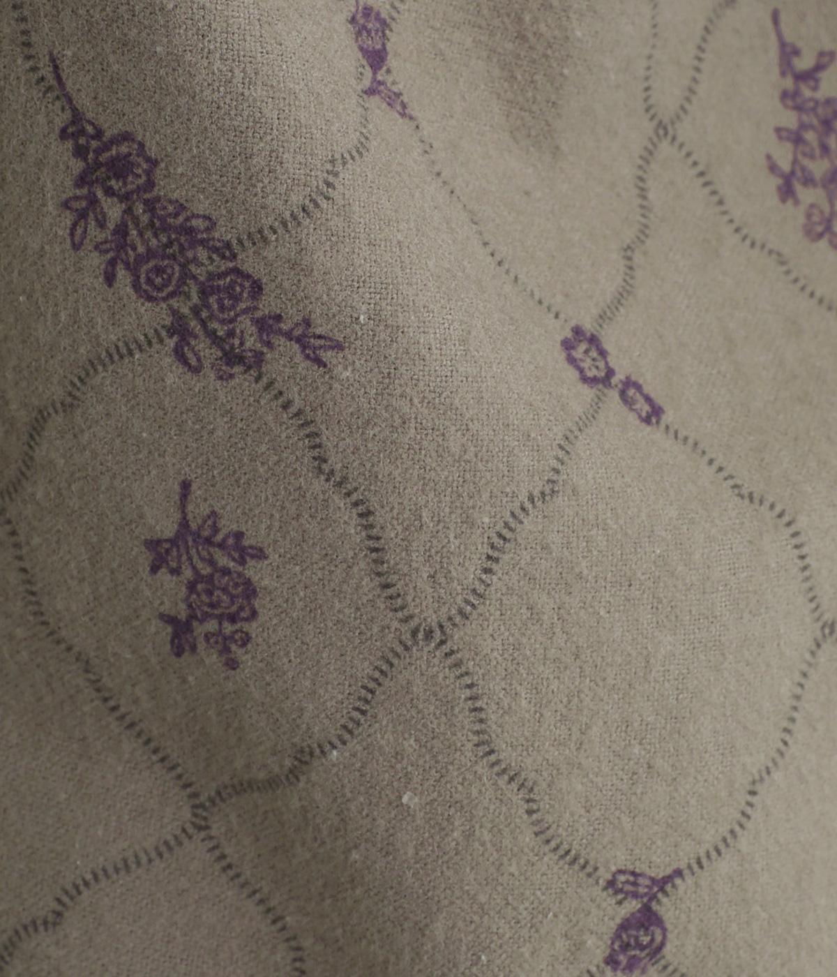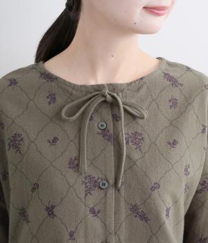 しっかりとした生地感ながら肌になじむコットン素材です。素朴で優しい風合いにシックな総柄プリントをほどこしました。ハリのある生地感がきちんと見えします。