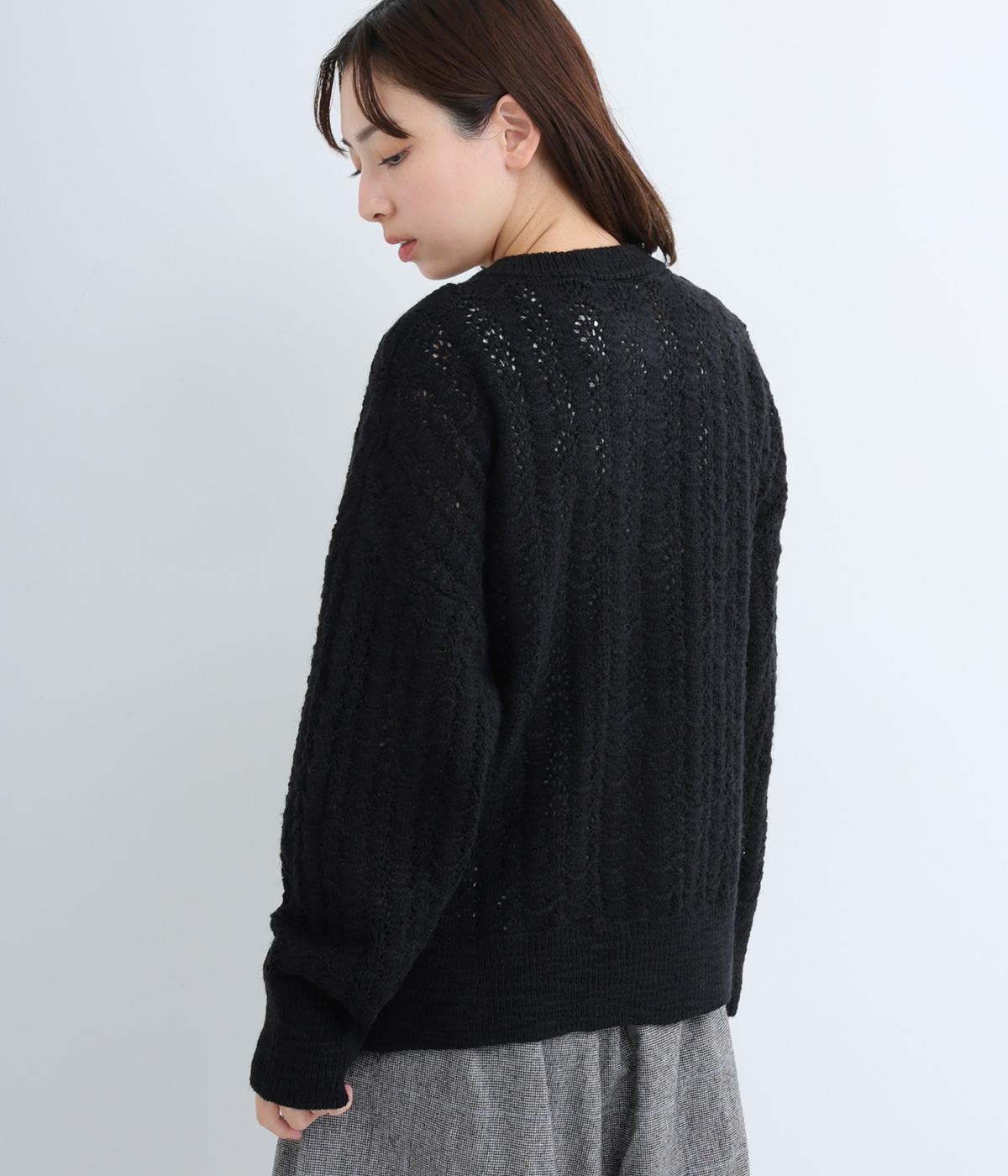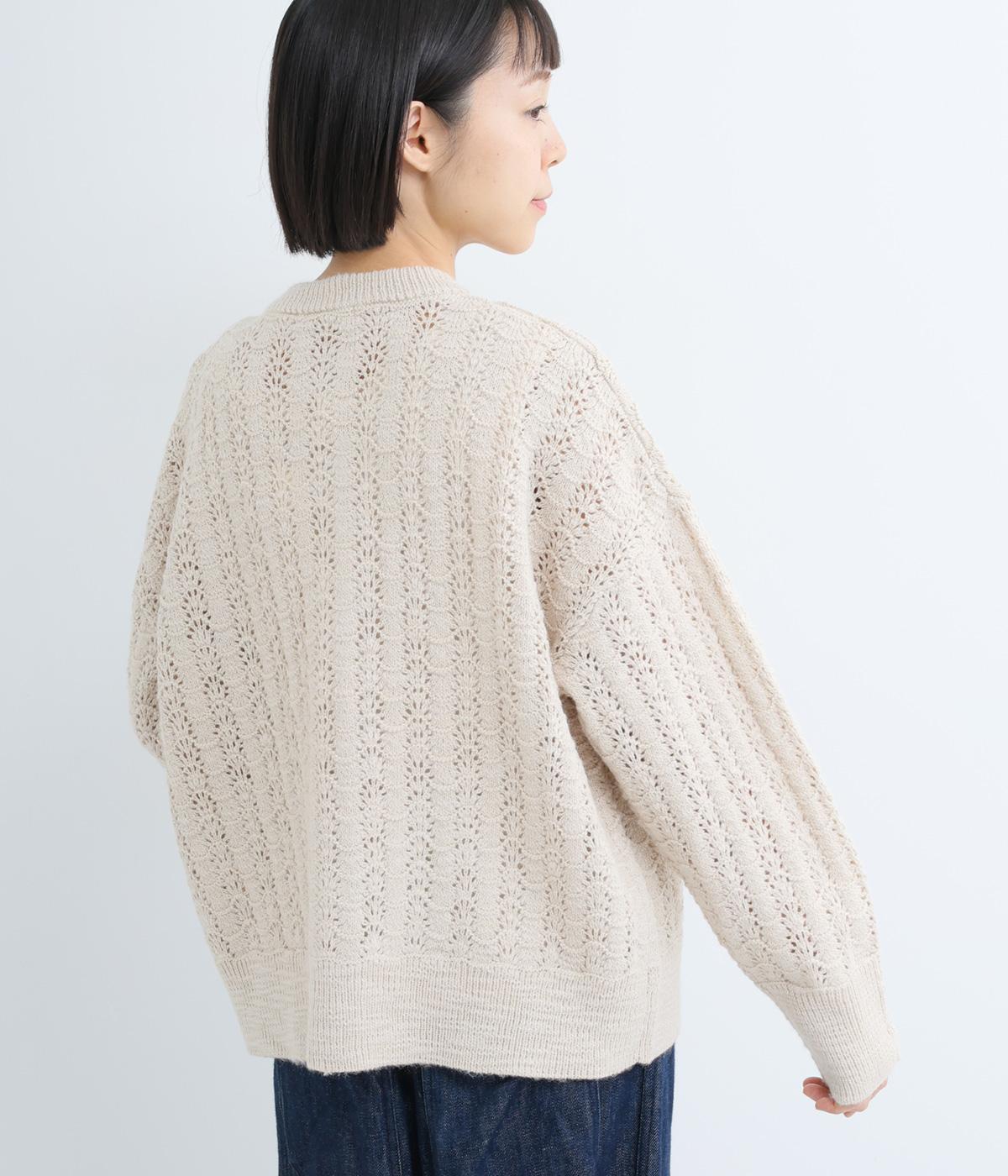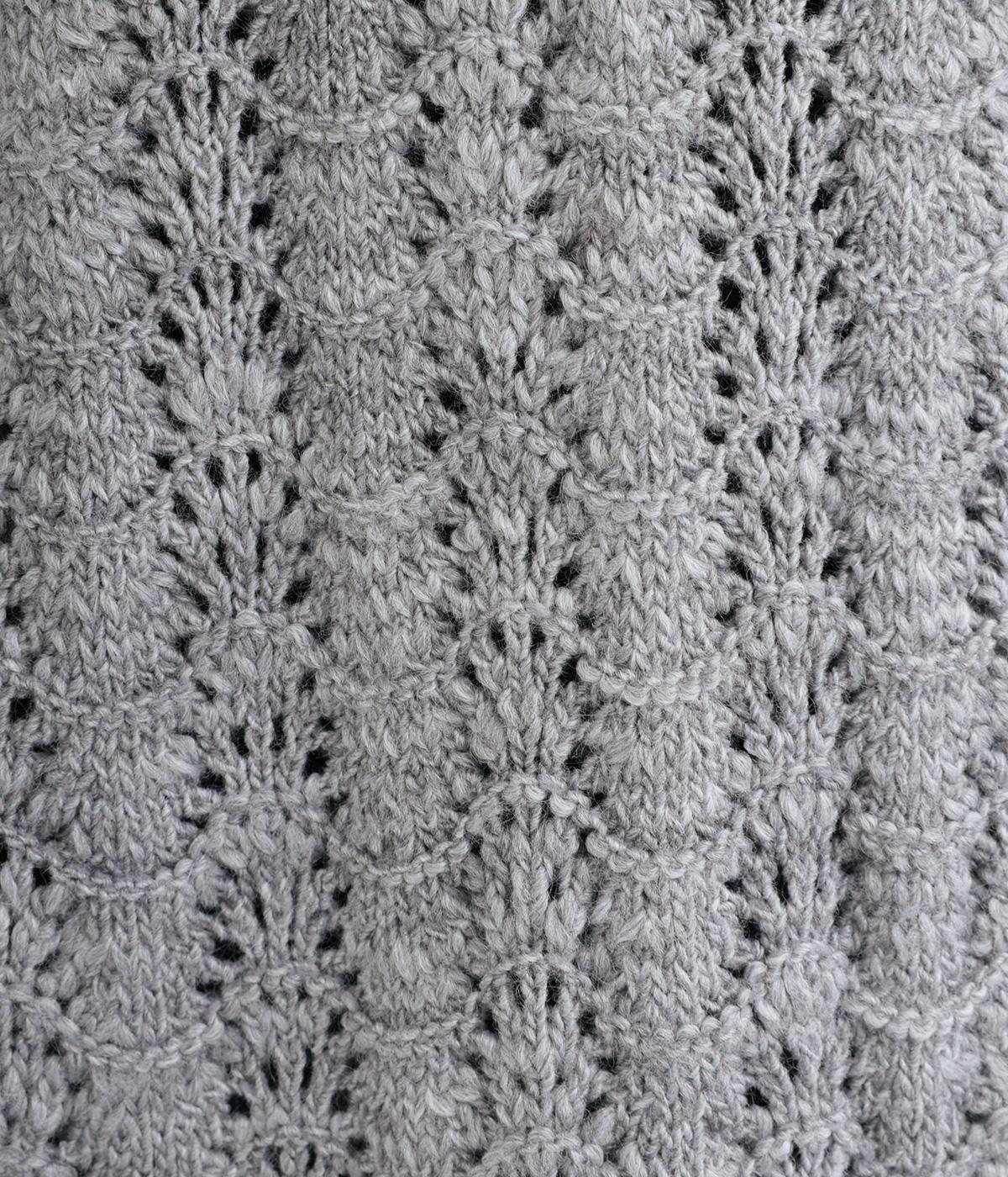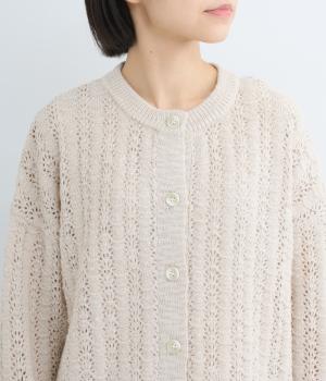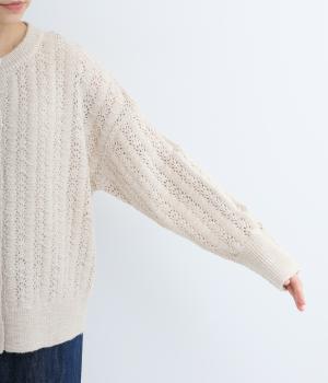 ソフトな肌ざわりが心地よいざっくり編みのニット素材。軽くて伸縮性があり、着脱しやすいのが魅力です。家庭で洗濯ができるので、気軽に着られるのも高ポイント。視覚的におもしろさのある編み方で仕上げました。