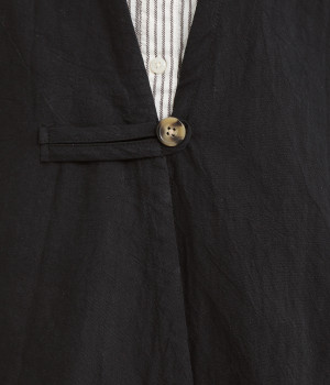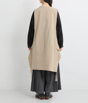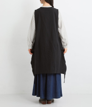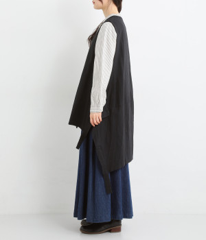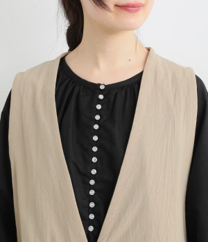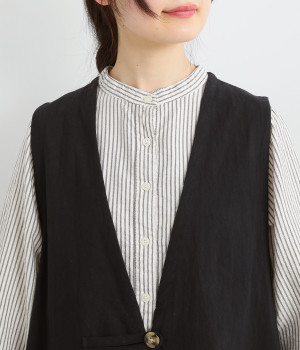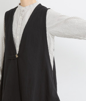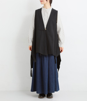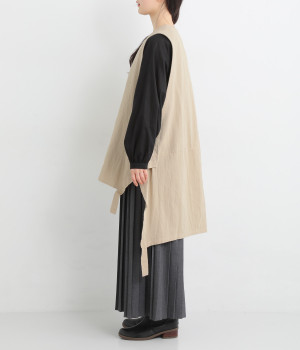 イレギュラーの裾カッティング&大胆な前後差でこなれた重ね着を楽しめるベスト。フロントはループボタンひとつのみをあしらい、開放的に着こなせます。ざっくり深く細めのVネックで首元をすっきりと。シンプルなスタイリングに加えるだけでセンスアップを狙える一枚です。