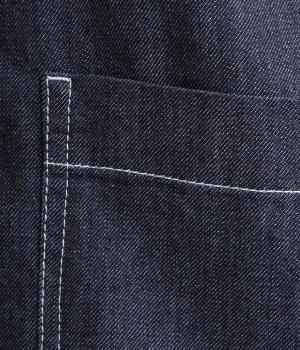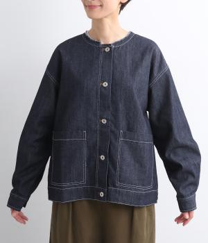 適度なハリと、ドライな肌ざわりが特徴的なコットン混紡デニム生地を使用しました。軽い羽織りものになる中肉厚生地で、ロングシーズン着まわしができます。