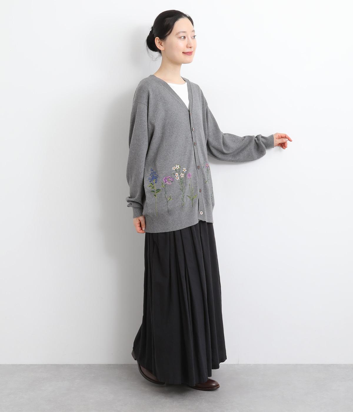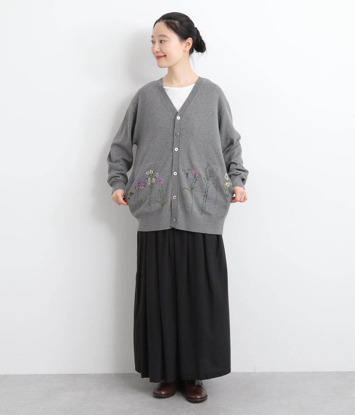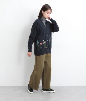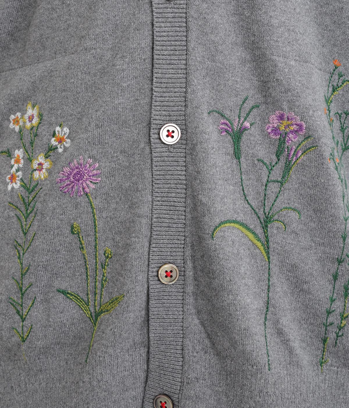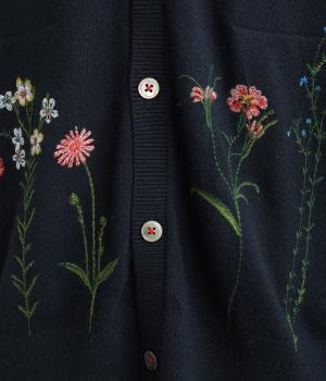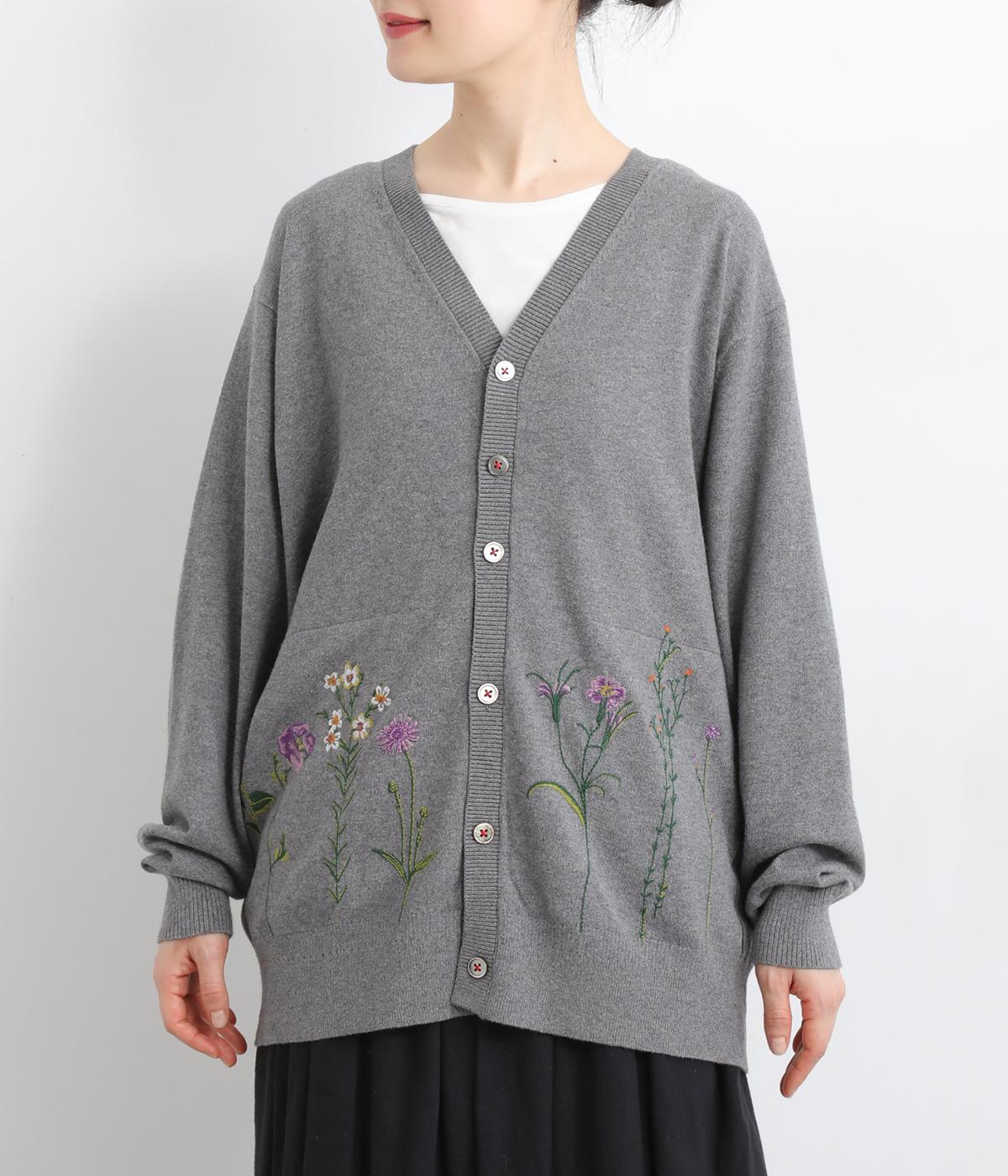スッと伸びた茎が印象的な花柄刺しゅうのカーディガンです。Vネックですっきりさせ、レイヤードスタイルも楽しめます。ボタンの付け糸を赤くして、さりげないアクセントに。コーディネートにやさしい華やかさを添える一枚です。