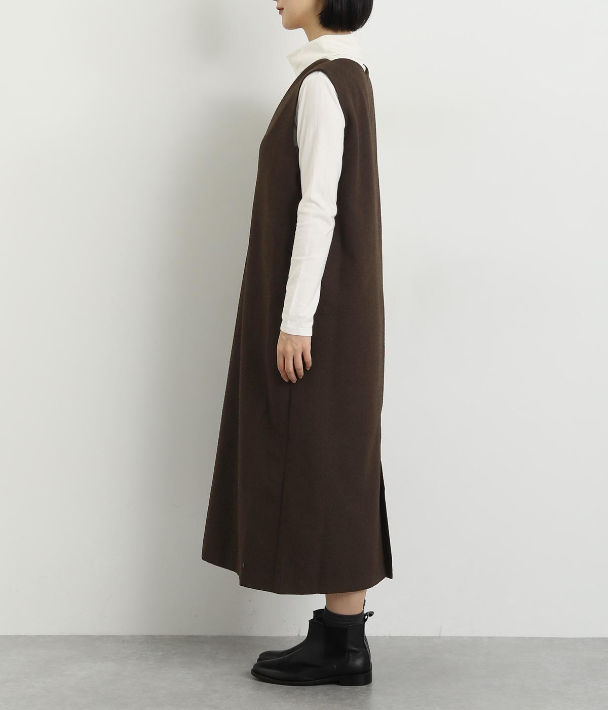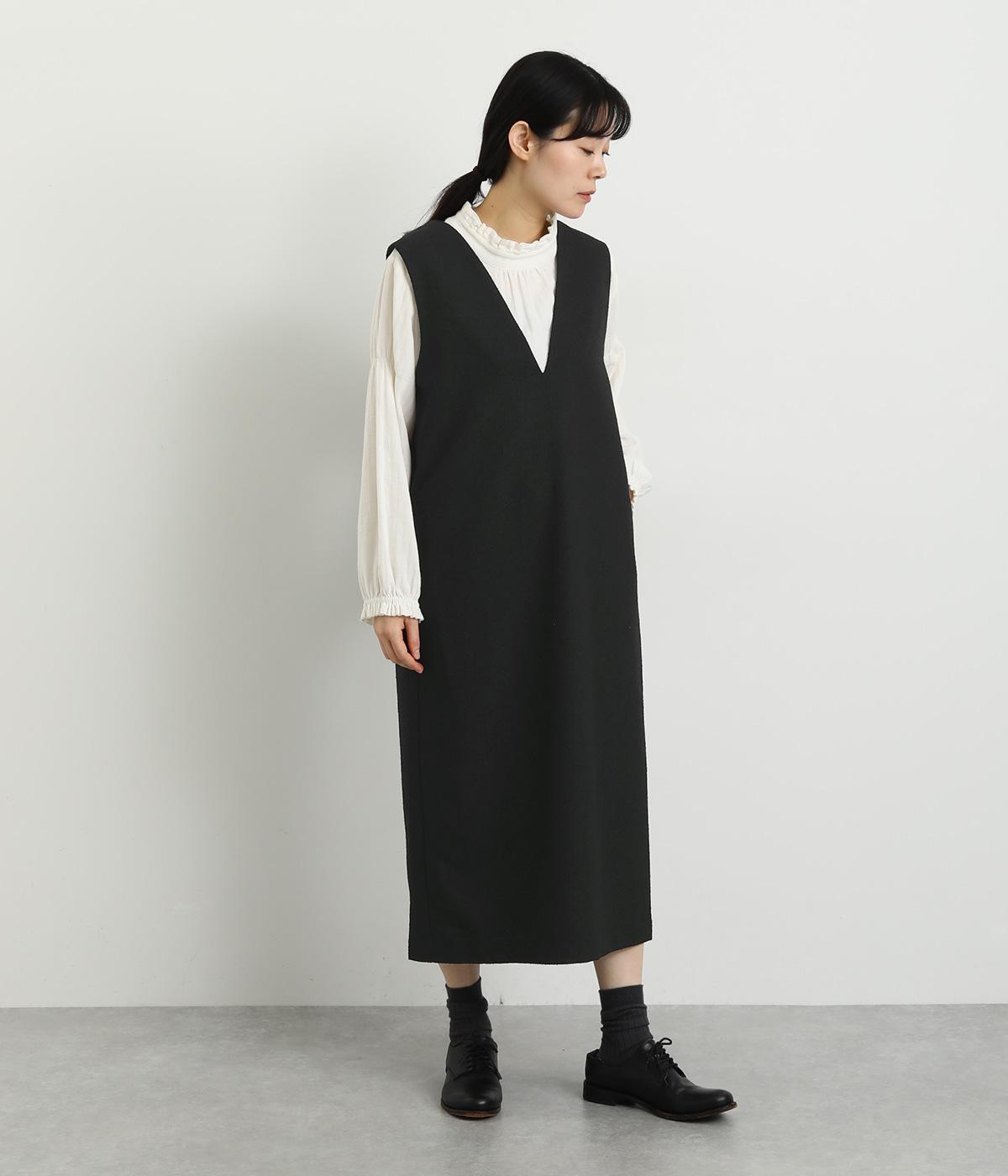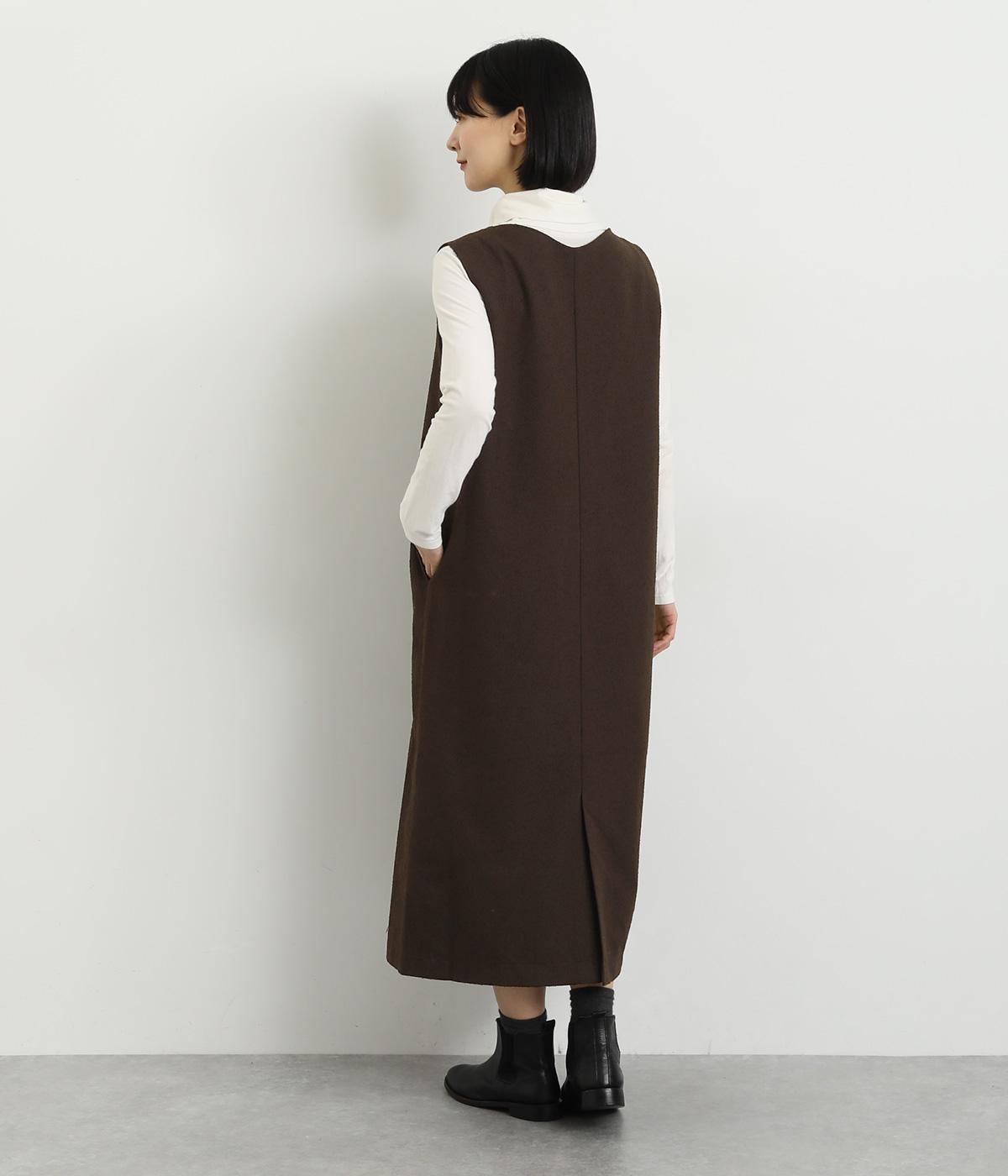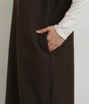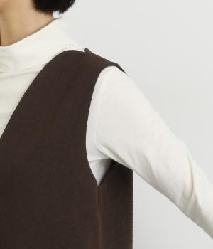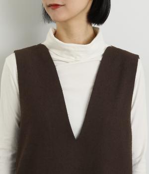 すっきりとしたタテラインに深めのVネックがシックな印象を醸します。中に合わせるトップスによってさまざまなスタイリングがたのしめそう。後ろベント入りで足さばきも快適。がばっと被るだけのイージータイプです。